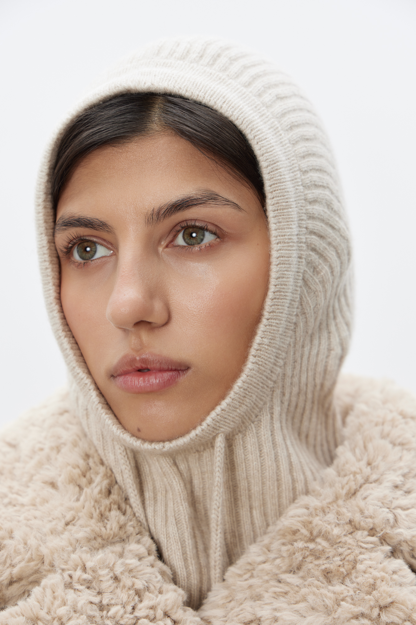 Балаклава капор из шерсти и кашемира с кулиской. Края изделия в мелкий рубчик. Дополнить образ можно перчатками и шарфом.