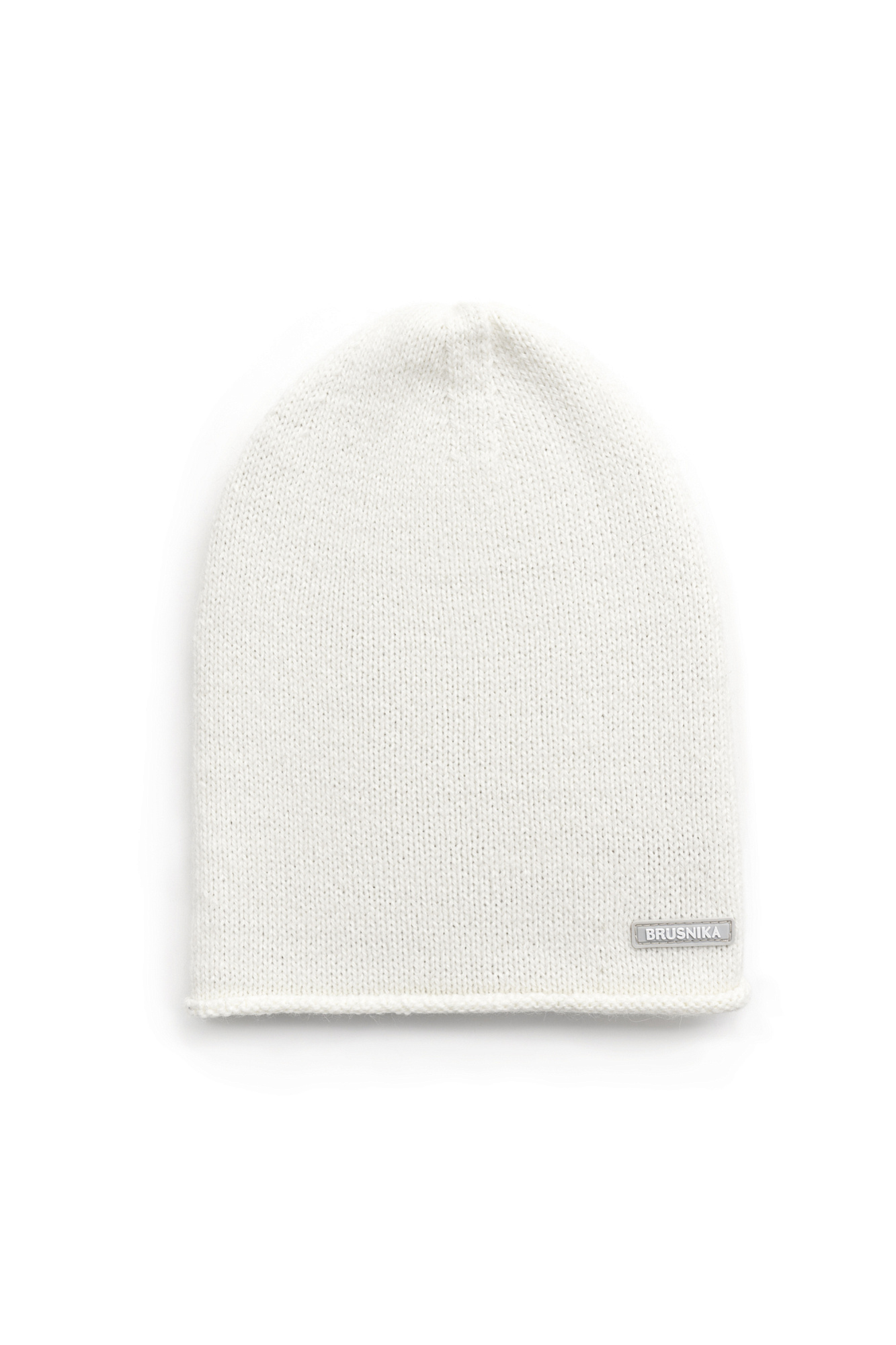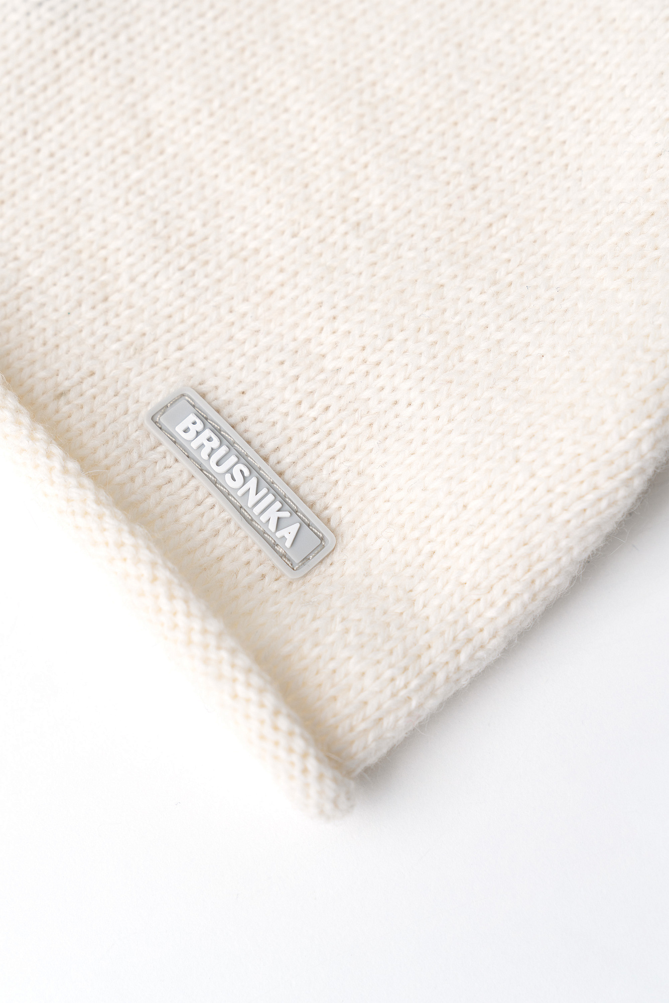 Трикотажная шапка из шерсти альпака с брендированным ярлыком и отворотом. Дополнить образ можно шарфом.