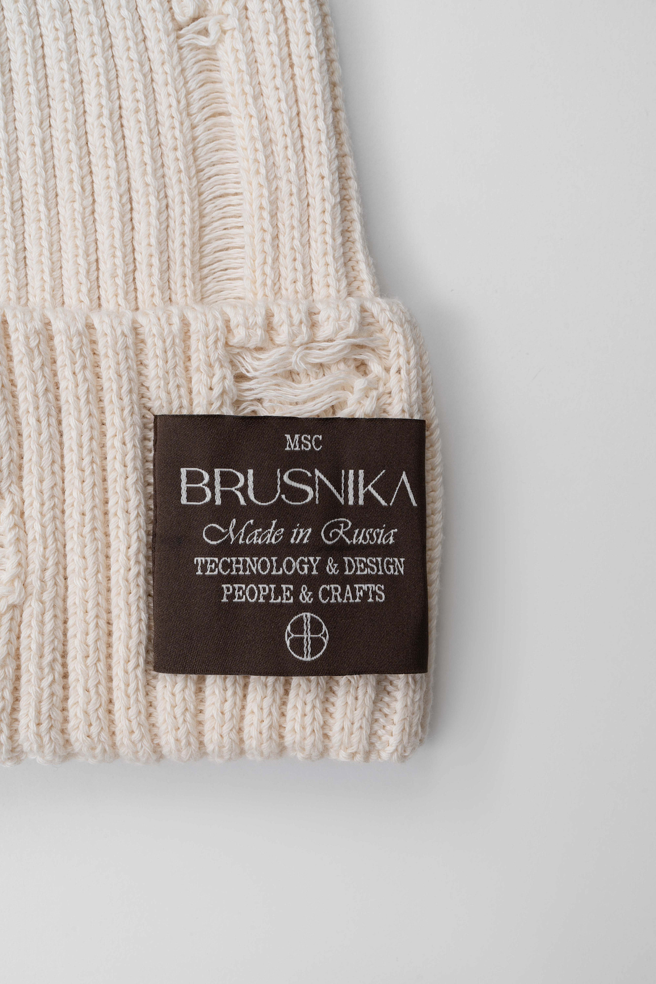 Трикотажная шапка из 100% хлопка. Модель выполнена с пропуском петель, имитируя дрань. Изделие декорировано брендированным ярлыком на отвороте.