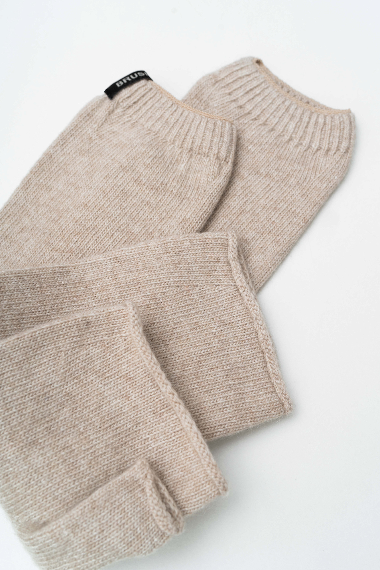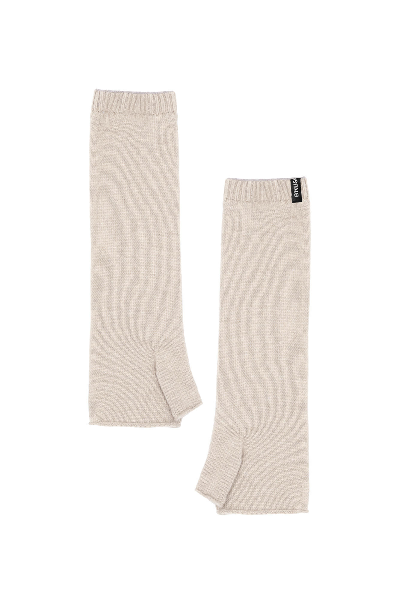 Трикотажные митенки из шерсти с добавлением кашемира. Модель с валиком по краю, эластичной резинкой в рубчик и брендированной биркой.