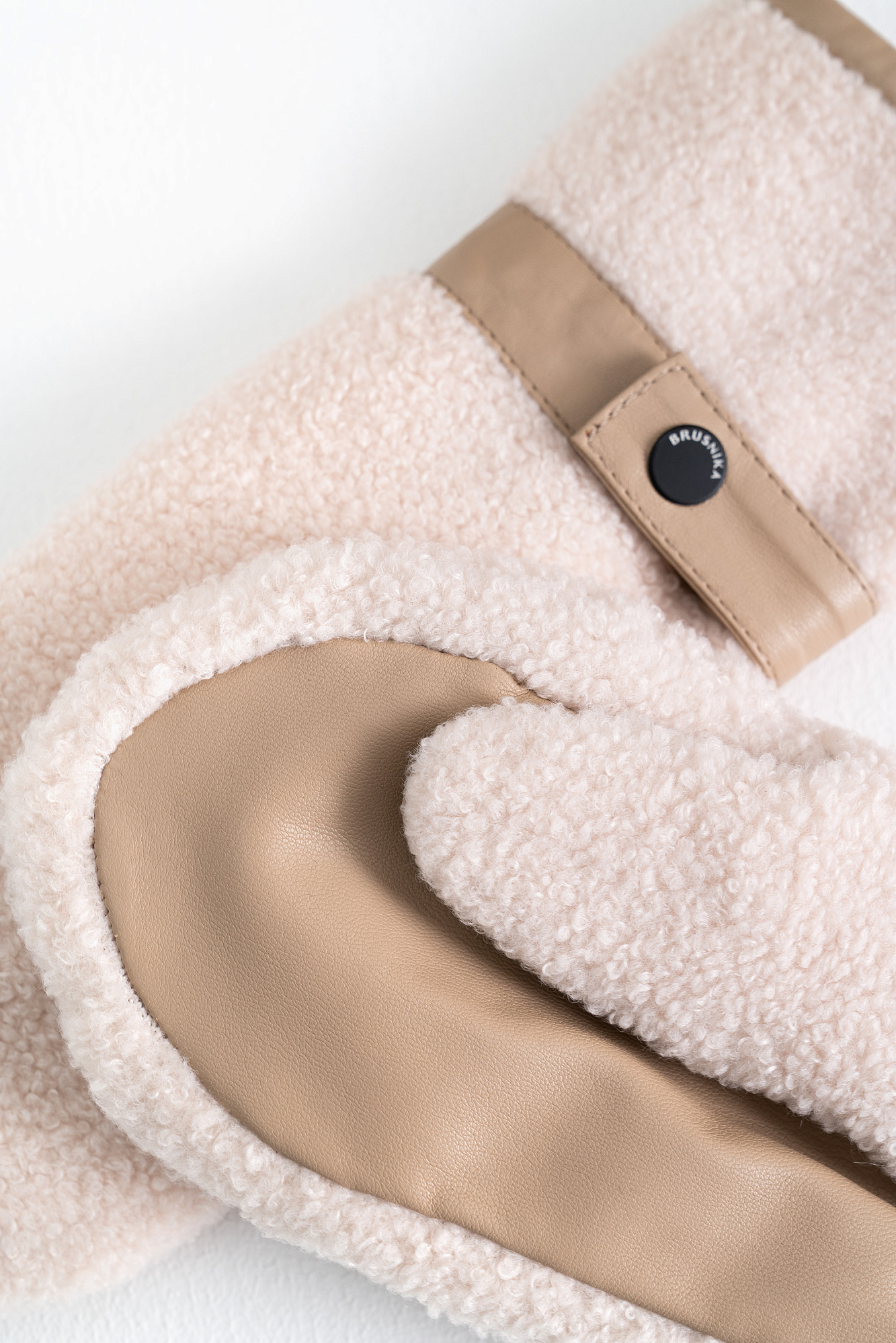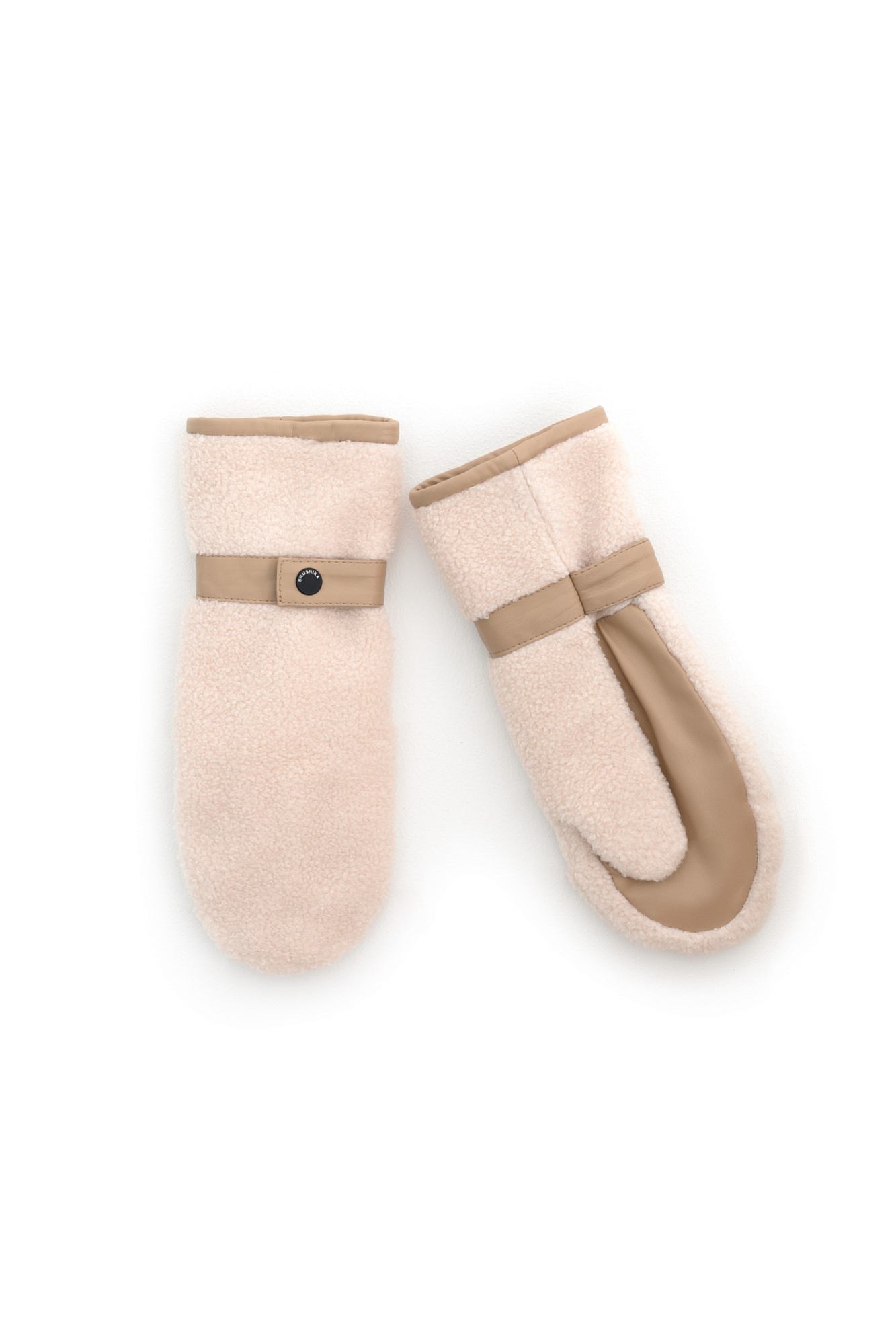 Варежки из экомеха с вставкой из экокожи и застежкой на кнопку.