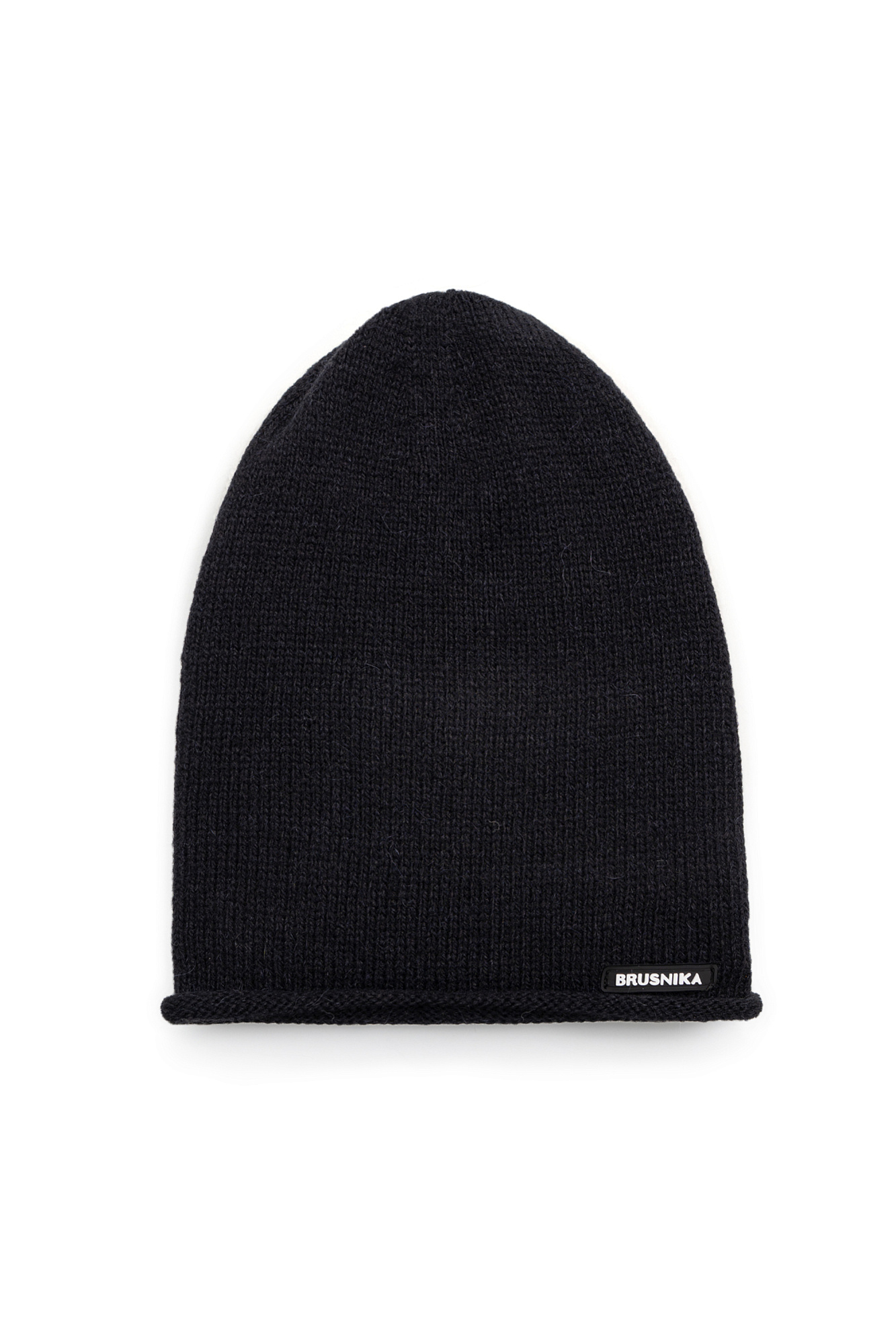 Трикотажная шапка из шерсти альпака с брендированным ярлыком и отворотом. Дополнить образ можно шарфом.