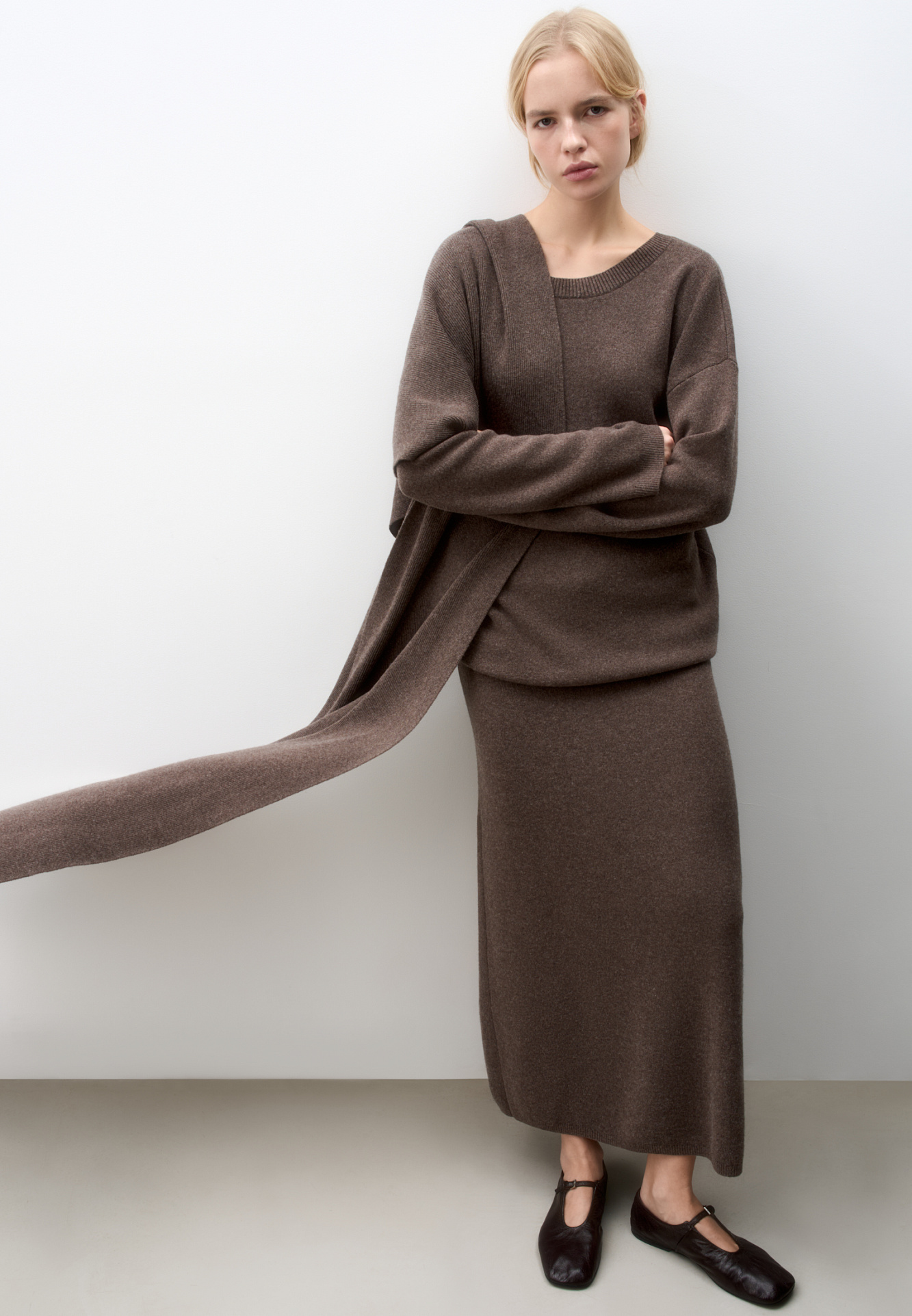 Длинный трикотажный шарф из кашемира и шерсти. Изделие выполнено в тонкий рубчик.