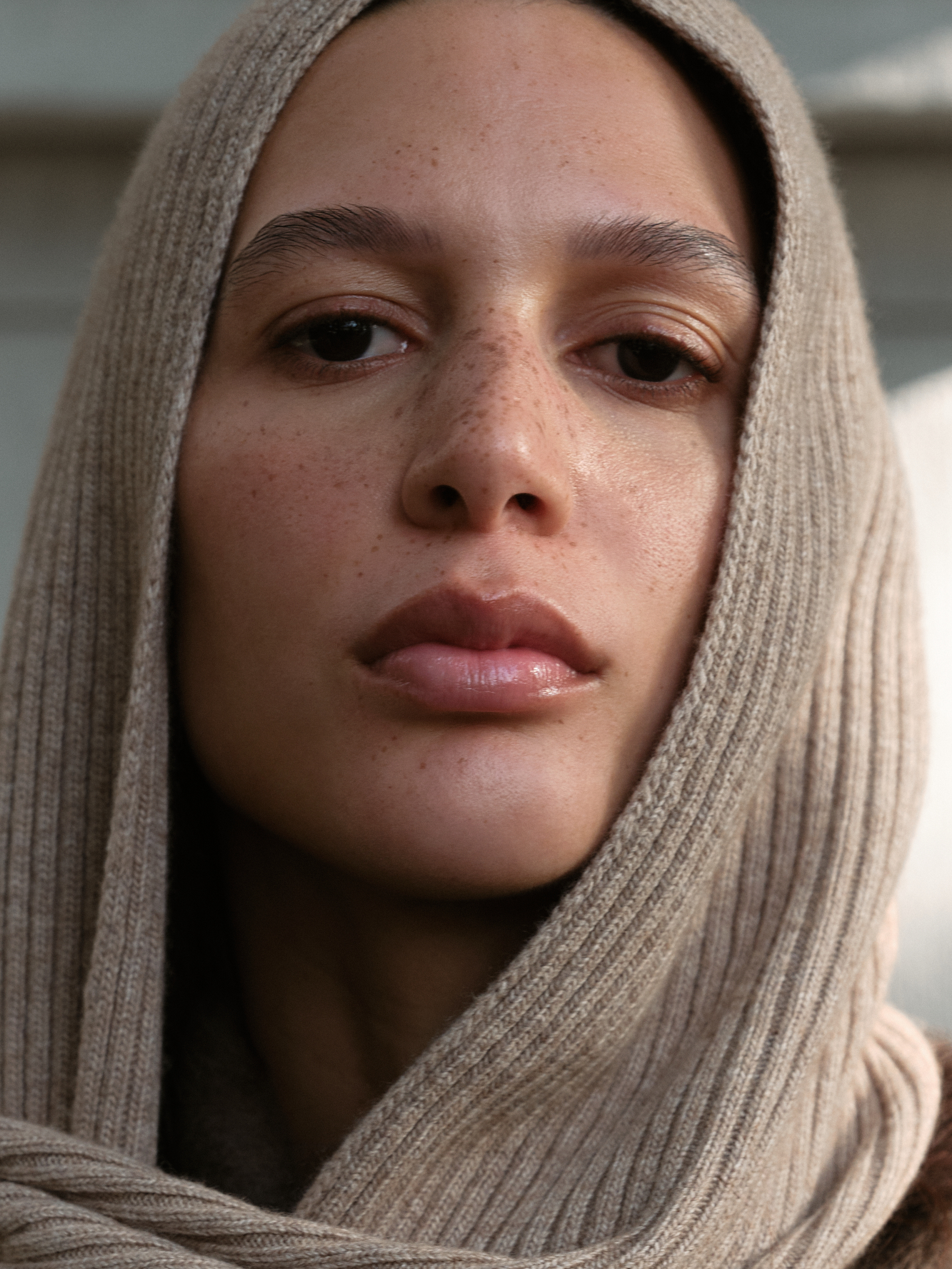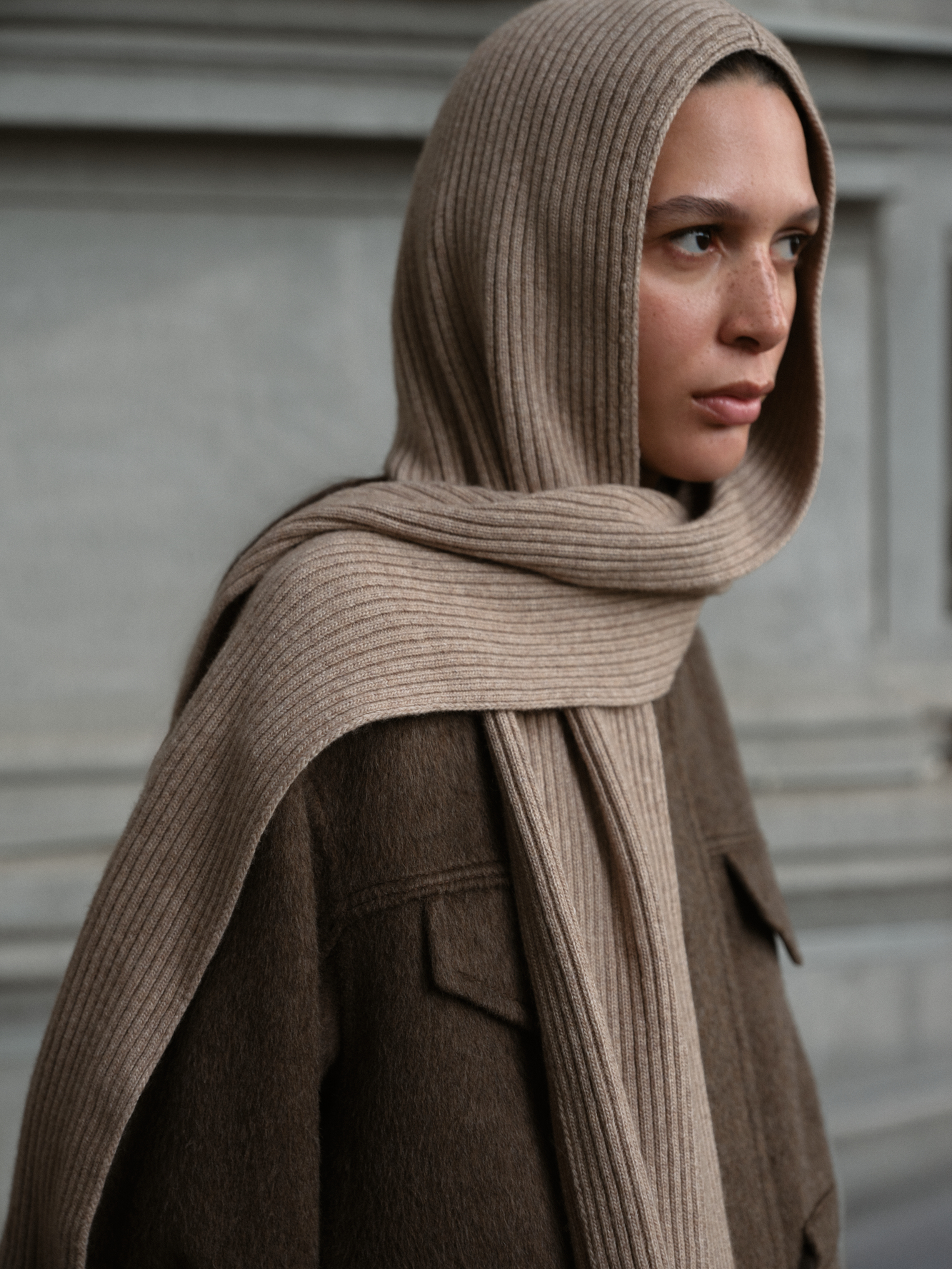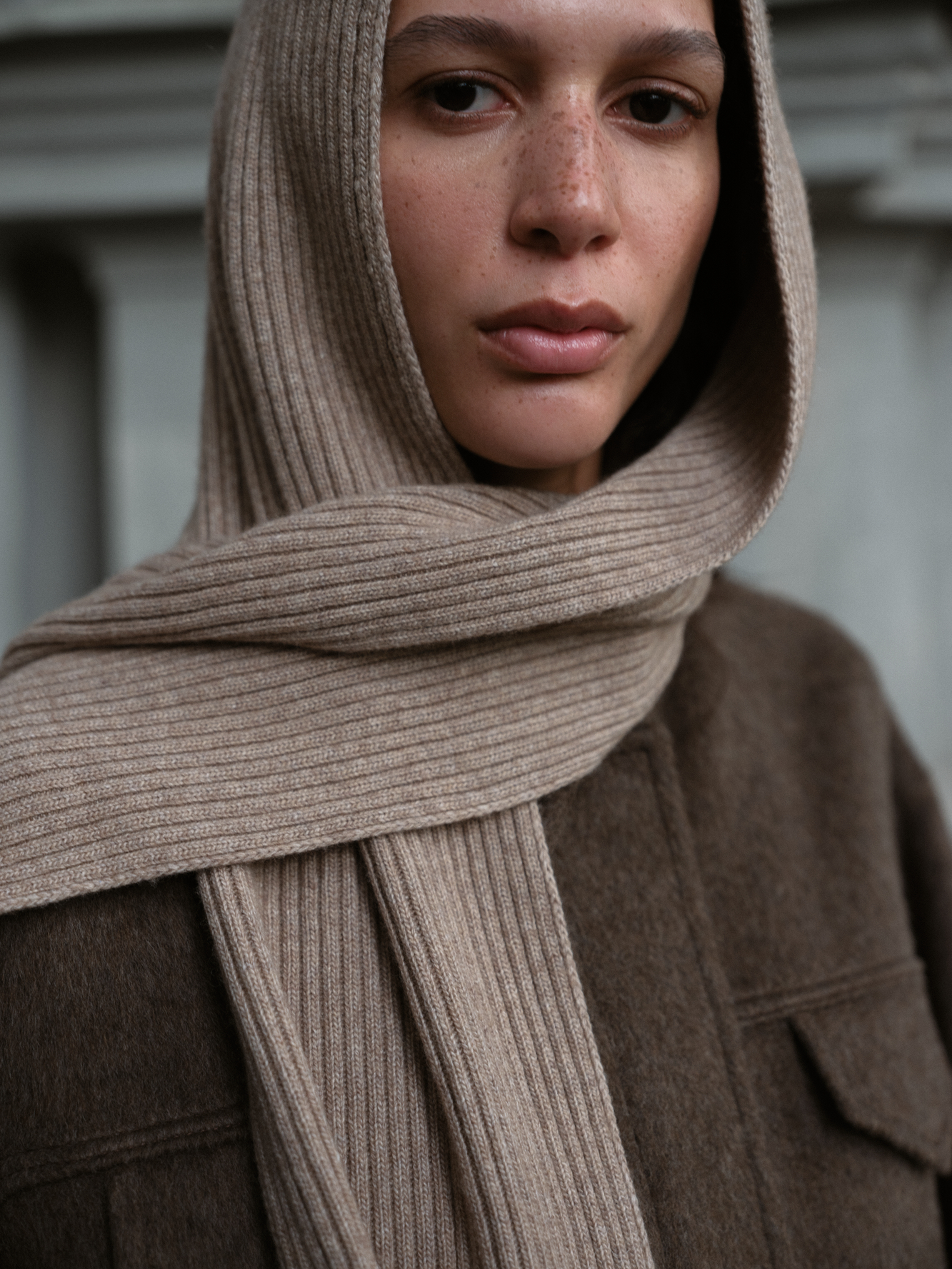 Трикотажный шарф-капюшон - функциональный аксессуар из смесовой шерсти с добавлением кашемира.