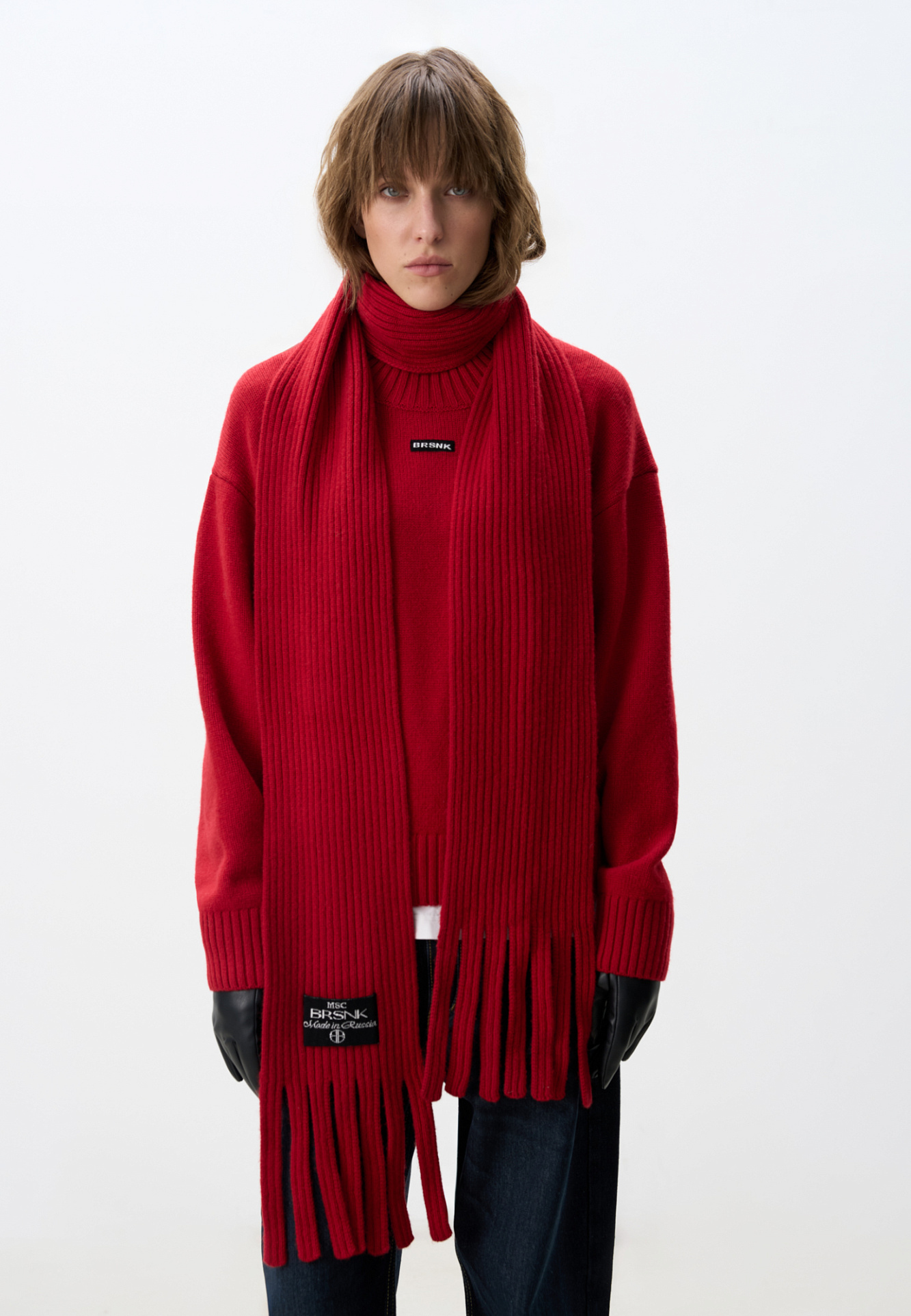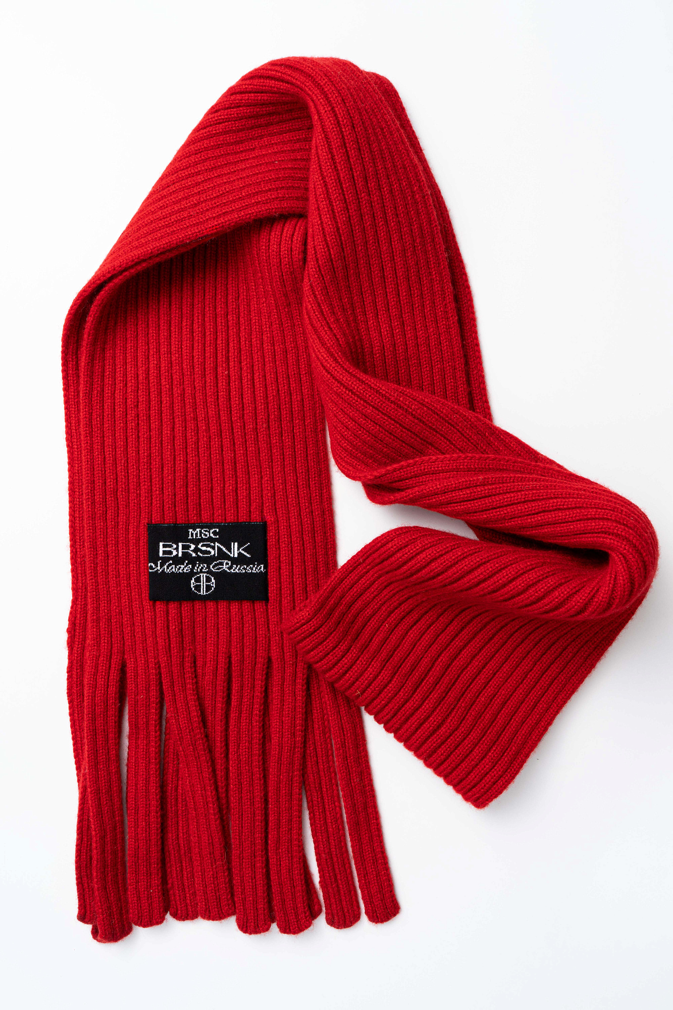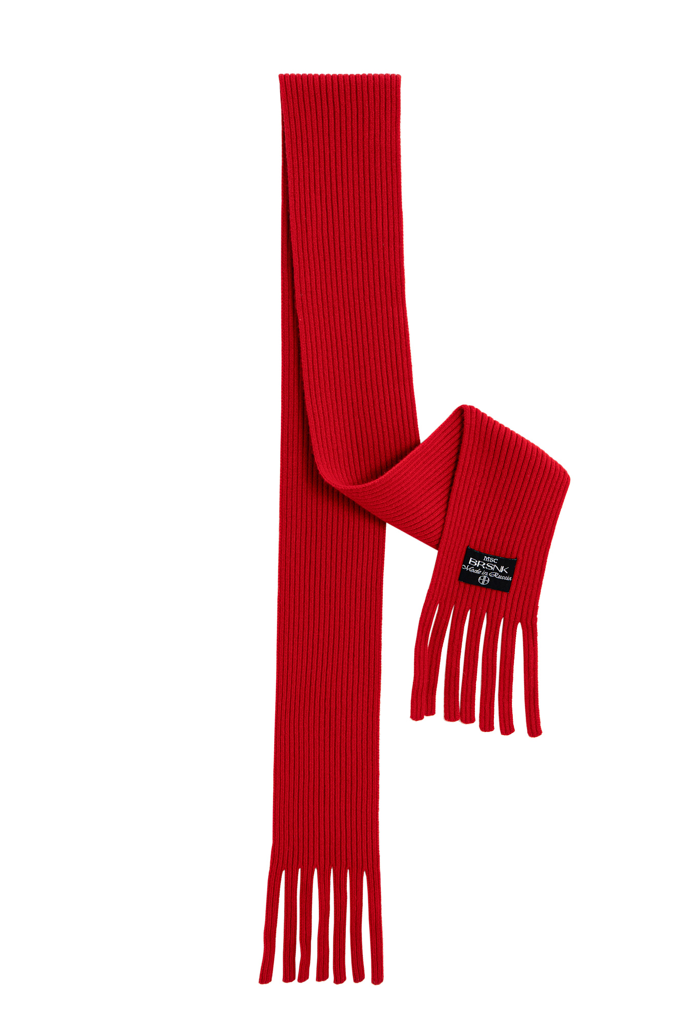 Трикотажный шарф в рубчик. Модель с бахромой и брендированным ярлыком.