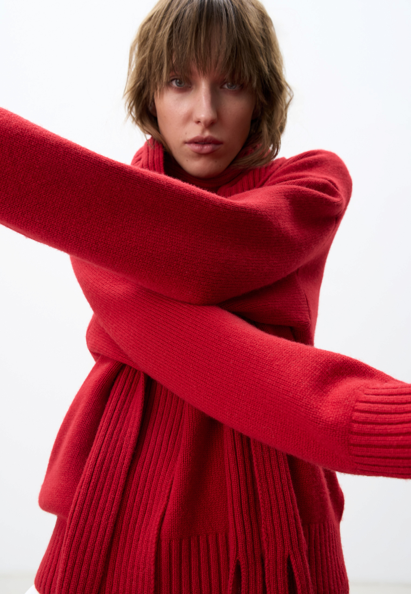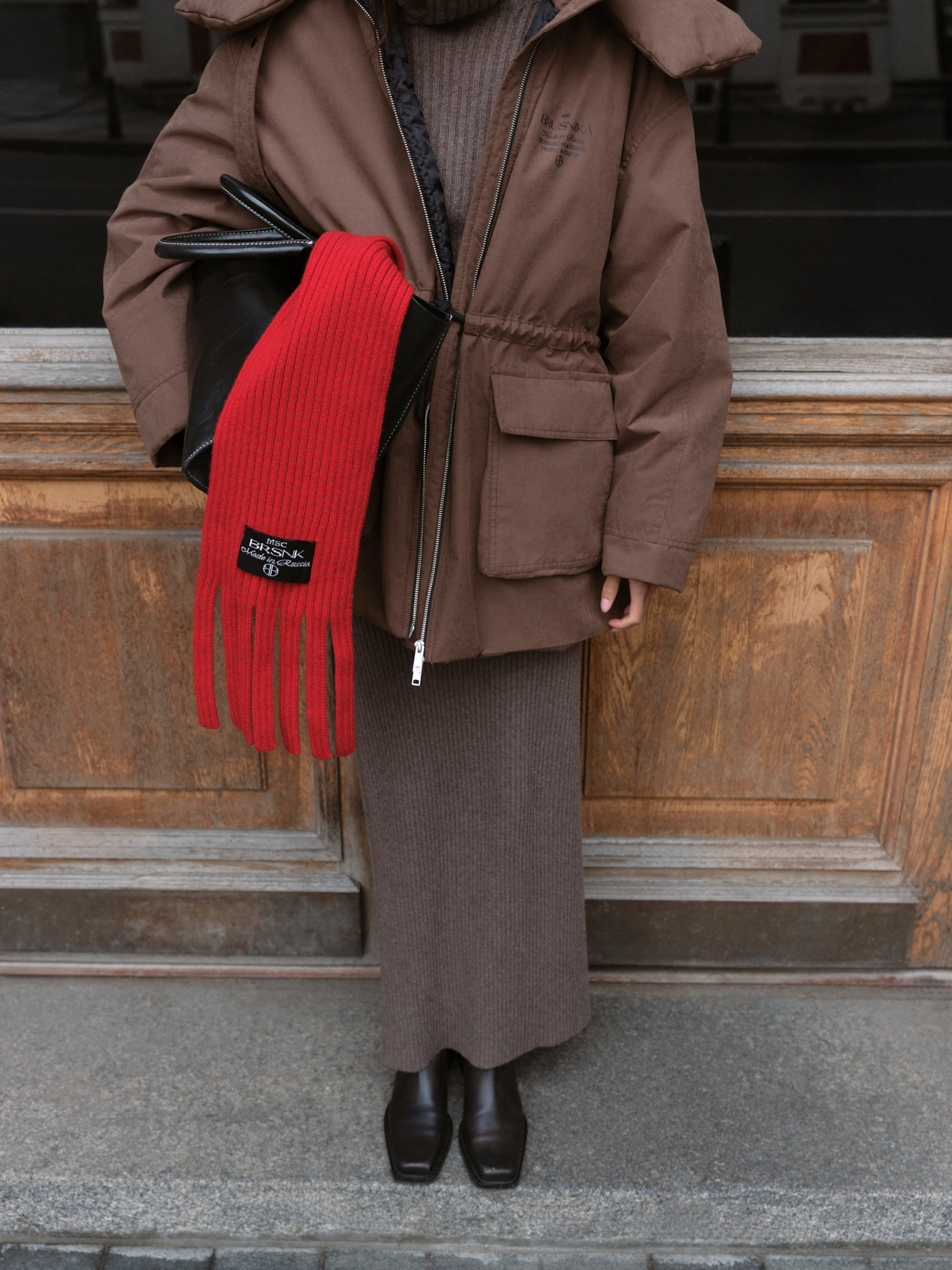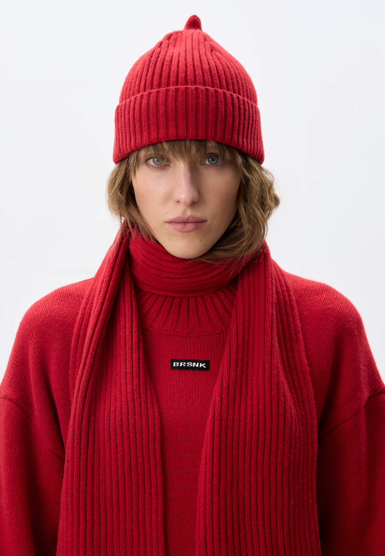 Трикотажный шарф в рубчик. Модель с бахромой и брендированным ярлыком.