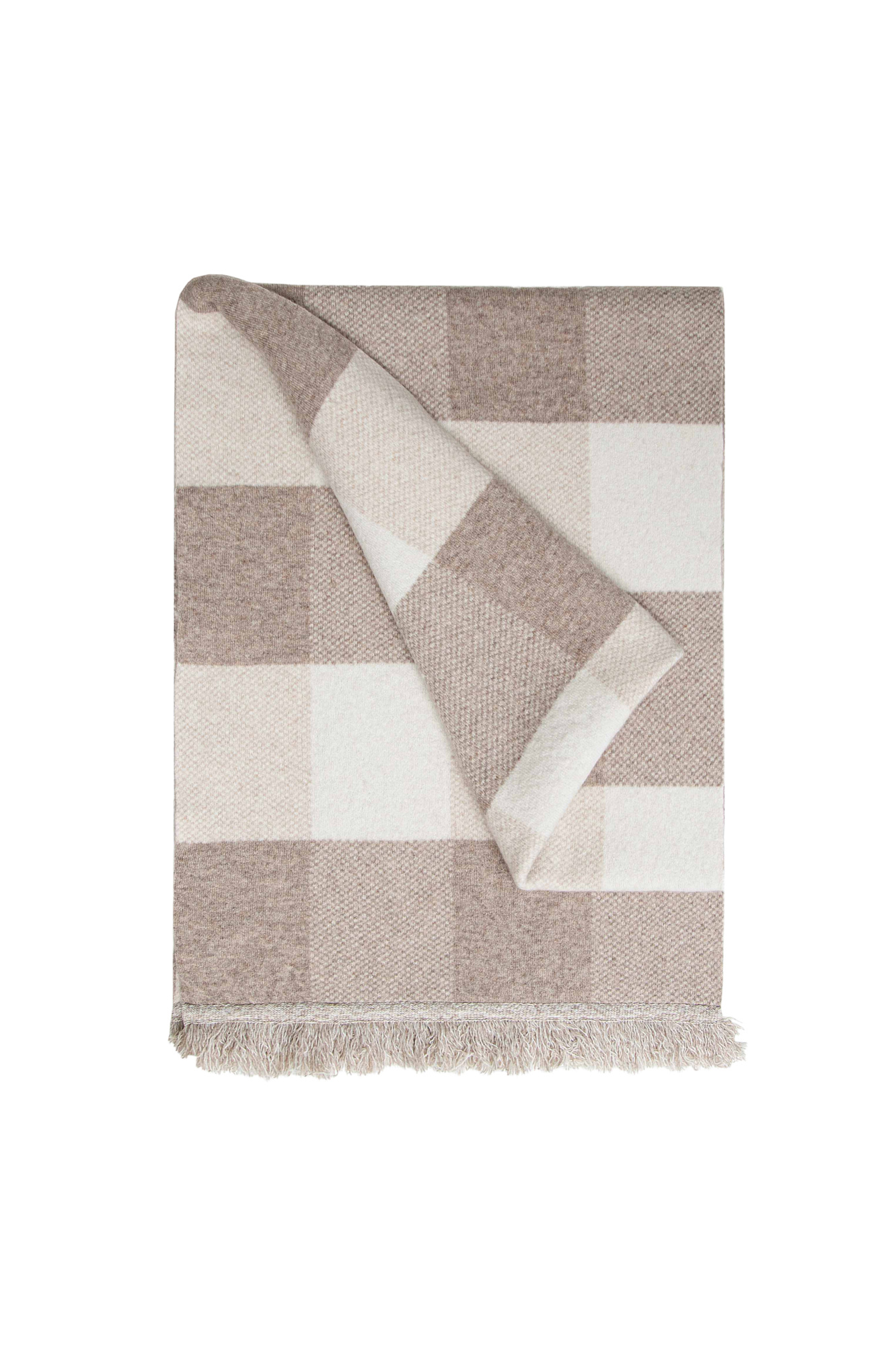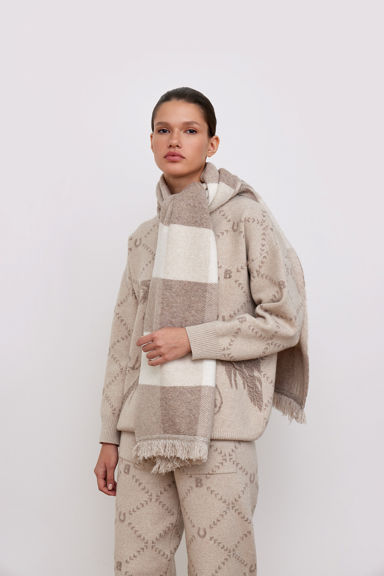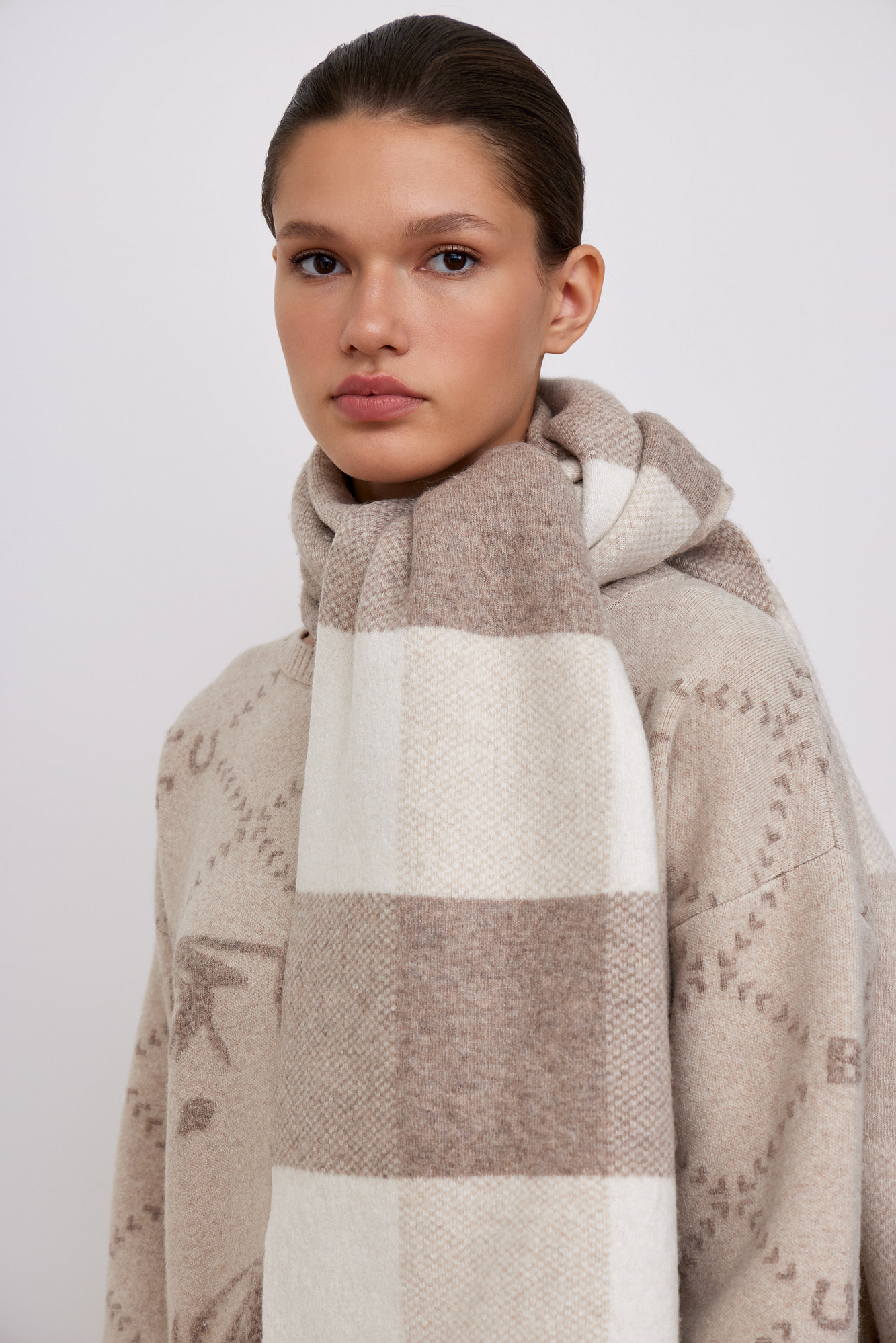 Трикотажный палантин из кашемира. Модель в клетку с бахромой по краям.