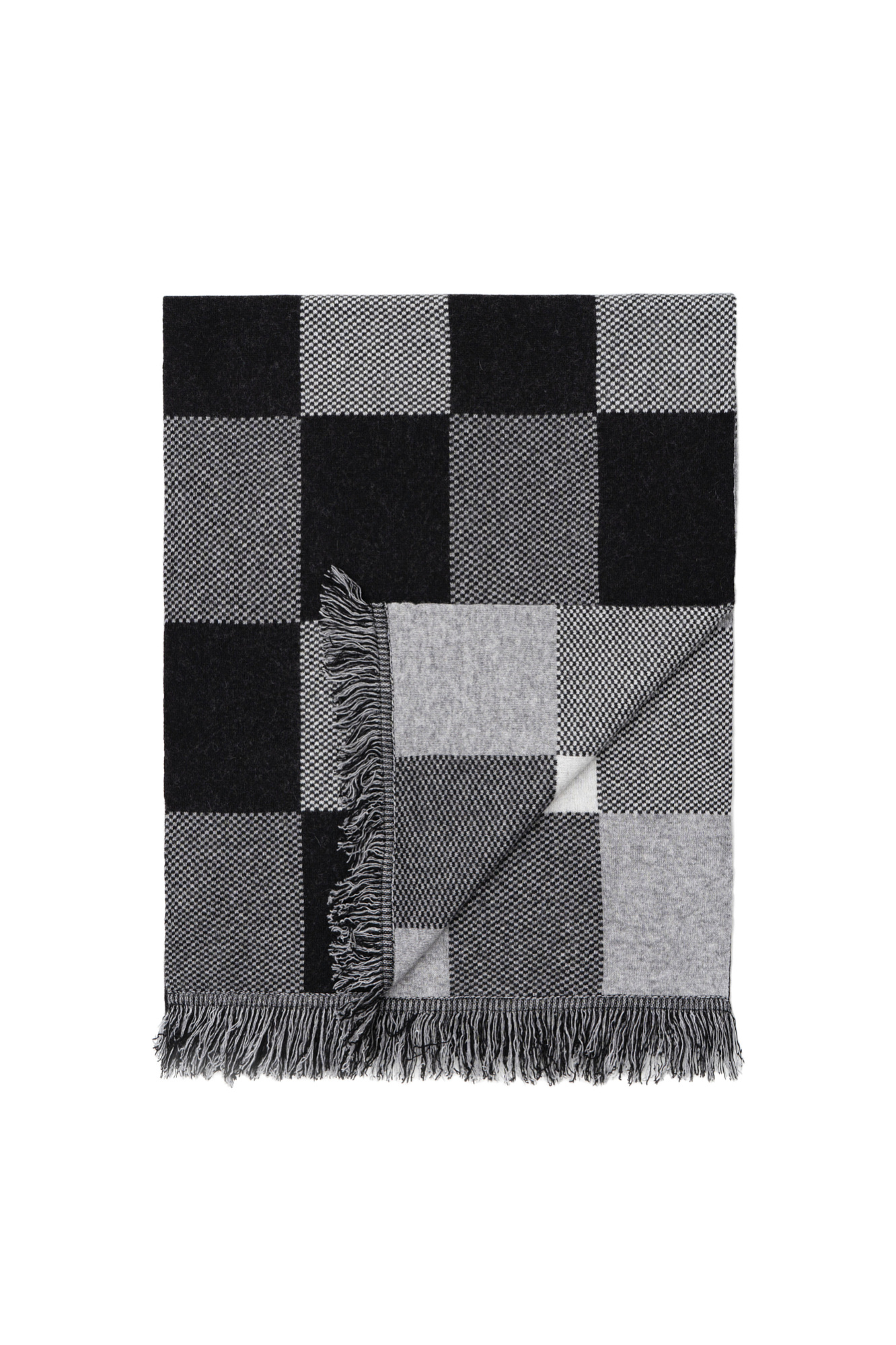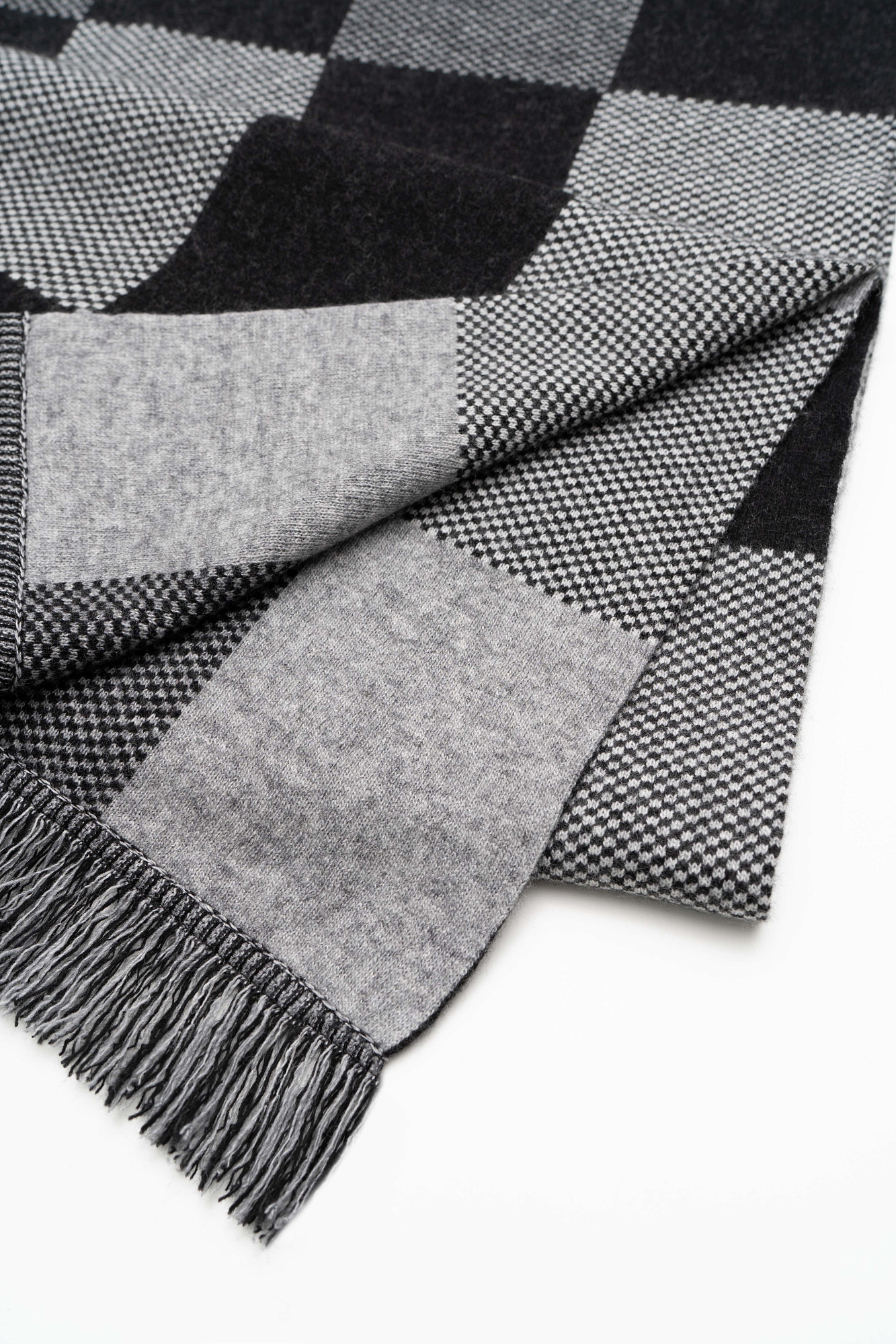 Трикотажный палантин из кашемира. Модель в клетку с бахромой по краям.