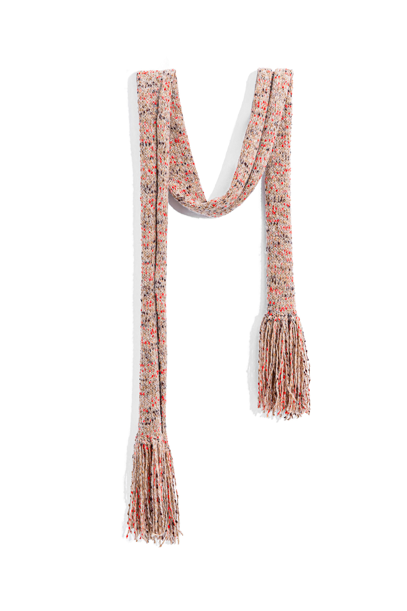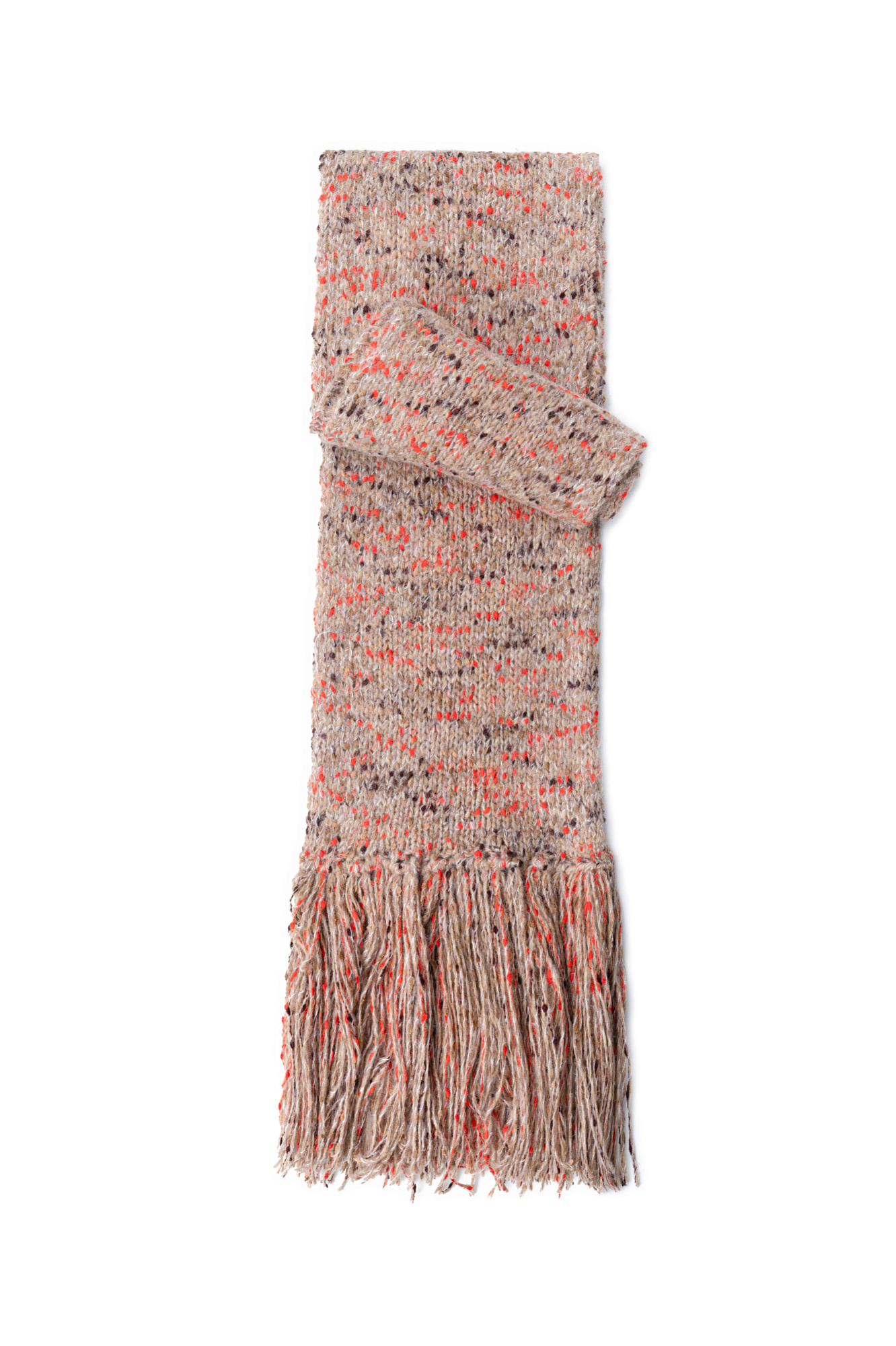 Трикотажный шарф из буклированной пряжи с длинной бахромой.