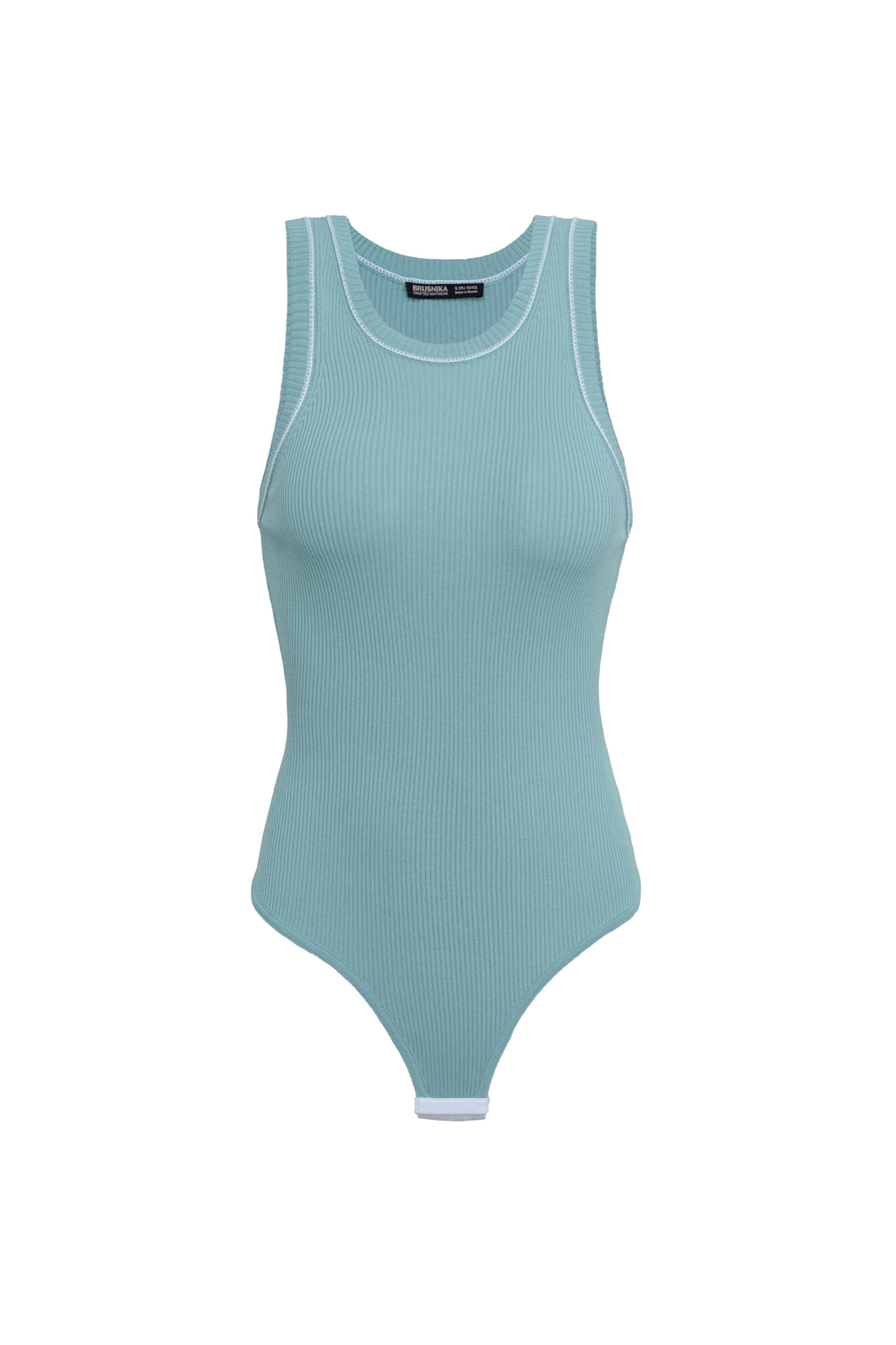 Трикотажное боди из вискозы в рубчик. Модель без рукавов с круглым вырезом горловины. Изделие декорировано контрастным кантом. Застежка на бельевые крючки.