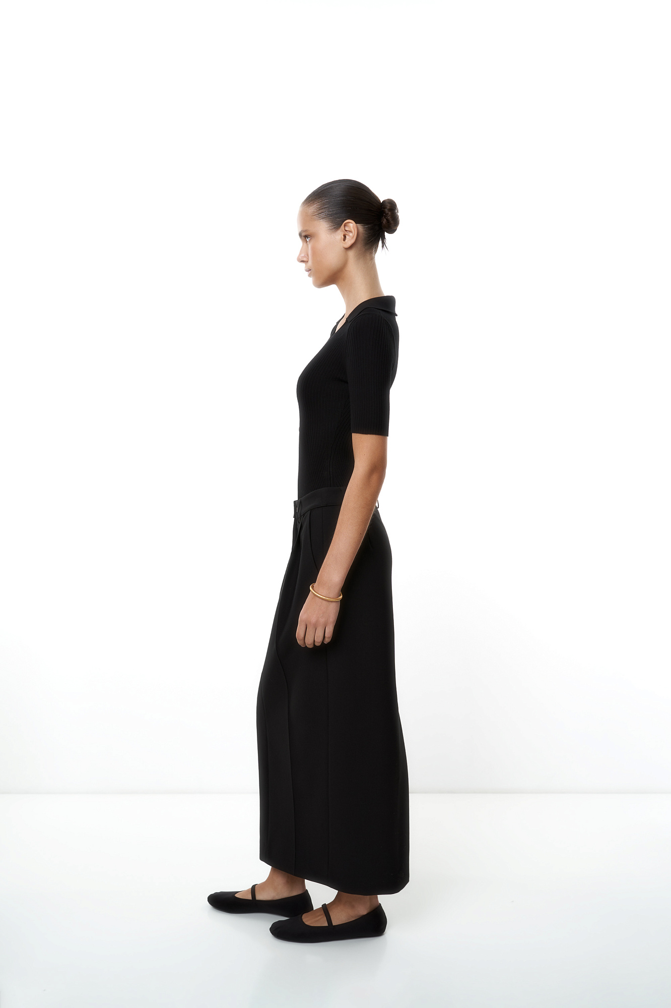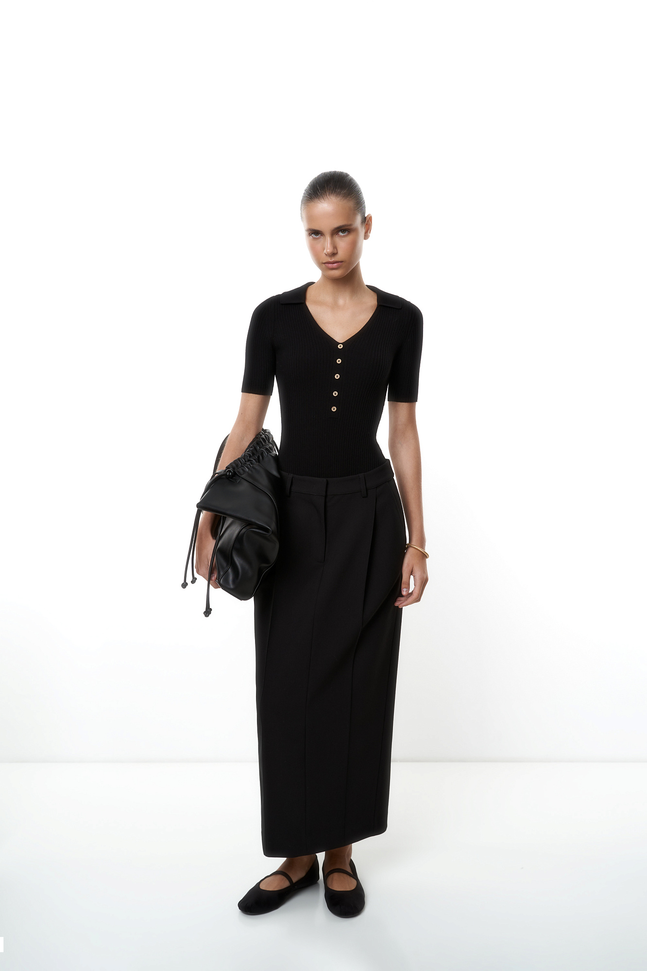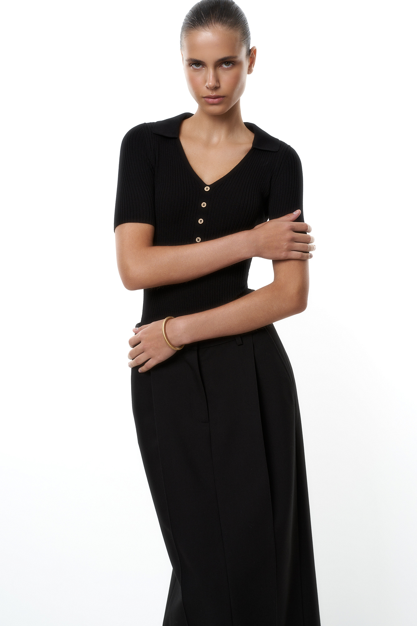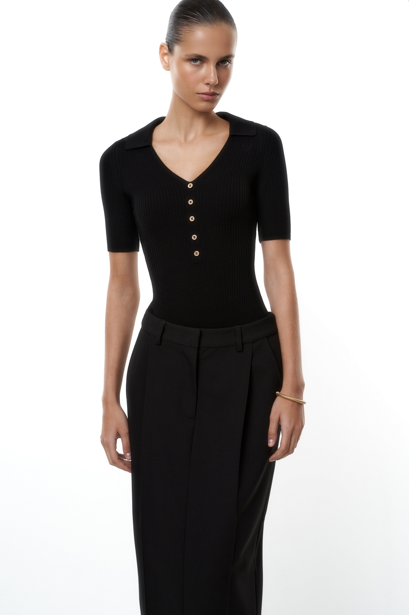 Трикотажное боди из вискозы в рубчик. Модель V-образный вырезом горловины, отложным воротником и коротким рукавом. Изделие декорировано небольшими пуговицами. Застежка на бельевые крючки.