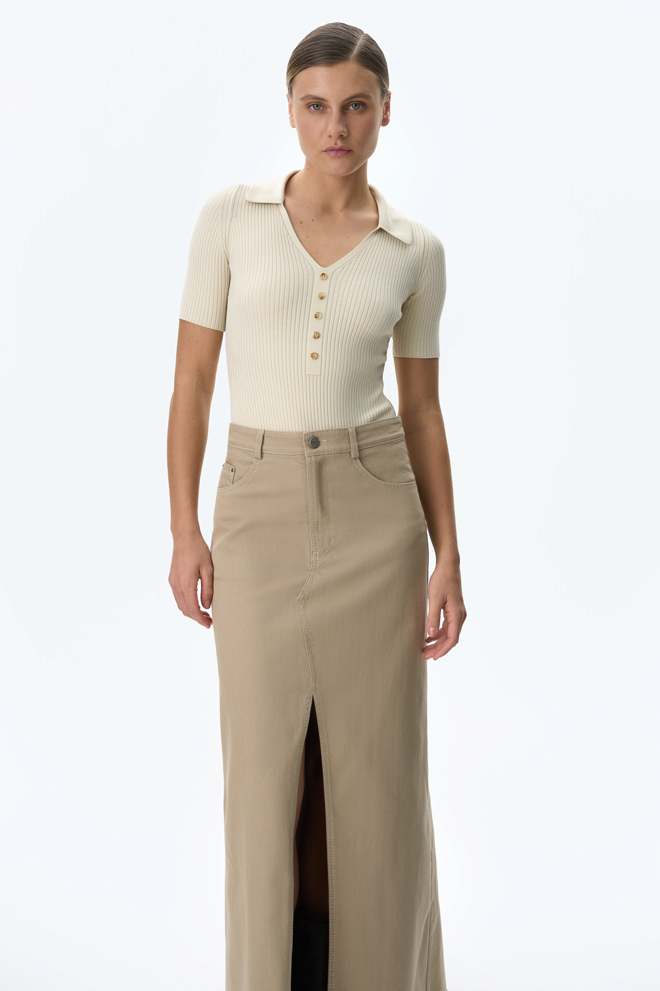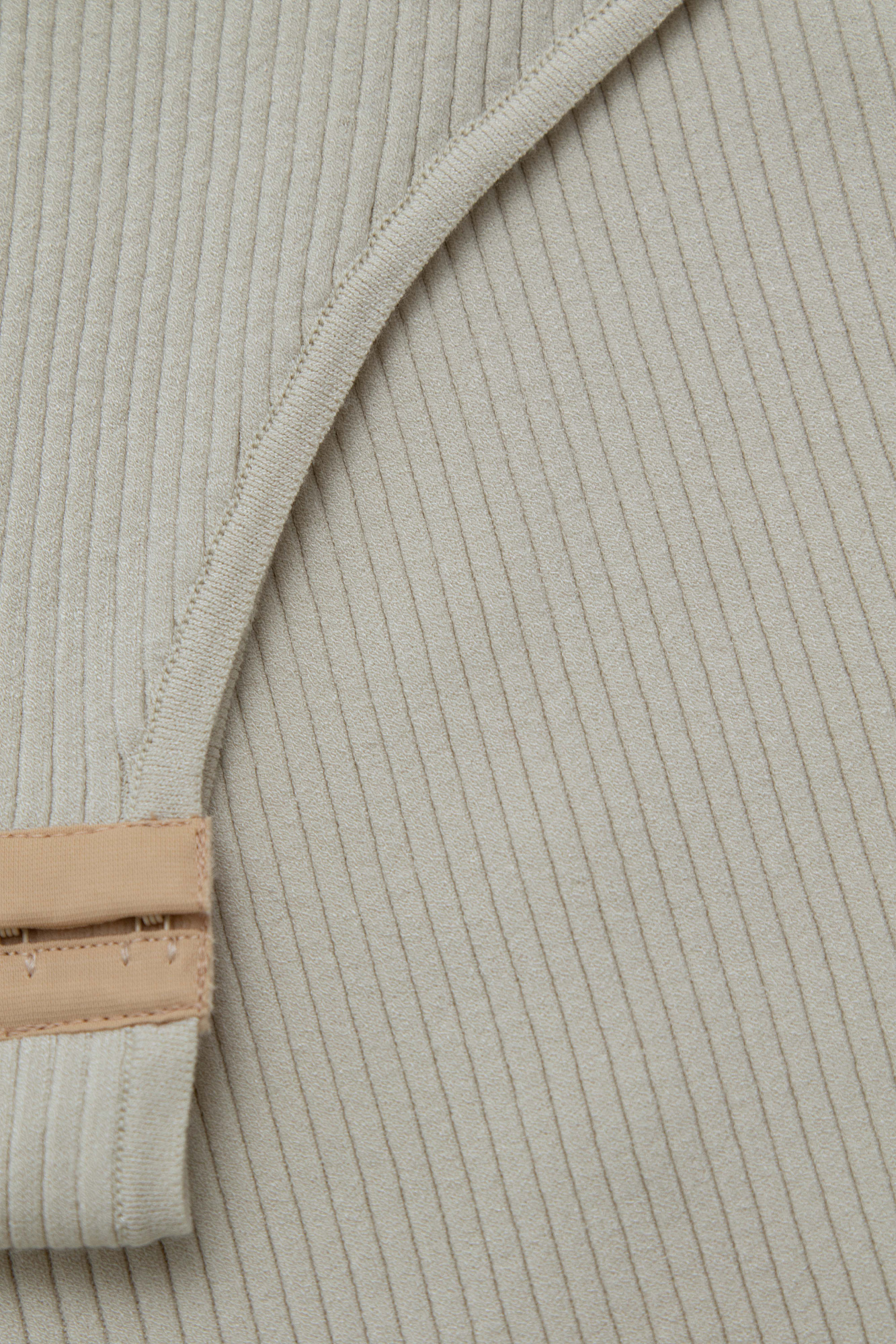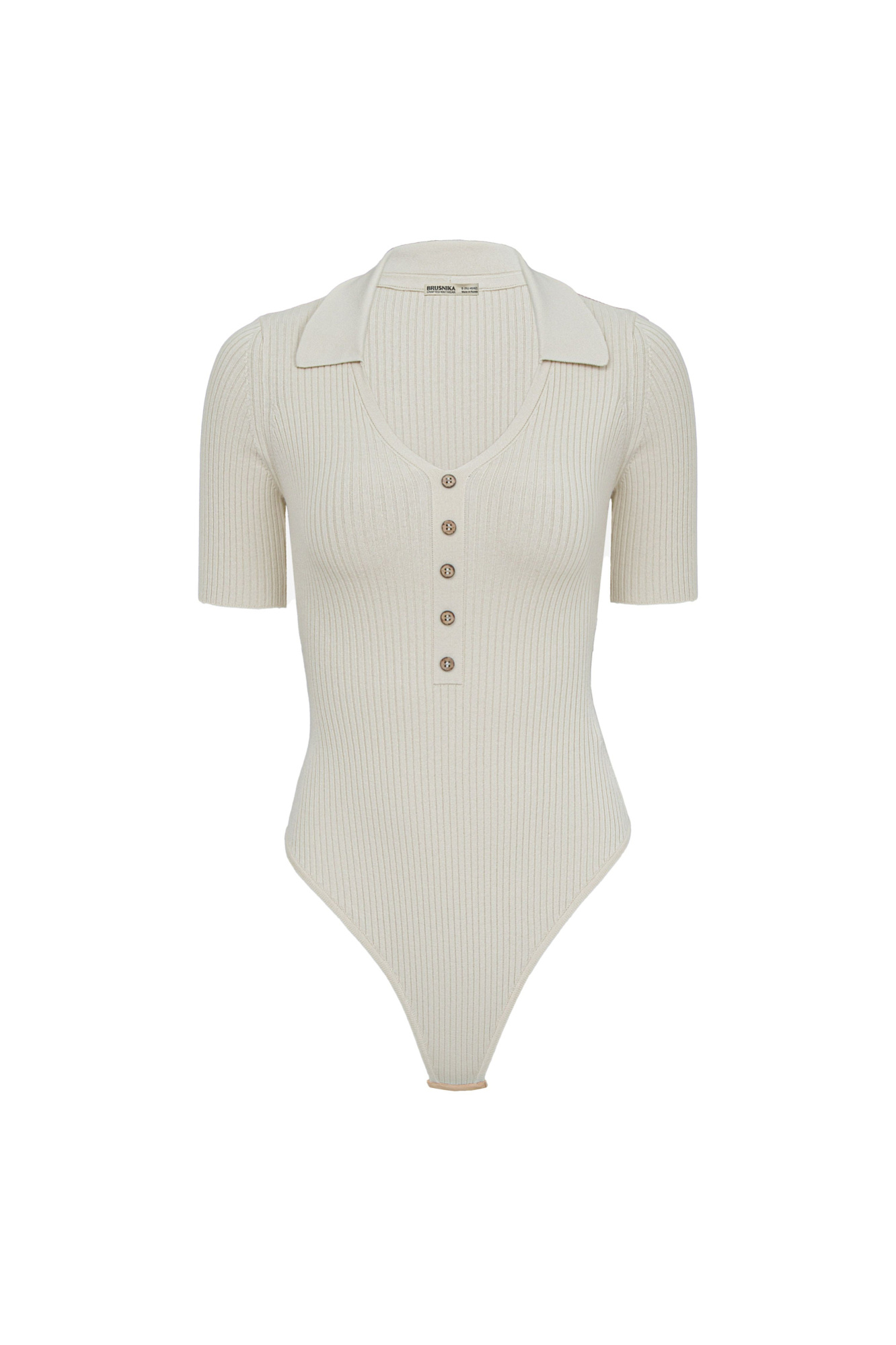 Трикотажное боди из вискозы в рубчик. Модель V-образный вырезом горловины, отложным воротником и коротким рукавом. Изделие декорировано небольшими пуговицами. Застежка на бельевые крючки.