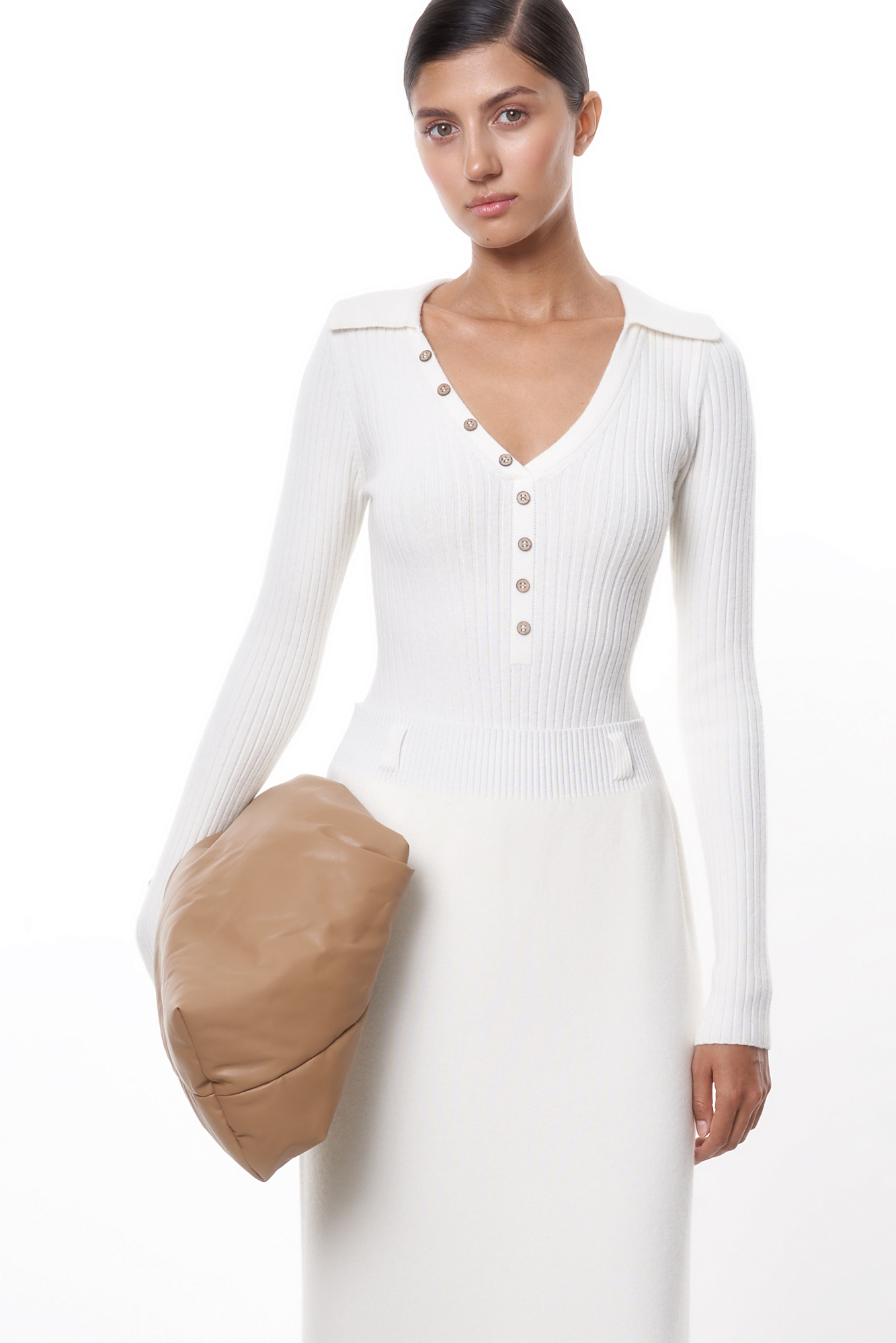 Трикотажное боди из кашемира и шерсти. Модель с длинным рукавом, отложным вороником и глубоким V-образным вырезом с планкой. Изделие декорировано пуговицами.