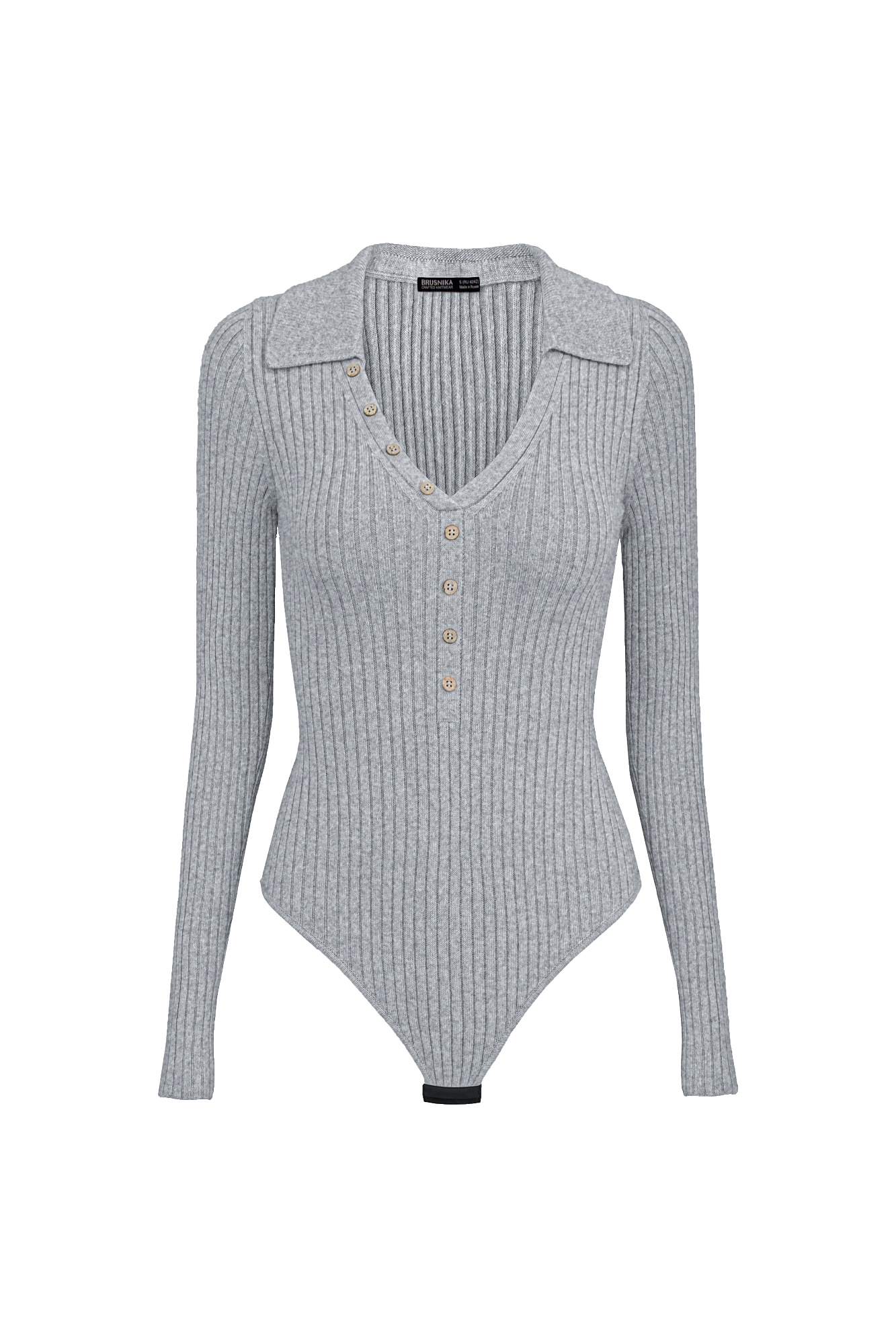 Трикотажное боди из кашемира и шерсти. Модель с длинным рукавом, отложным вороником и глубоким V-образным вырезом с планкой. Изделие декорировано пуговицами.