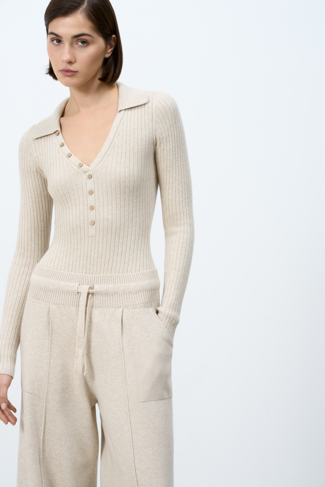 Трикотажное боди из кашемира и шерсти. Модель с длинным рукавом, отложным вороником и глубоким V-образным вырезом с планкой. Изделие декорировано пуговицами.