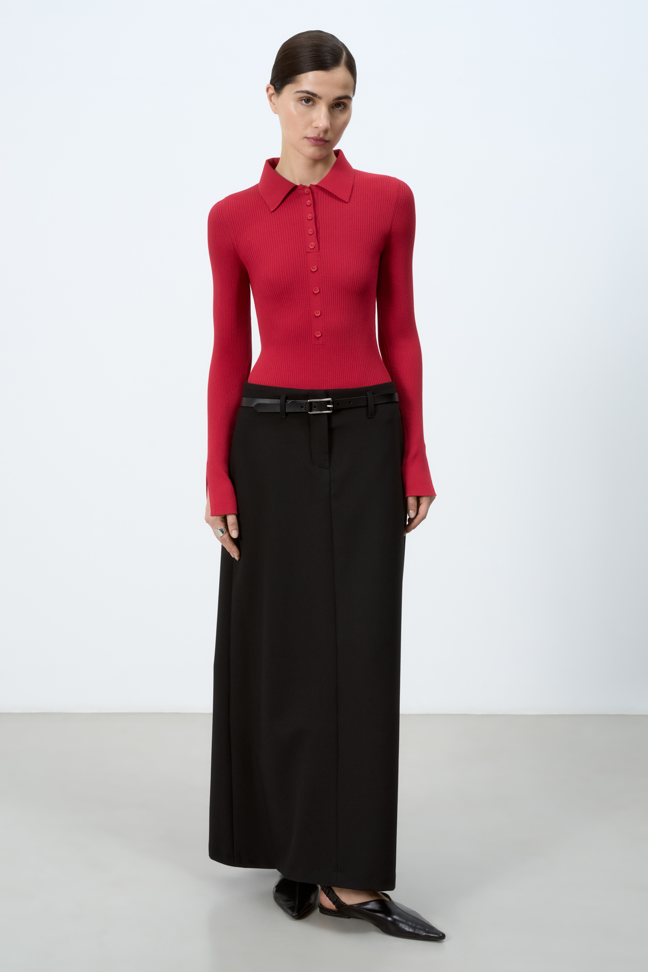 Трикотажное боди из вискозы. Модель облегающего силуэта с длинными рукавами, воротником поло и пуговицами на планке. Застежка в виде крючков в нижней части изделия.