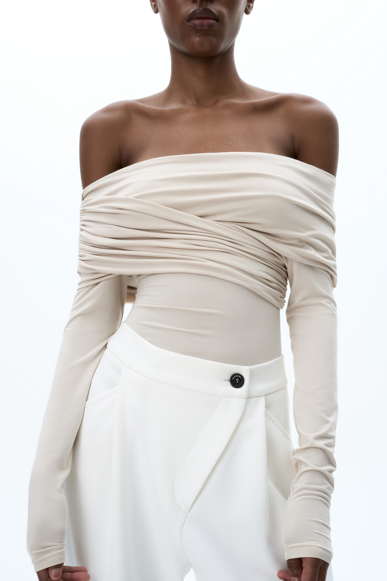 Боди из модала с драпировкой на груди. Модель приталенного силуэта, с длинным рукавом, открытой линией плеч и застежкой на бельевые крючки.