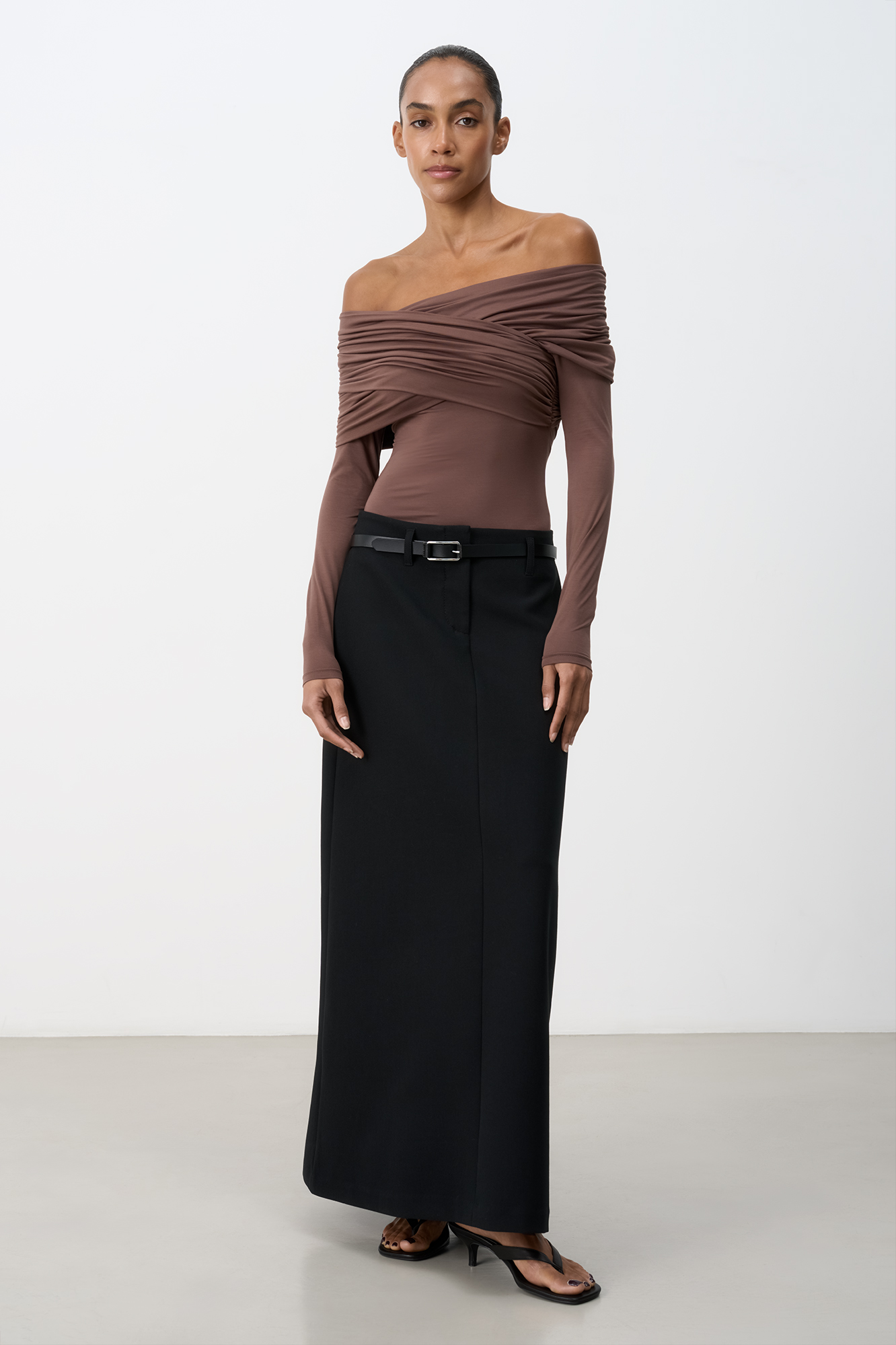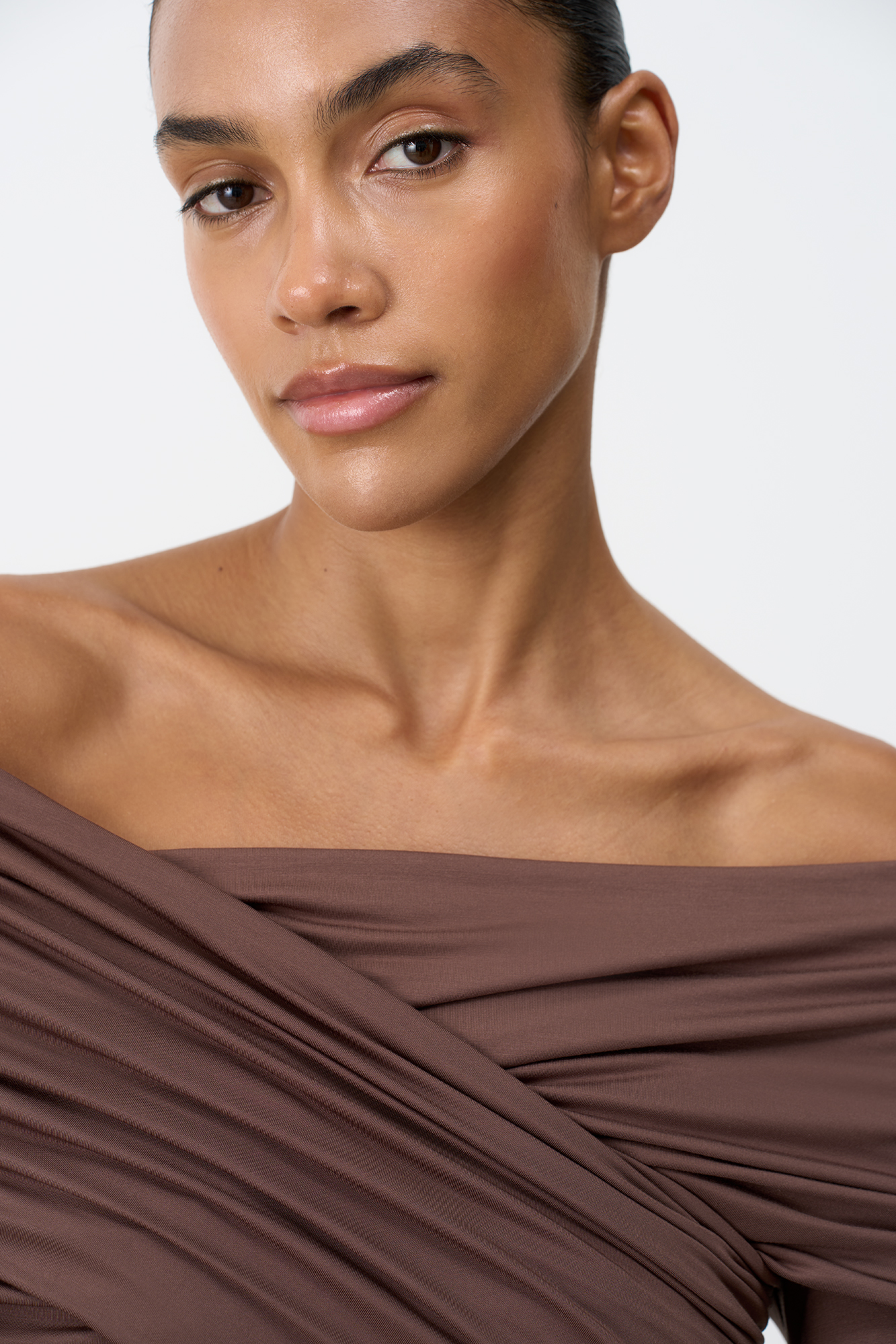 Боди из модала с драпировкой на груди. Модель приталенного силуэта, с длинным рукавом, открытой линией плеч и застежкой на бельевые крючки.