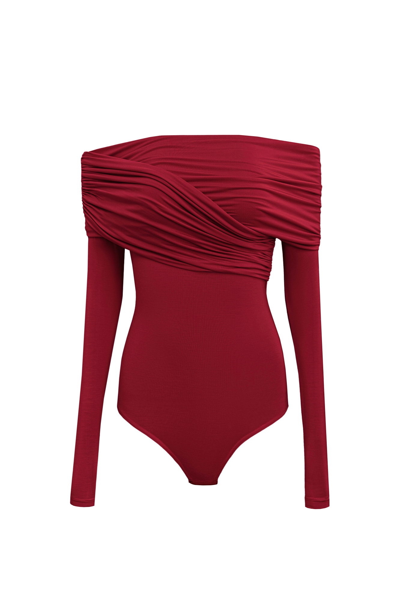 Боди из модала с драпировкой на груди. Модель приталенного силуэта, с длинным рукавом, открытой линией плеч и застежкой на бельевые крючки.