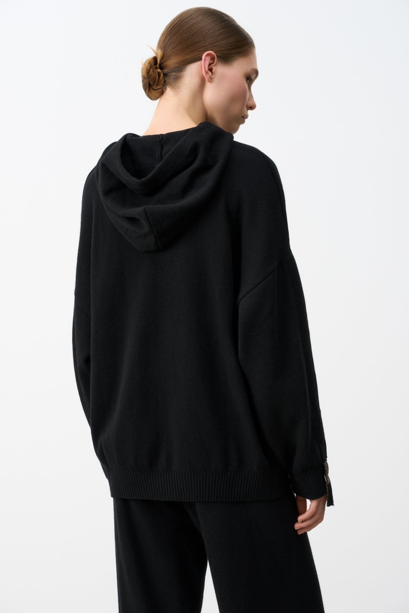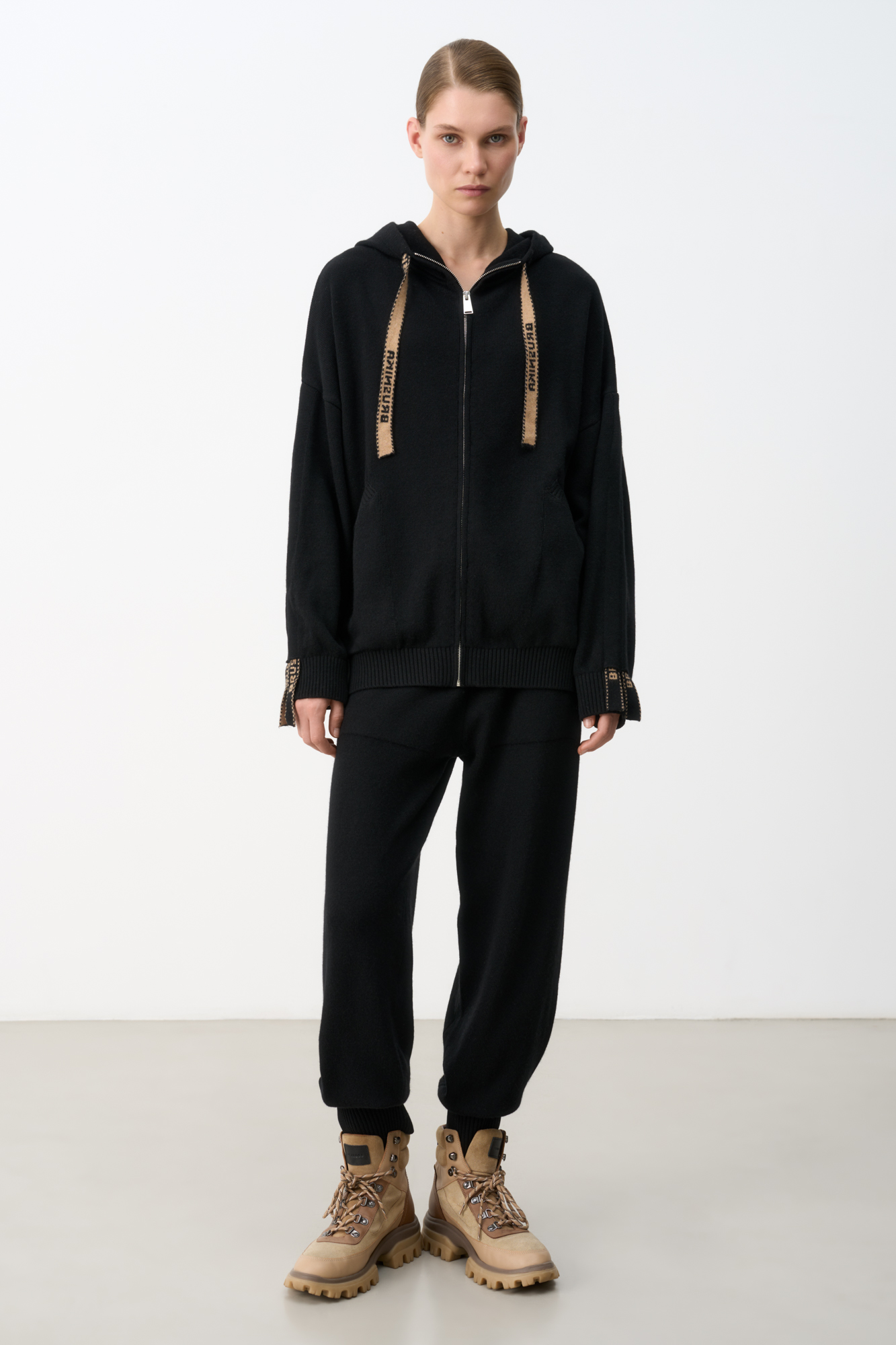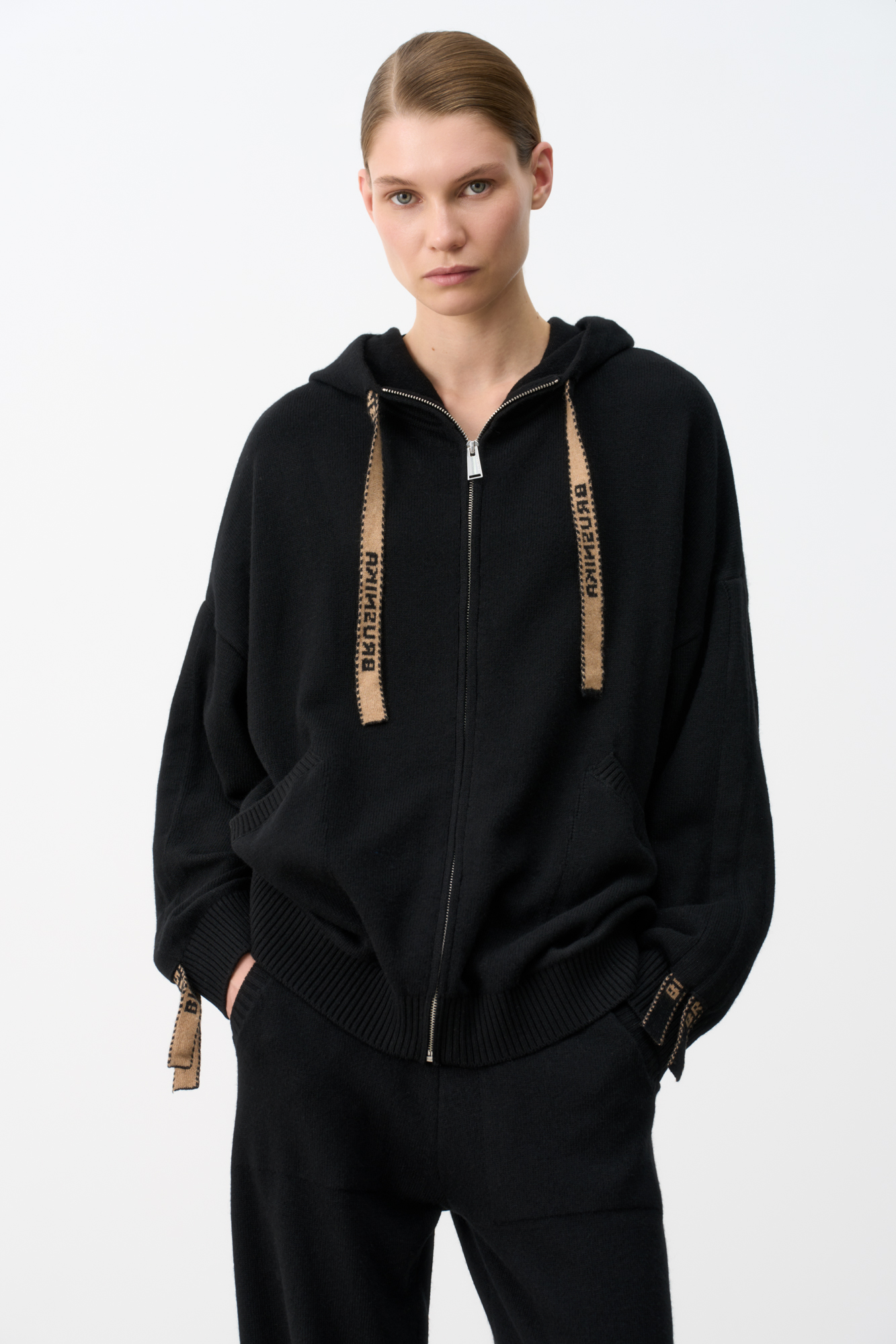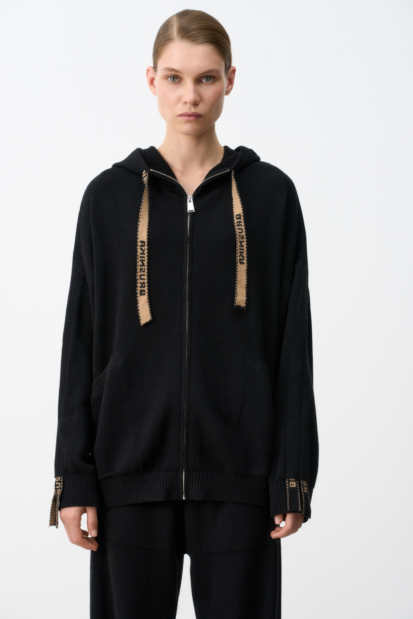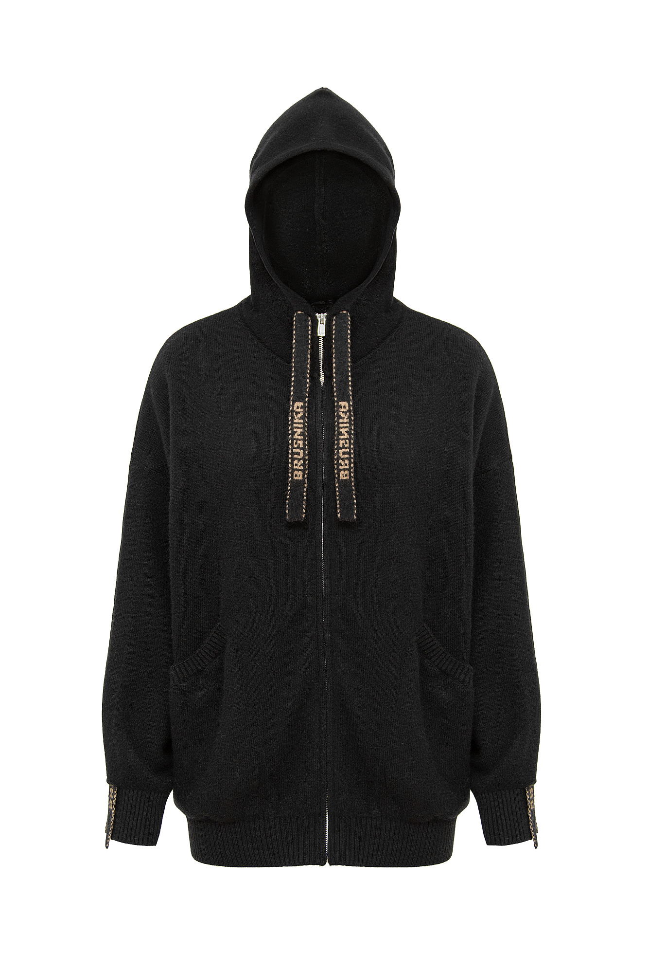 Худи из кашемира и шерсти в спортивном стиле. Модель свободного кроя с застежкой на молнию. Капюшон и рукава оформлены брендированными лентами. Снизу изделия два боковых кармана.