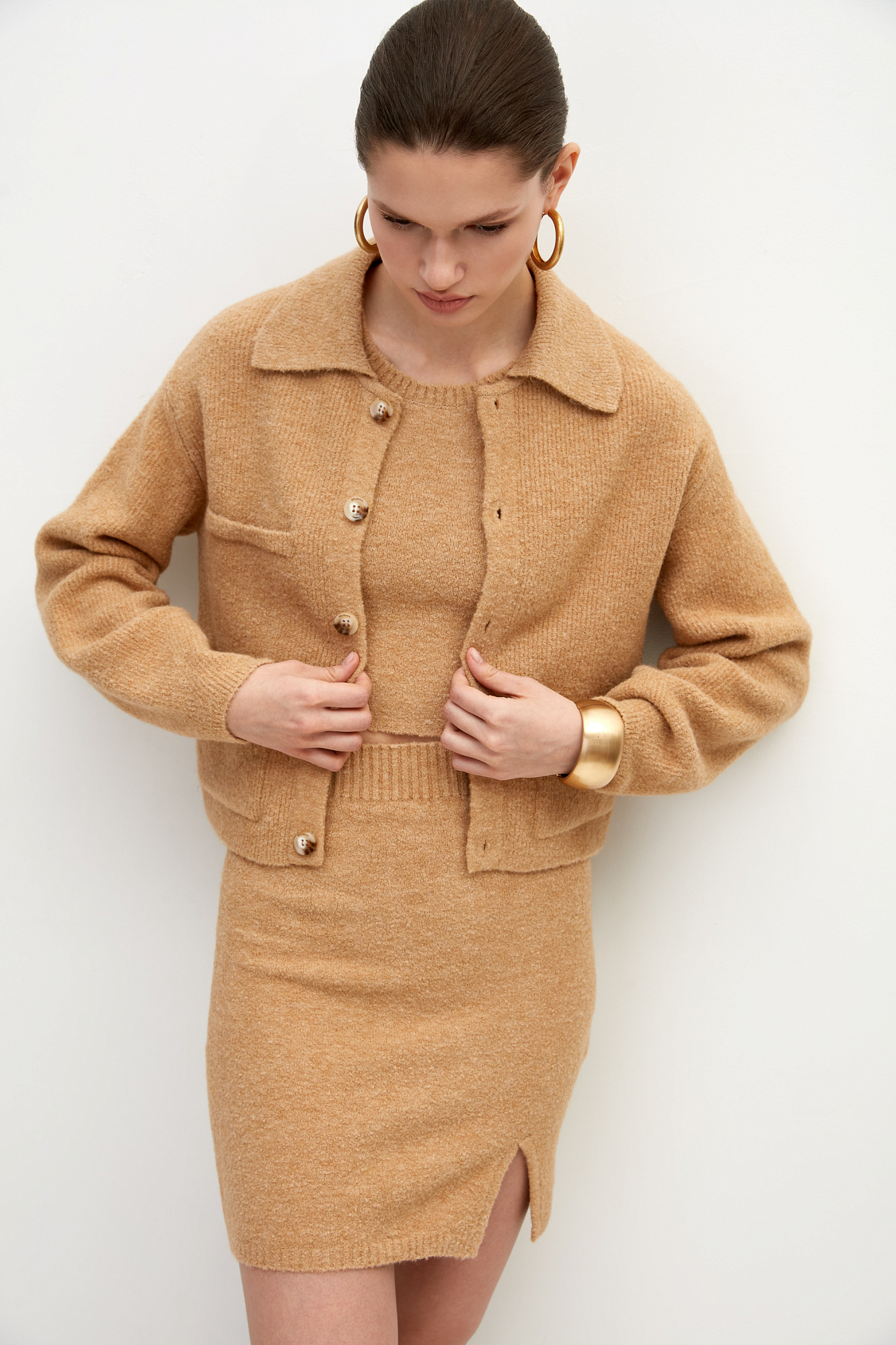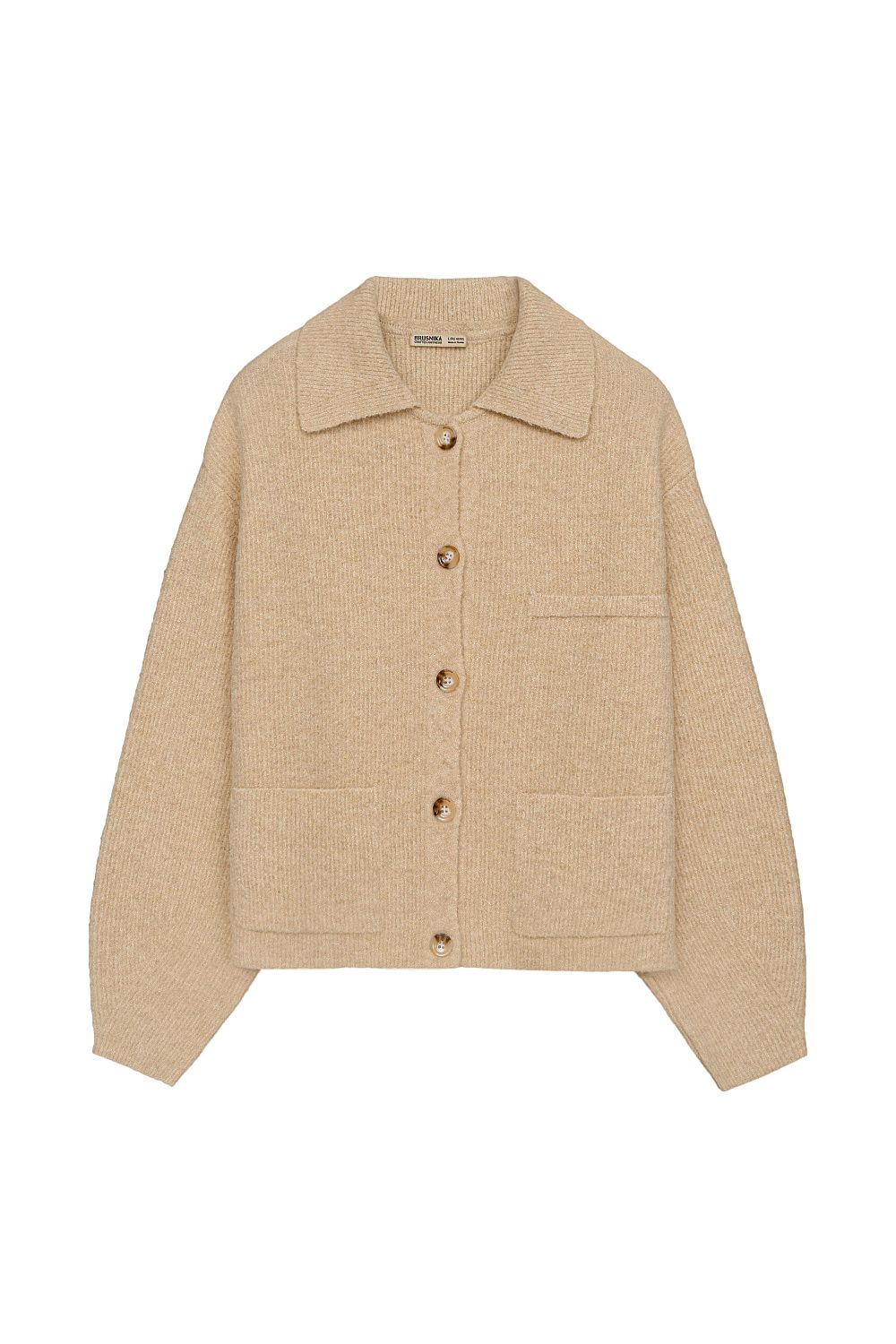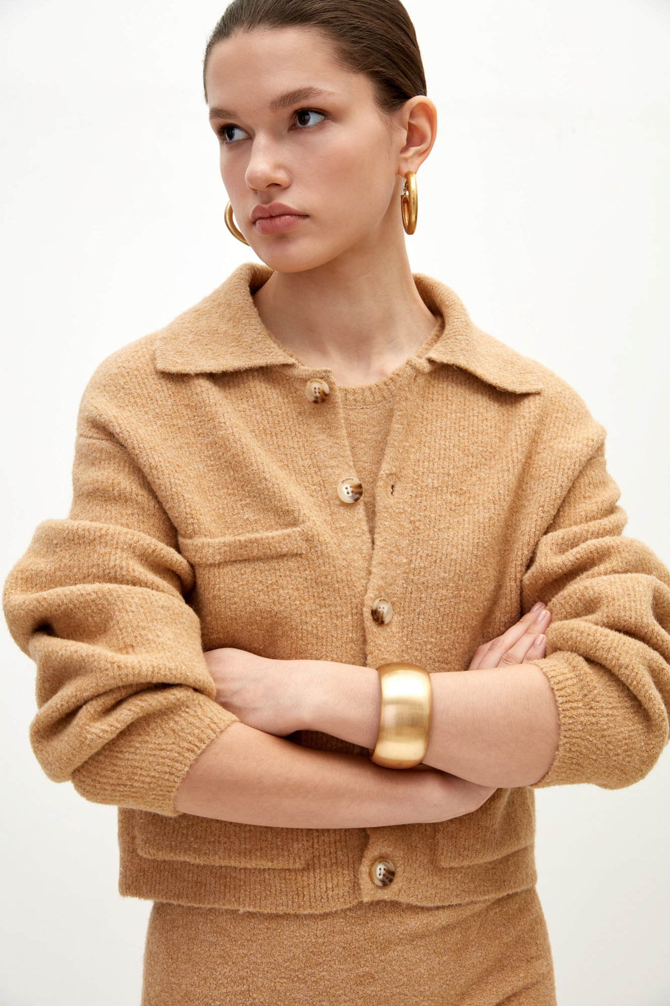 Трикотажный бомбер из смесовой шерсти. Модель свободного силуэта с накладными карманами и спущенной линией плеча. Застежка на пуговицы.