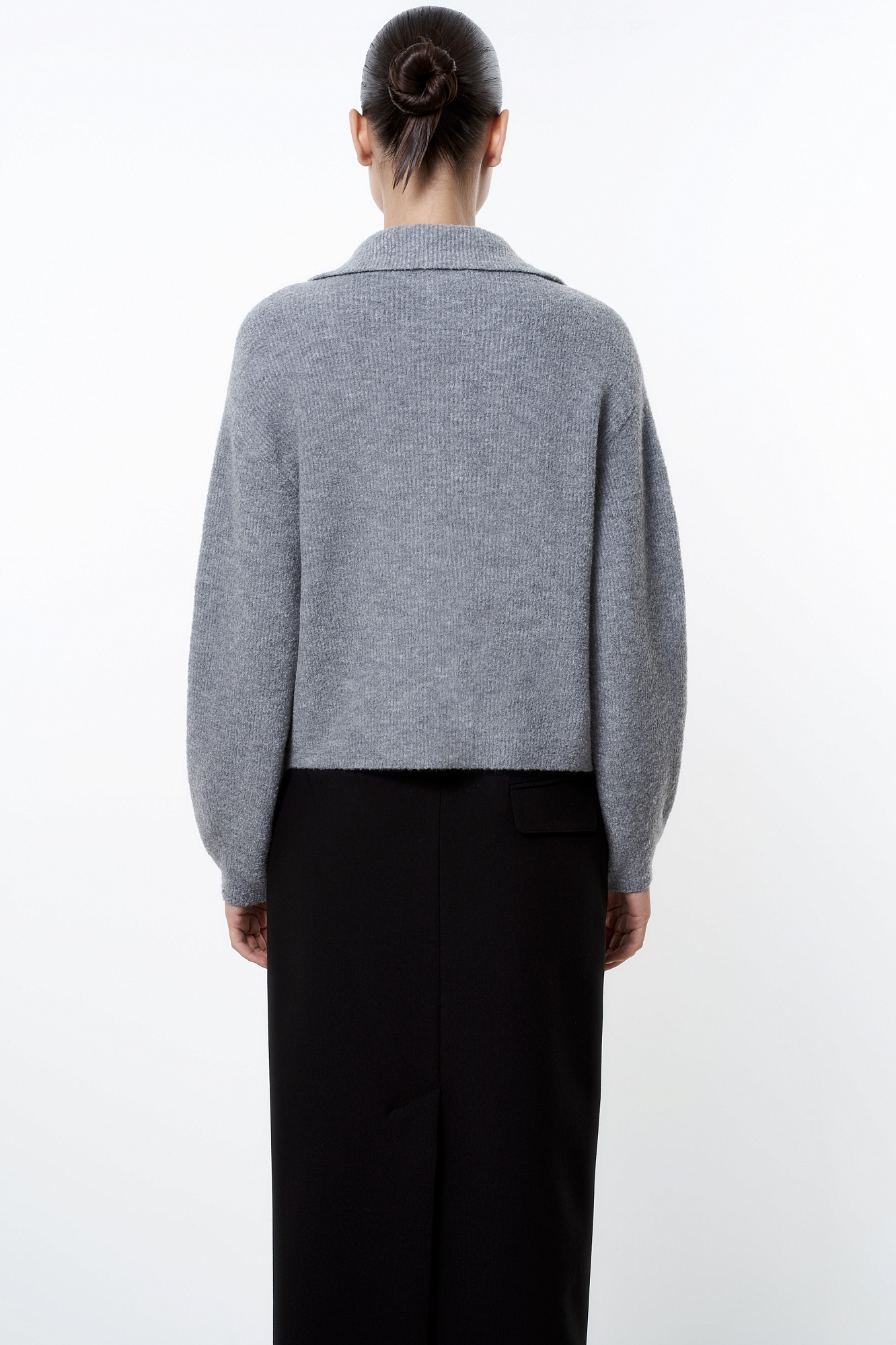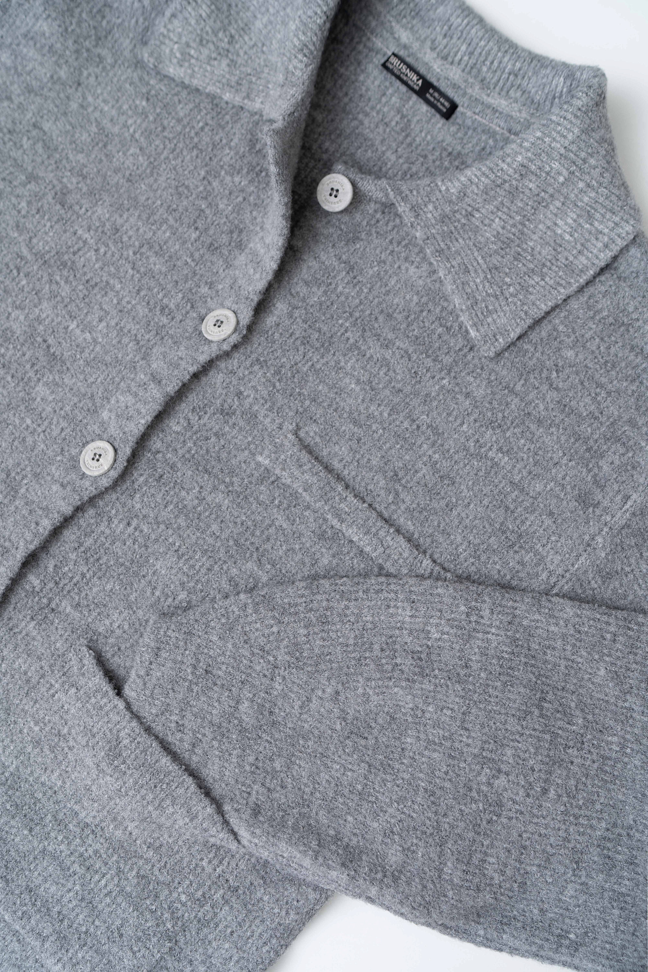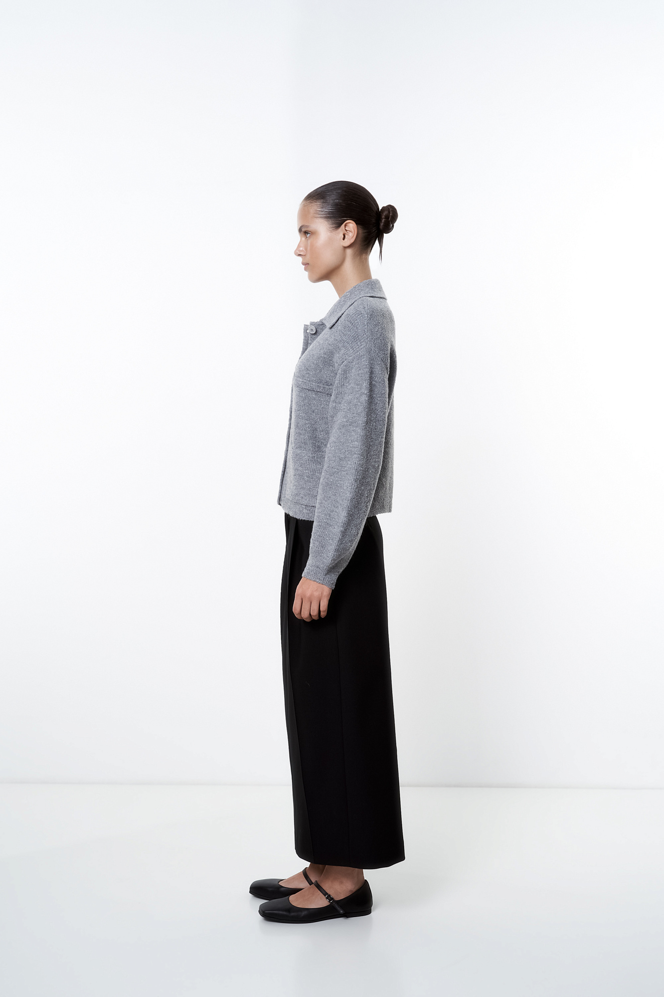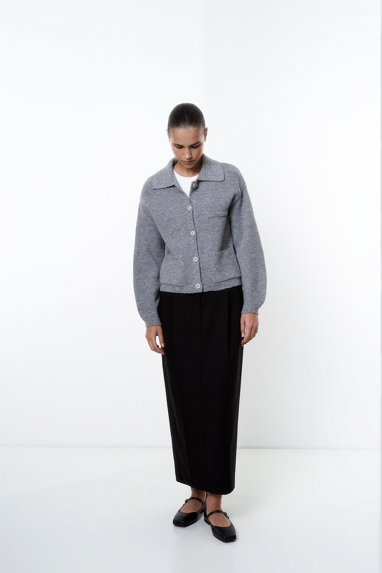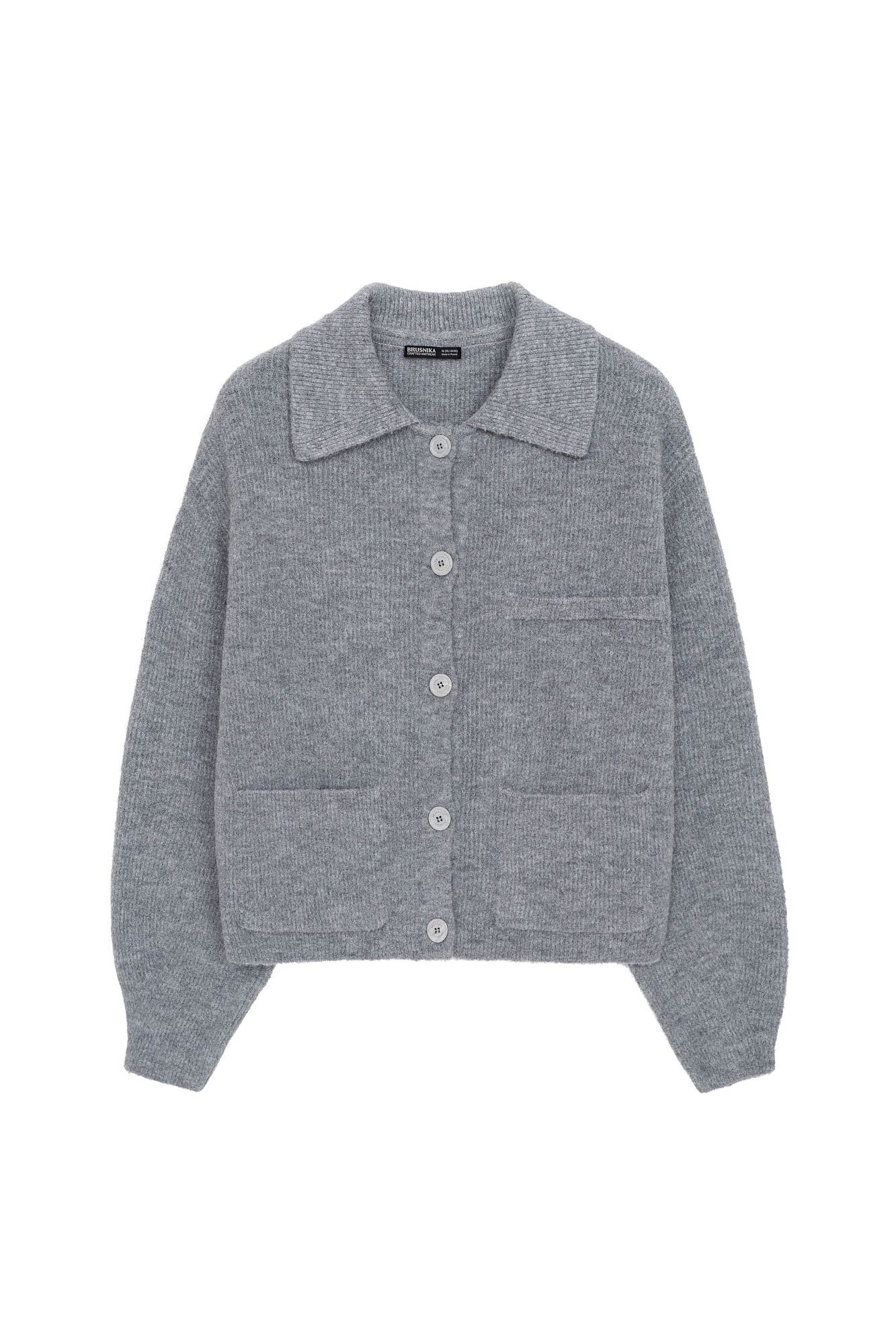Трикотажный бомбер из смесовой шерсти. Модель свободного силуэта с накладными карманами и спущенной линией плеча. Застежка на пуговицы.