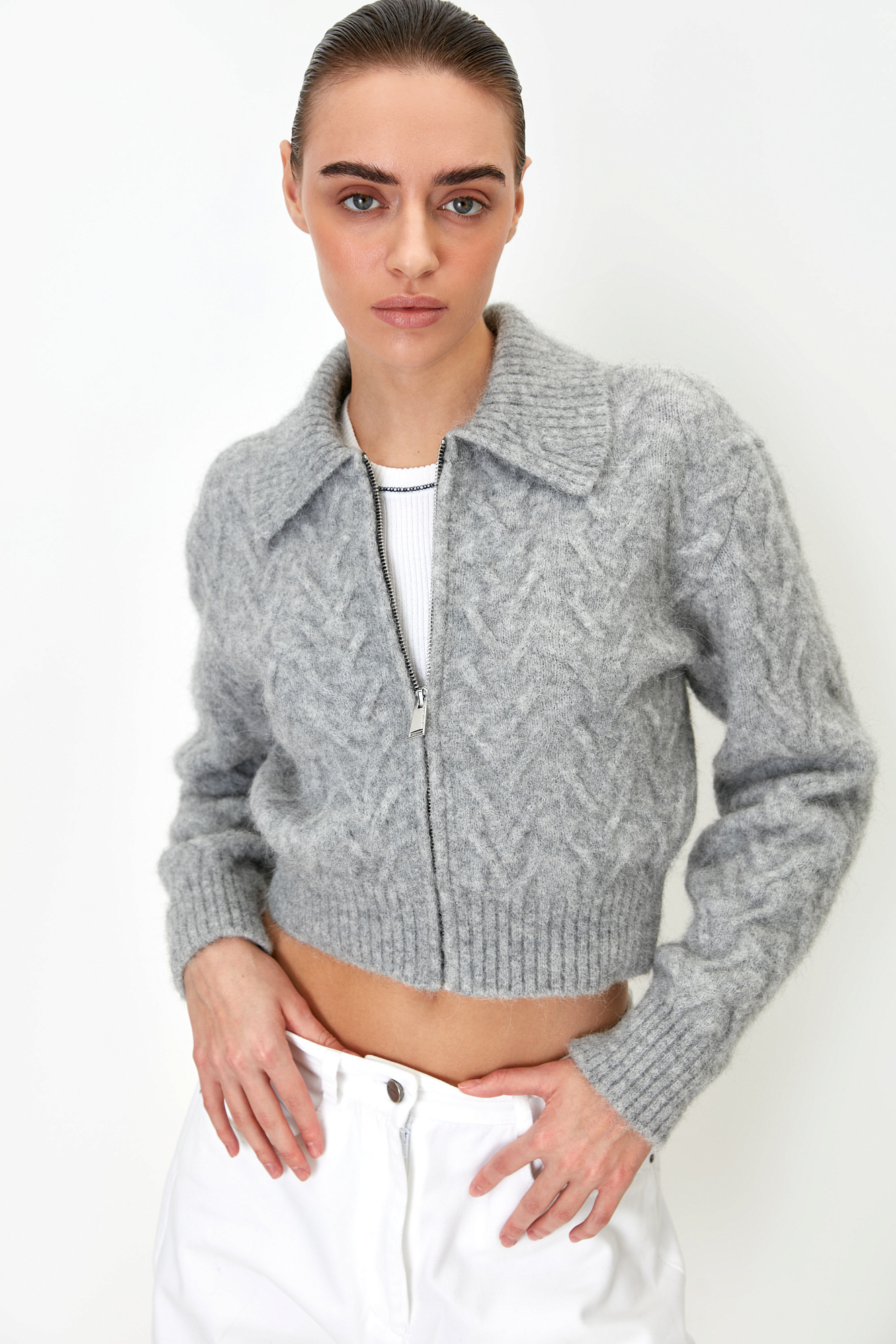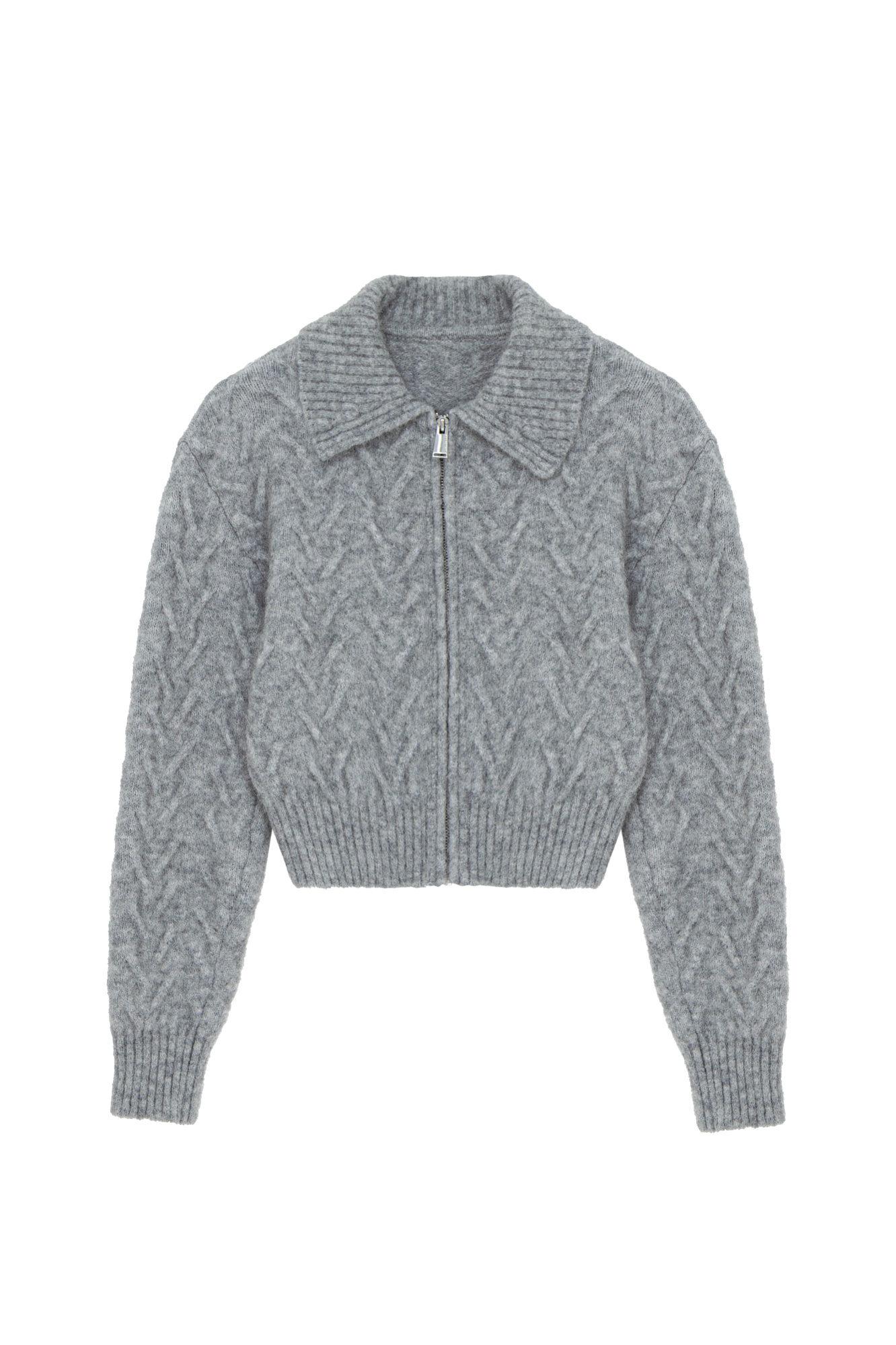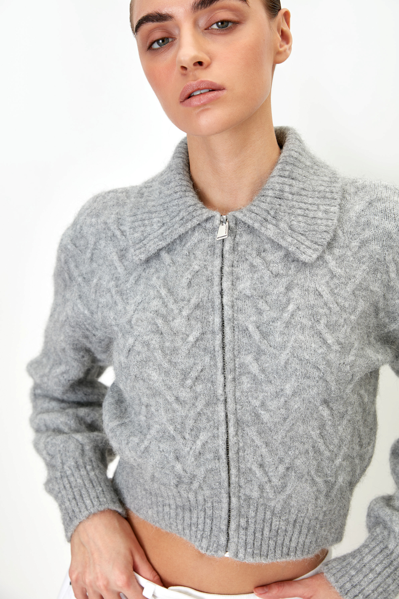 Трикотажный бомбер с добавлением шерсти альпака. Отложной воротник, длинные рукава с эластичными манжетами в рубчик. Застежка на молнию.
