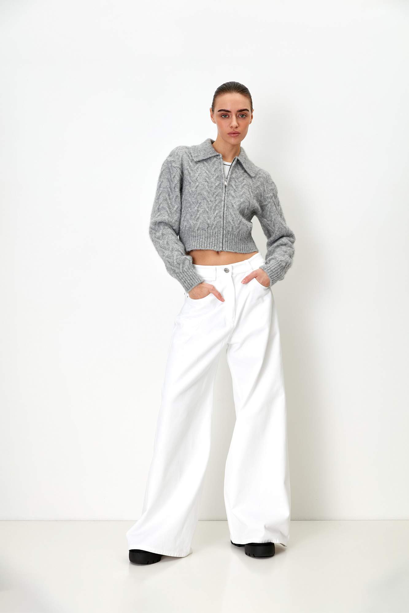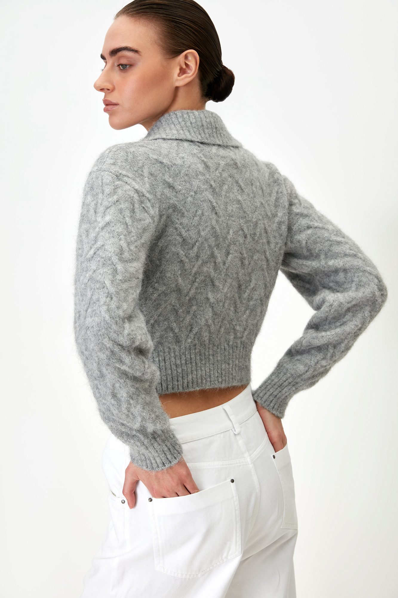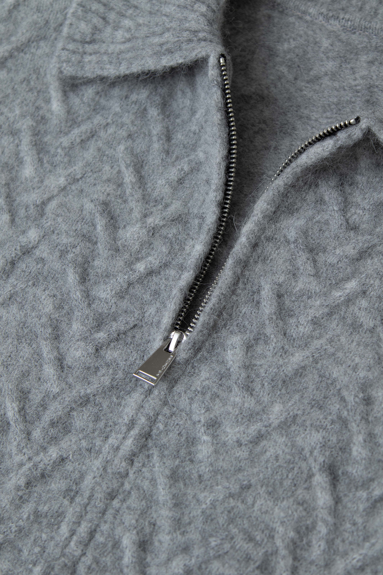 Трикотажный бомбер с добавлением шерсти альпака. Отложной воротник, длинные рукава с эластичными манжетами в рубчик. Застежка на молнию.