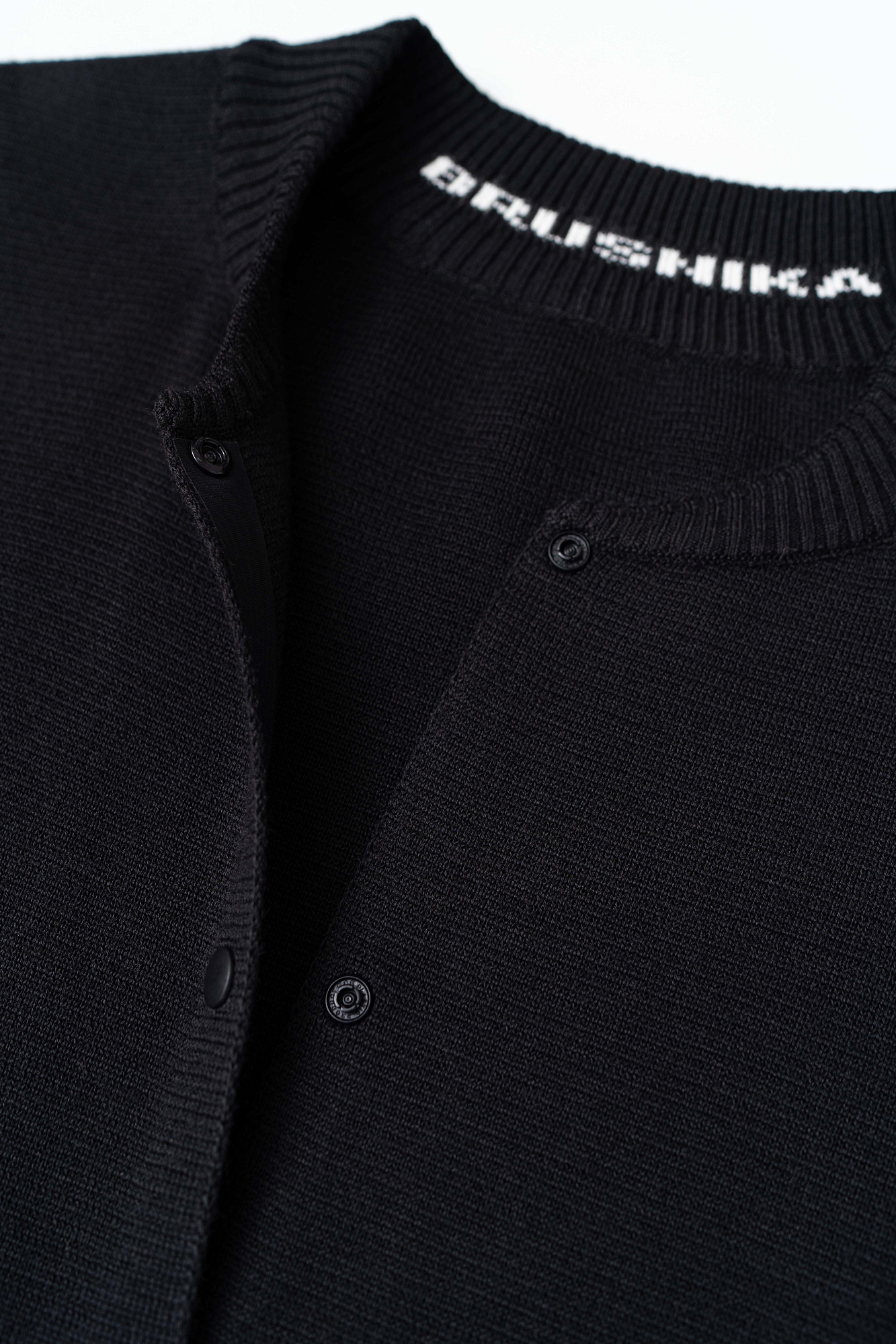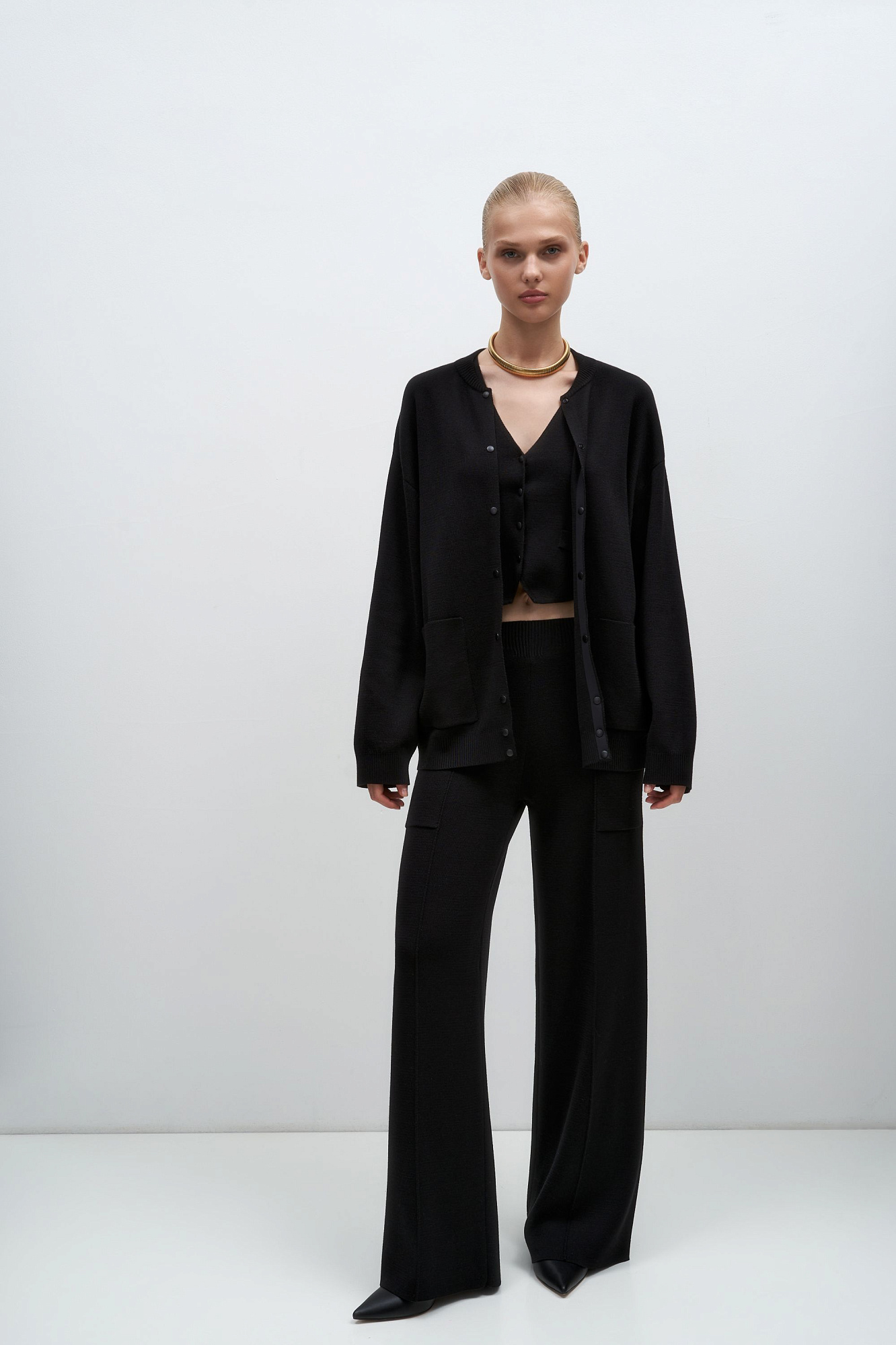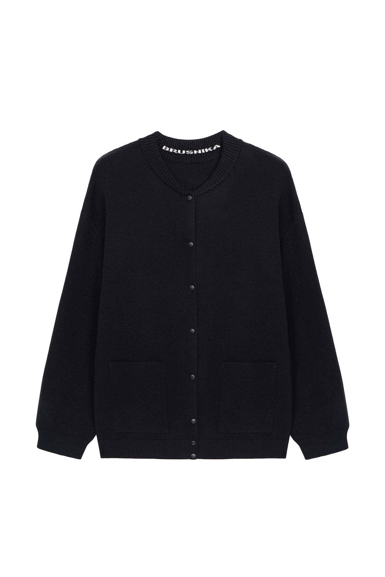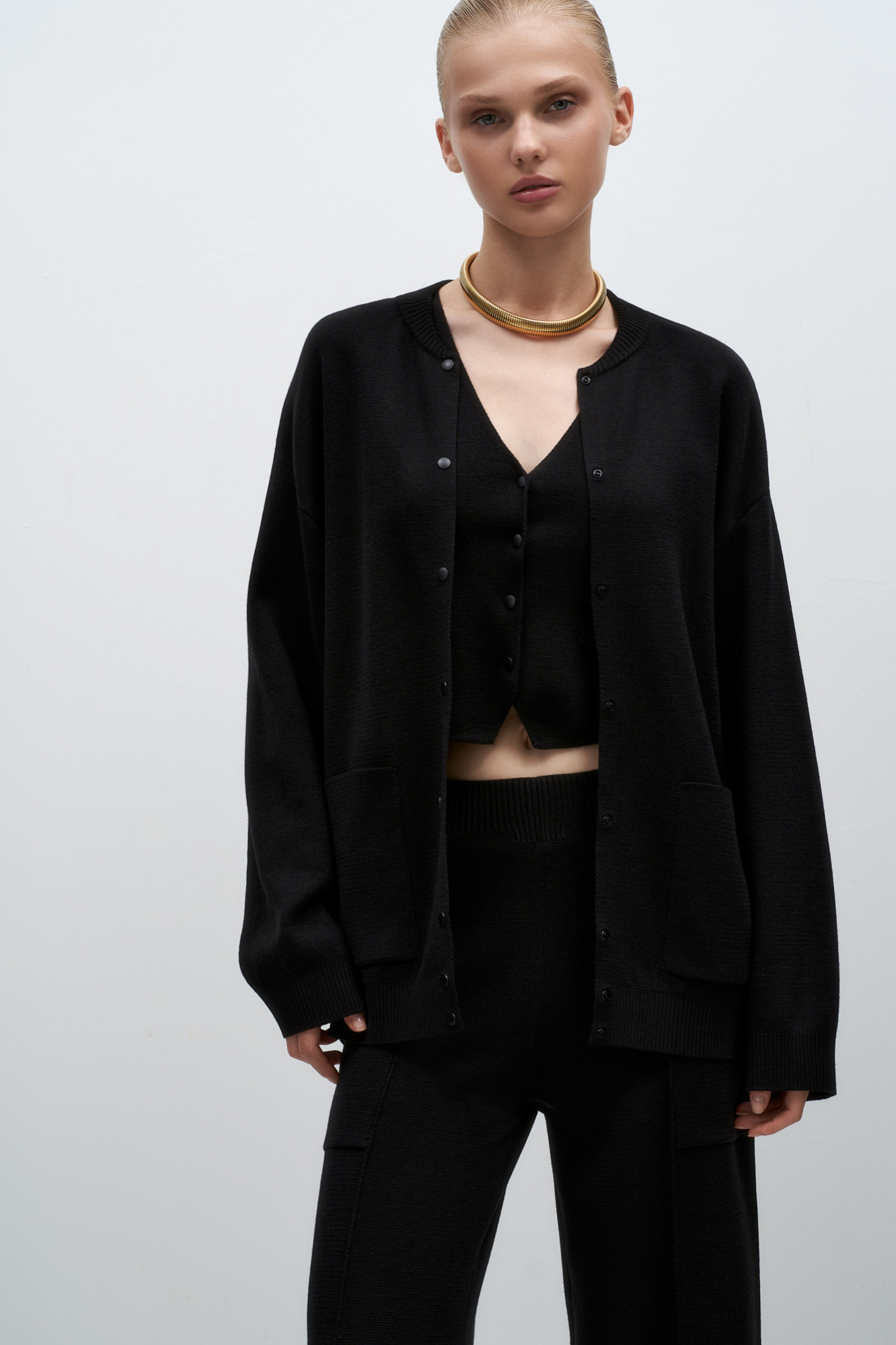 Трикотажный бомбер, в основе из шерсти мериноса. Модель свободного силуэта с накладными карманами и спущенным рукавом. Застежка на кнопки.