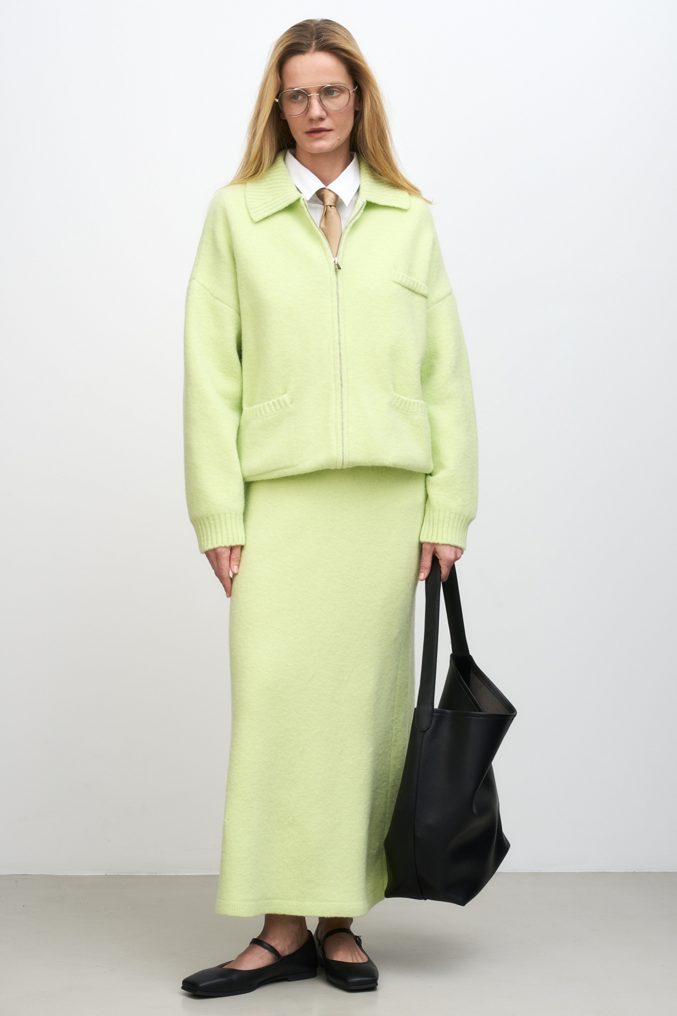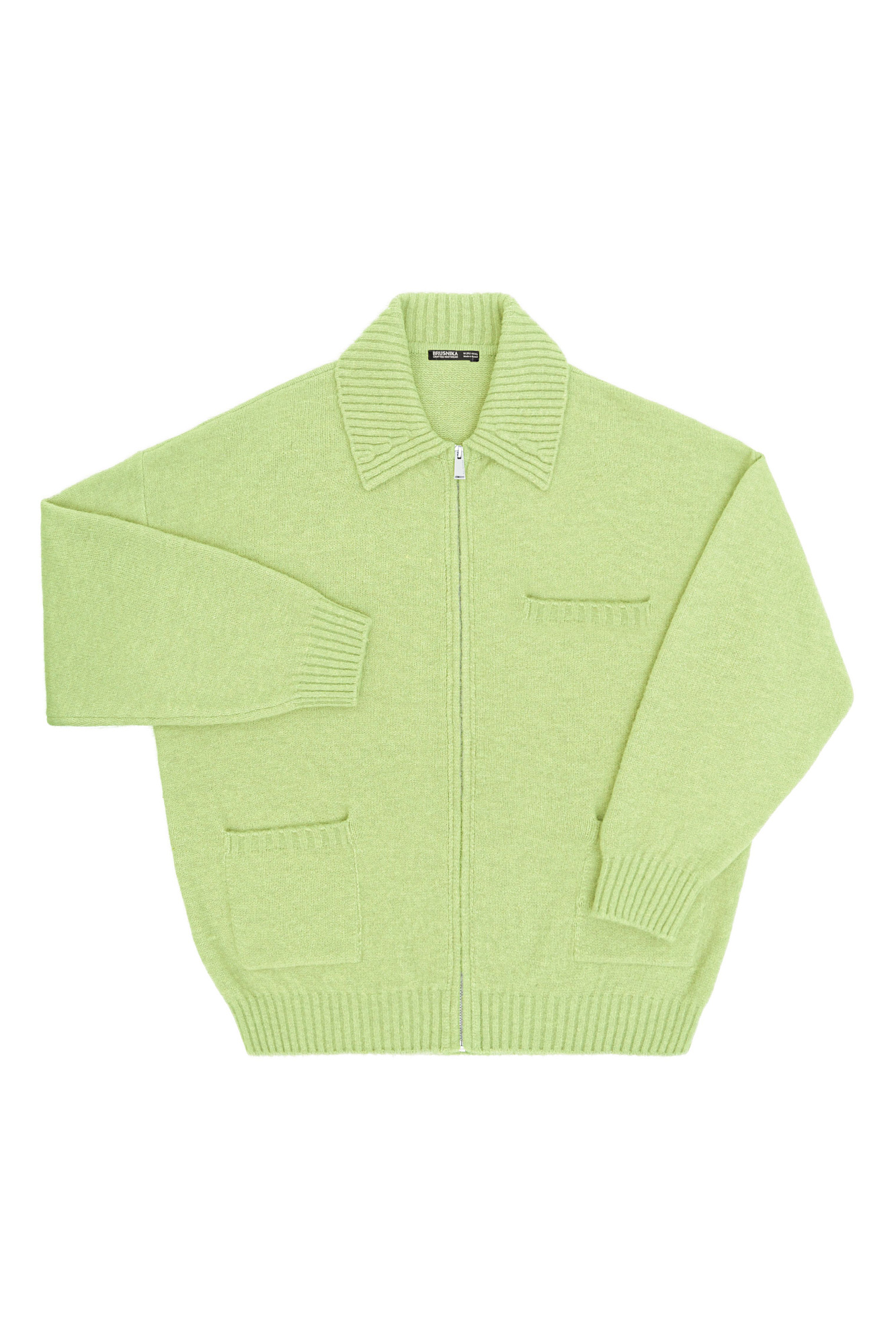 Трикотажный бомбер из шерсти с добавлением мохера. Модель свободного силуэта со спущенной линией плеча, отложным воротником и накладными карманами. Застежка на молнию. Изделие без подкладки.