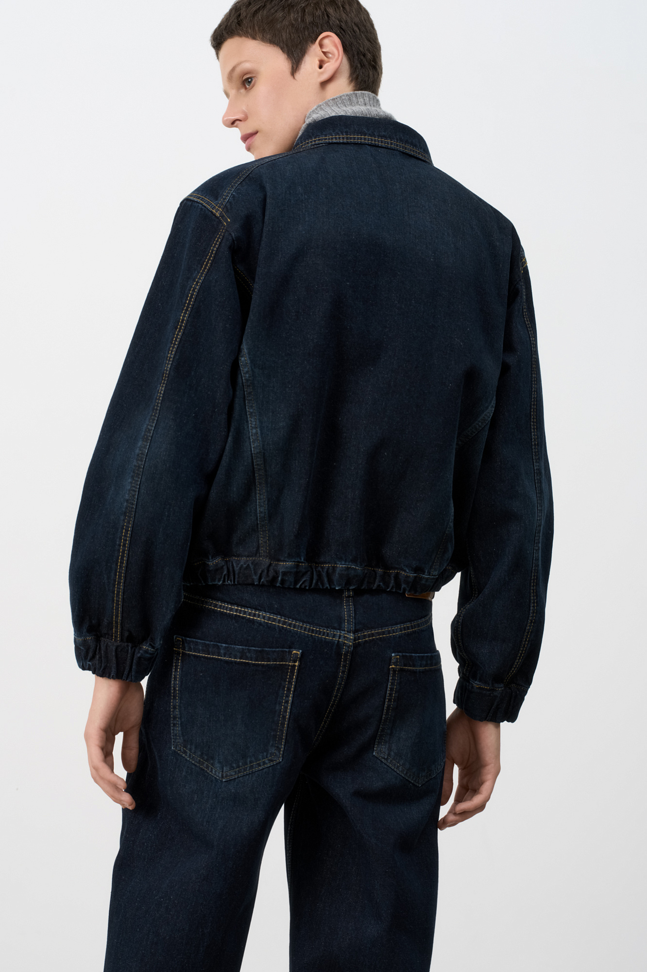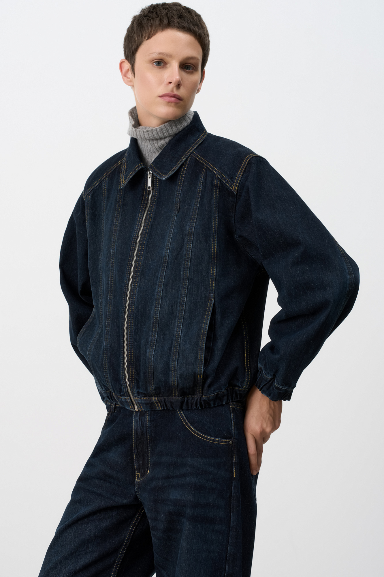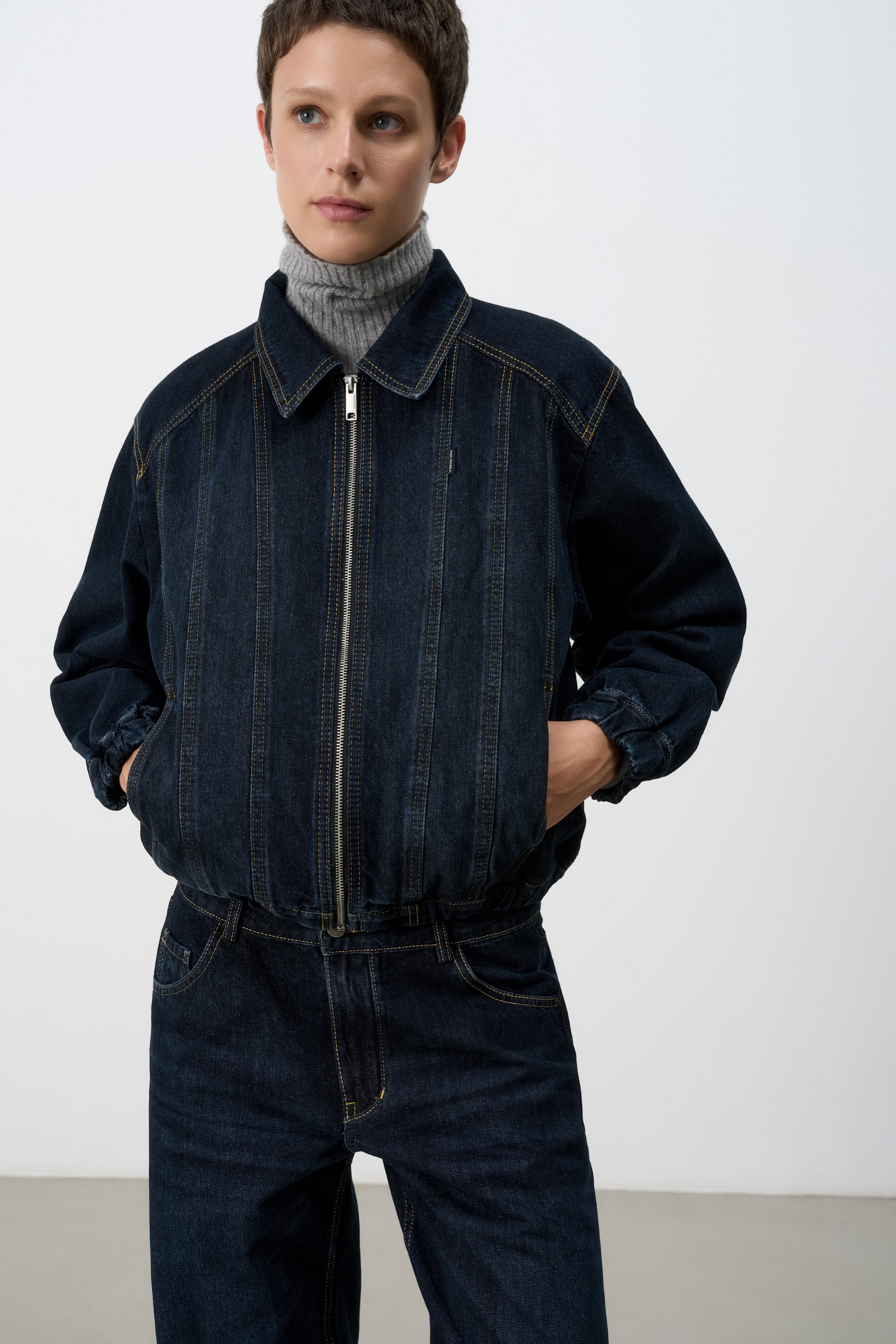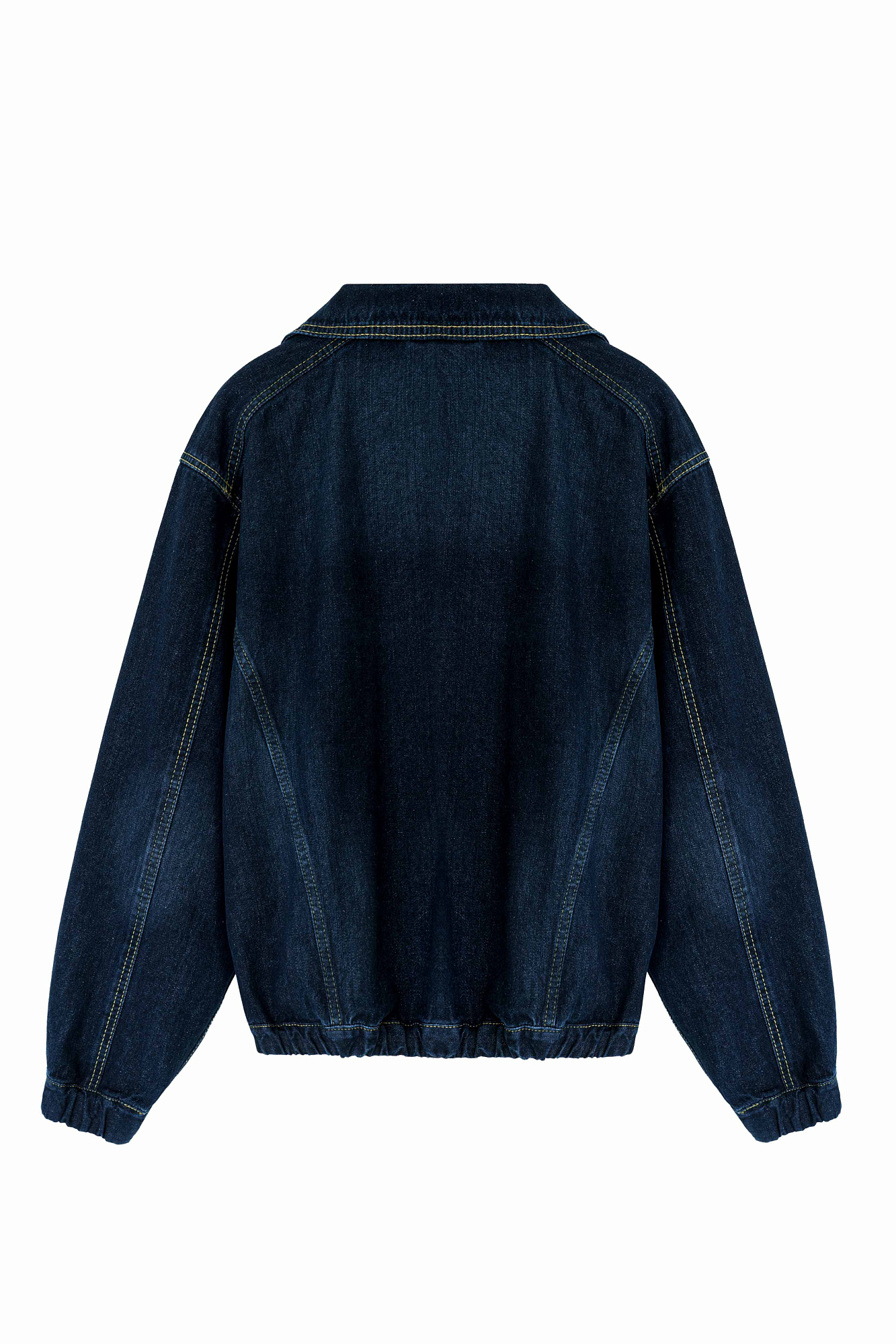 Джинсовый бомбер с манжетами на резинке. Модель свободного силуэта со спущенной линией плеча. Потайные боковые карманы, застежка на молнию.