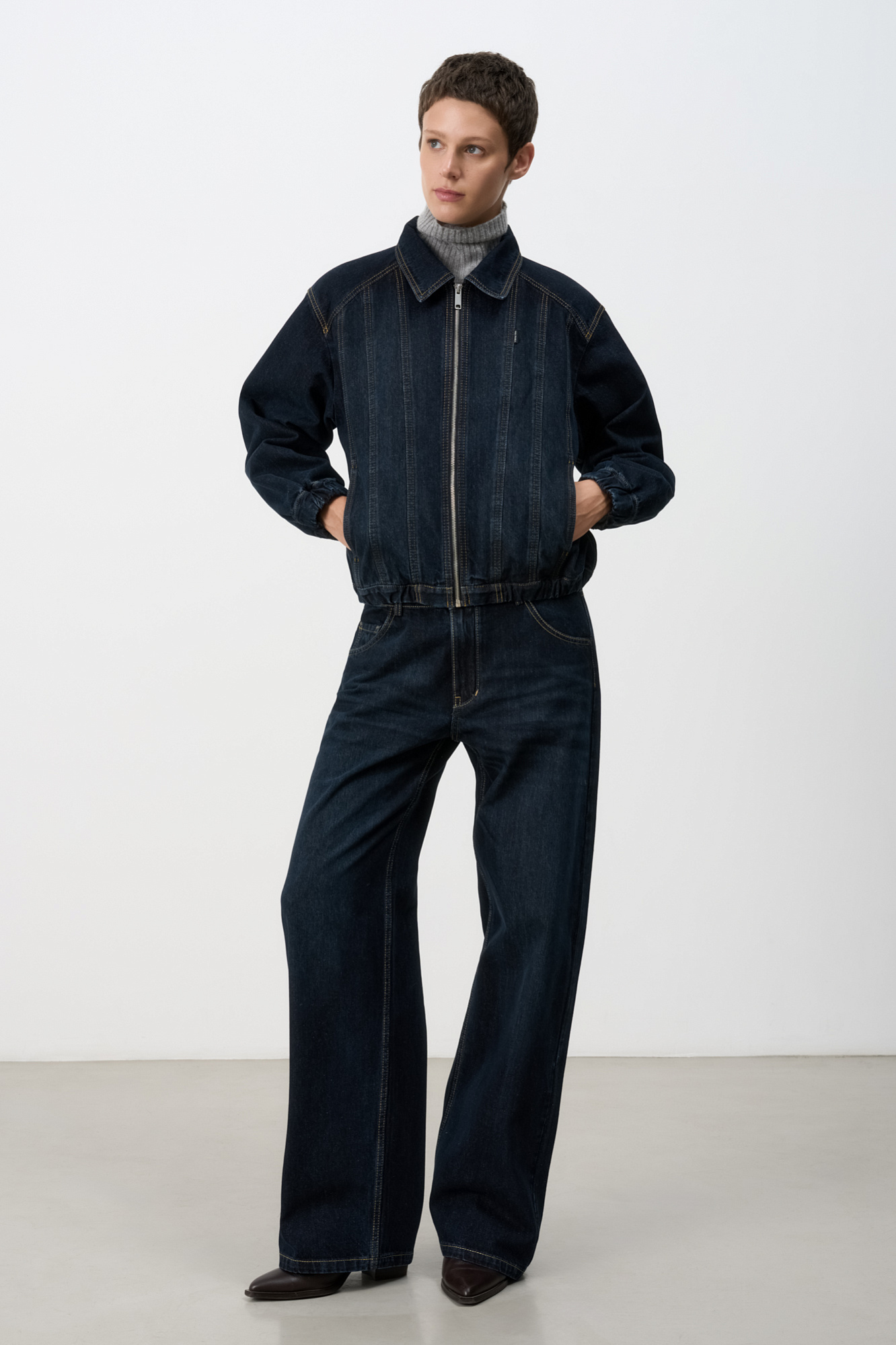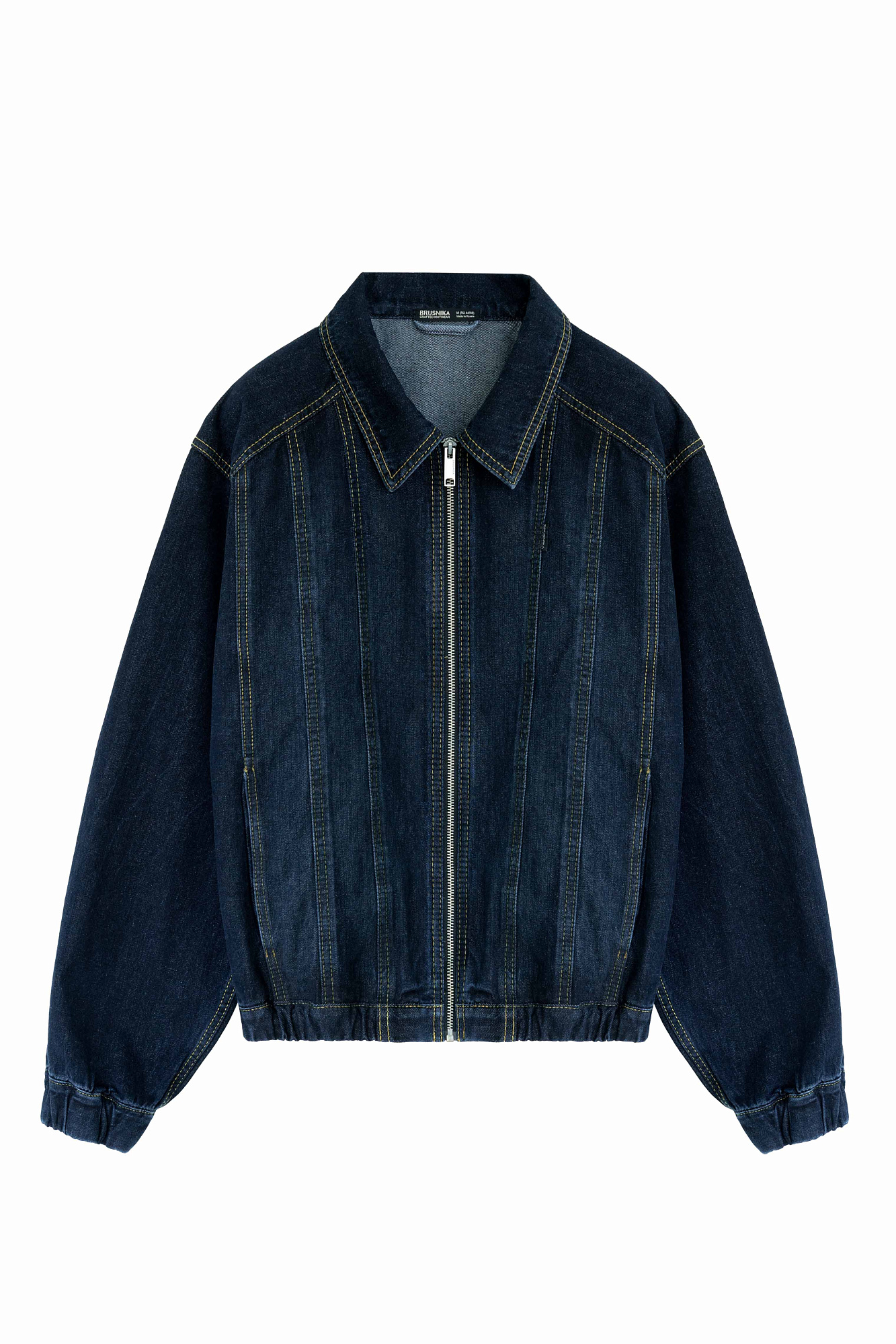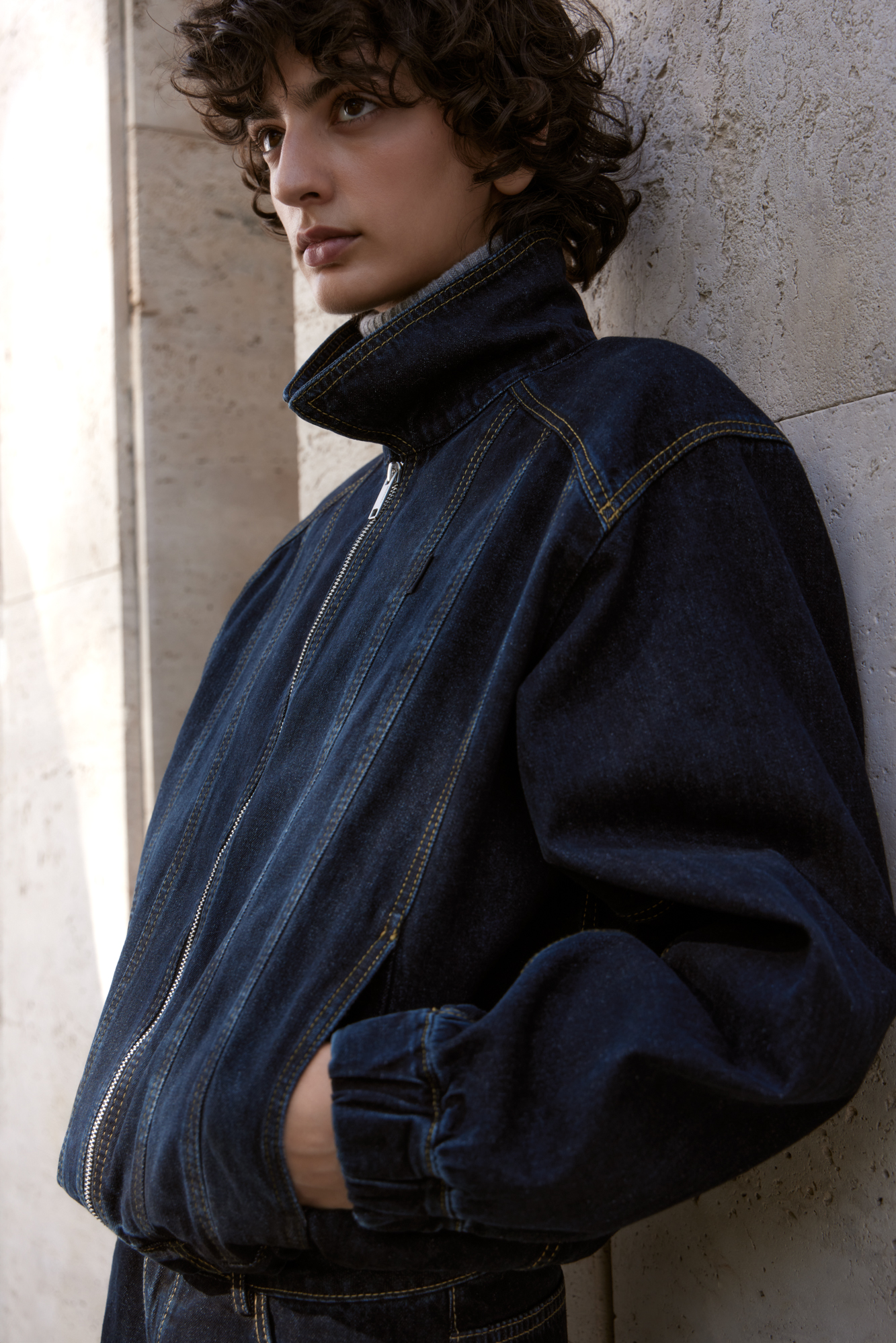 Джинсовый бомбер с манжетами на резинке. Модель свободного силуэта со спущенной линией плеча. Потайные боковые карманы, застежка на молнию.