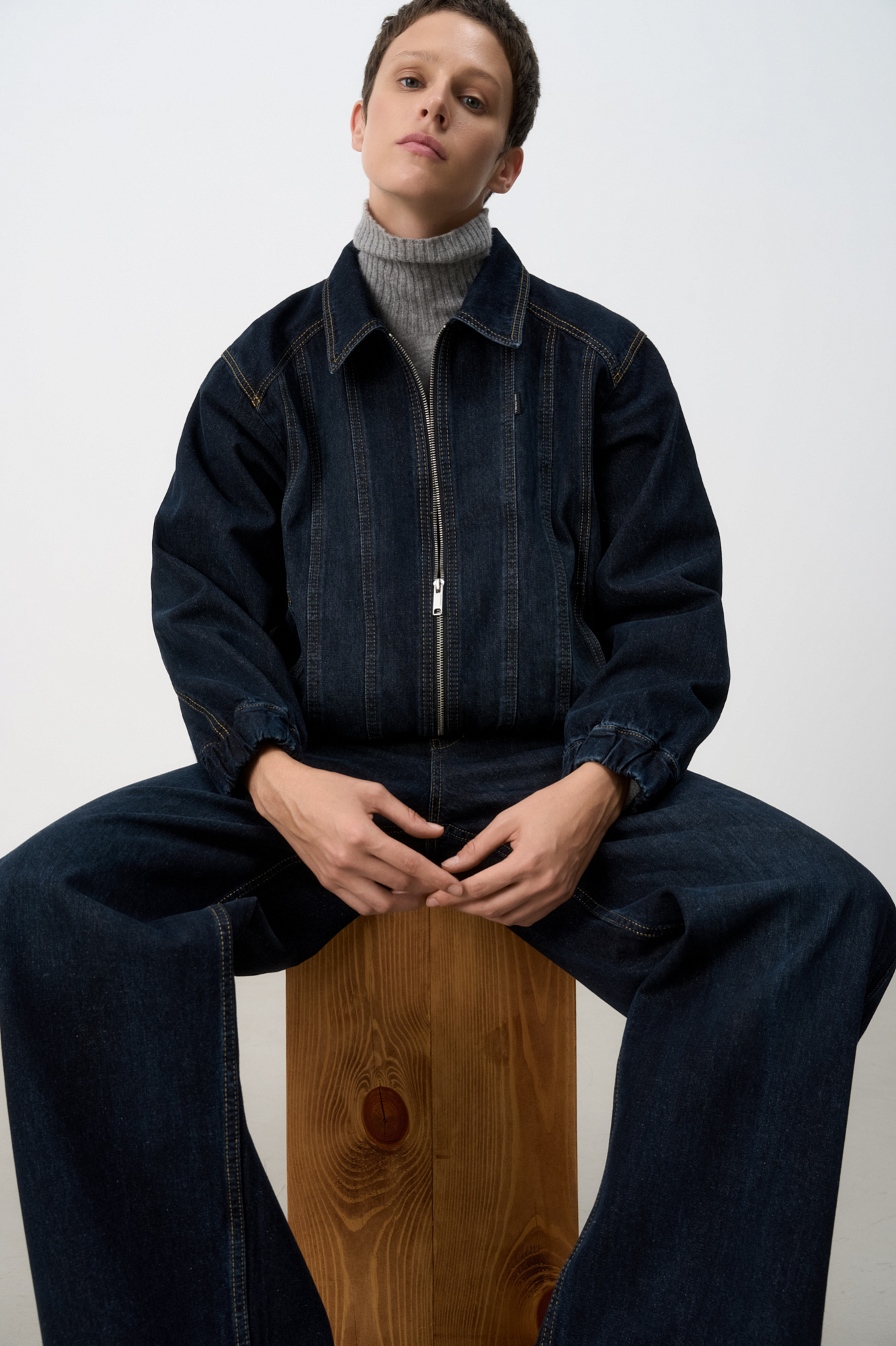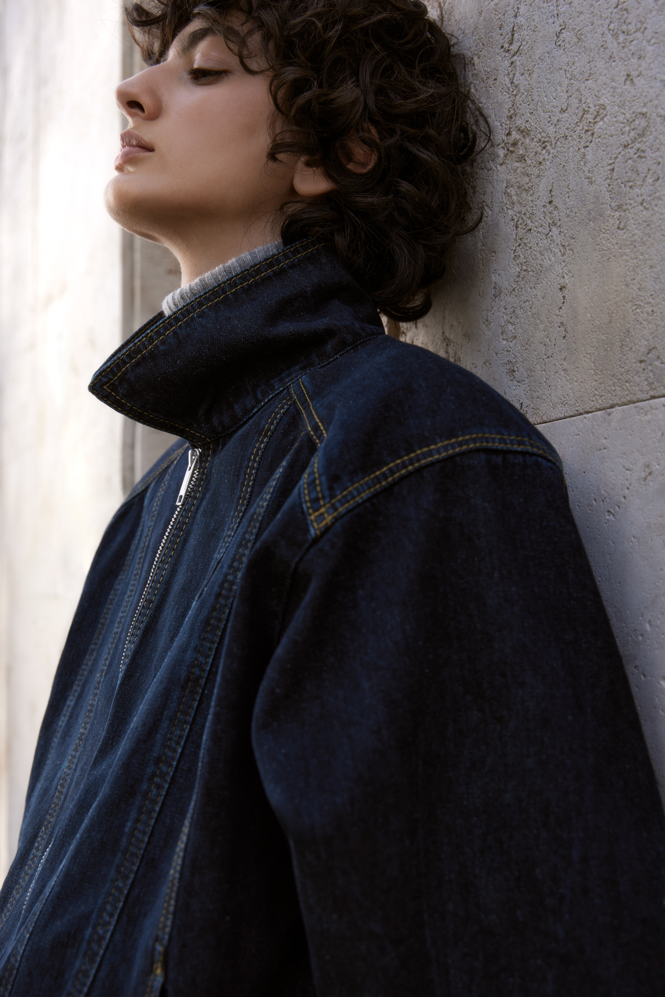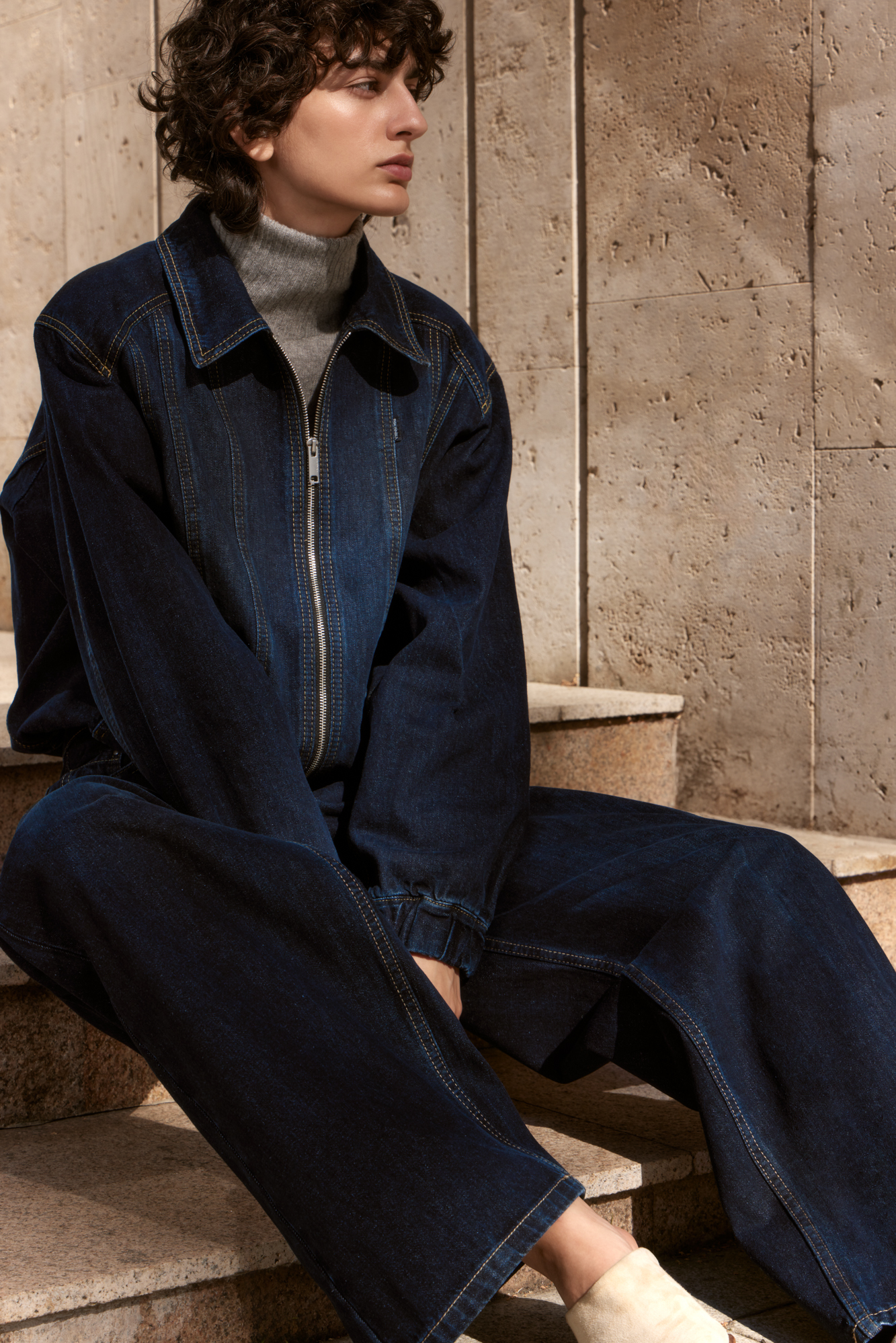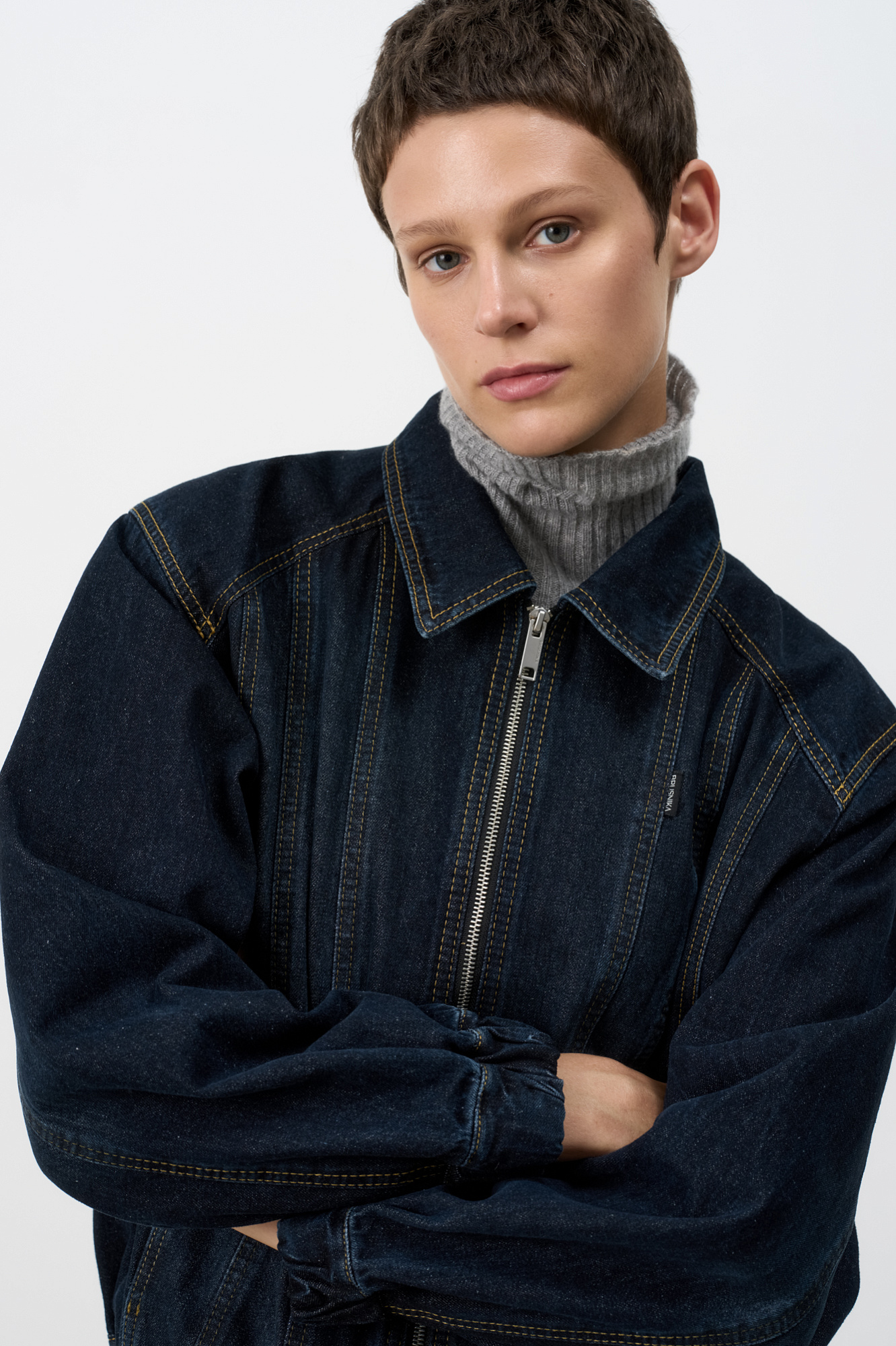 Джинсовый бомбер с манжетами на резинке. Модель свободного силуэта со спущенной линией плеча. Потайные боковые карманы, застежка на молнию.