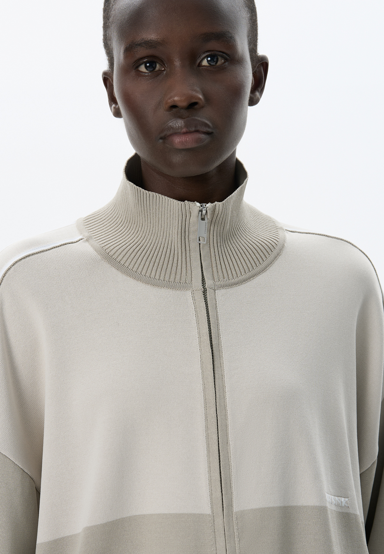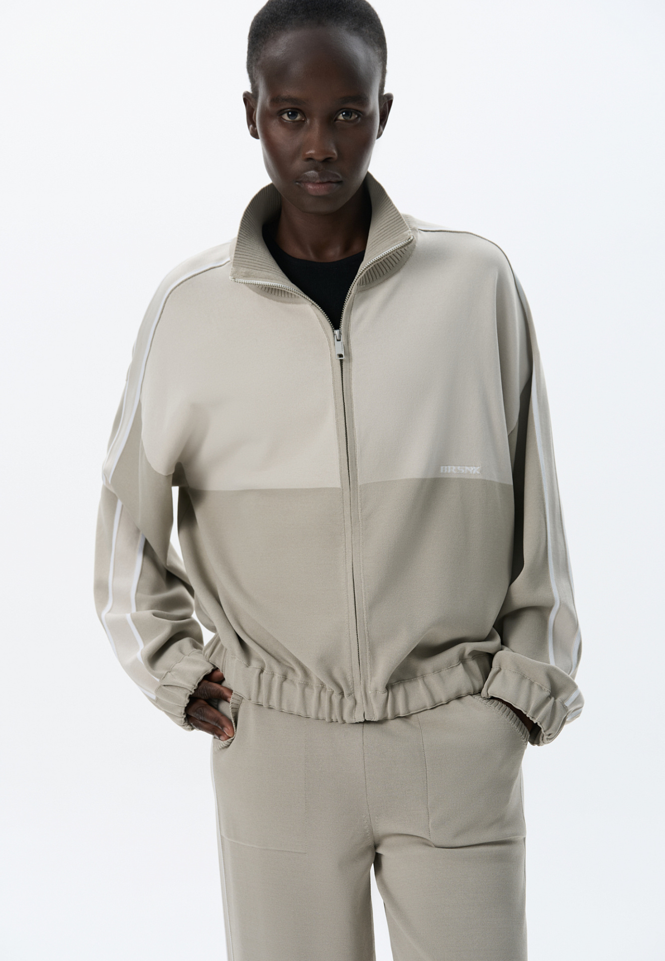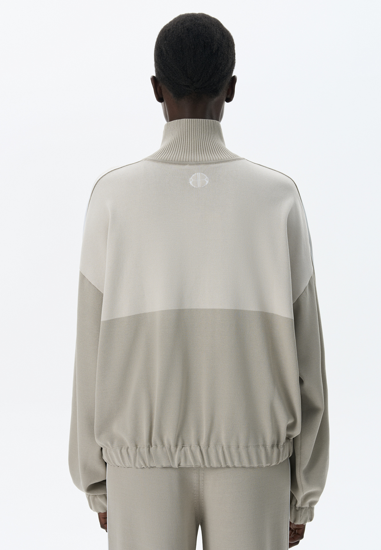 Трикотажный спортивный бомбер из вискозы. Модель прямого силуэта, со спущенной линией плеч, длинными рукавами с широкими лампасами и невысоким воротником-стойкой. Низ изделия и манжеты рукавов выполнены на резинке. Застежка на молнию. Брендированный жаккард на спине.
