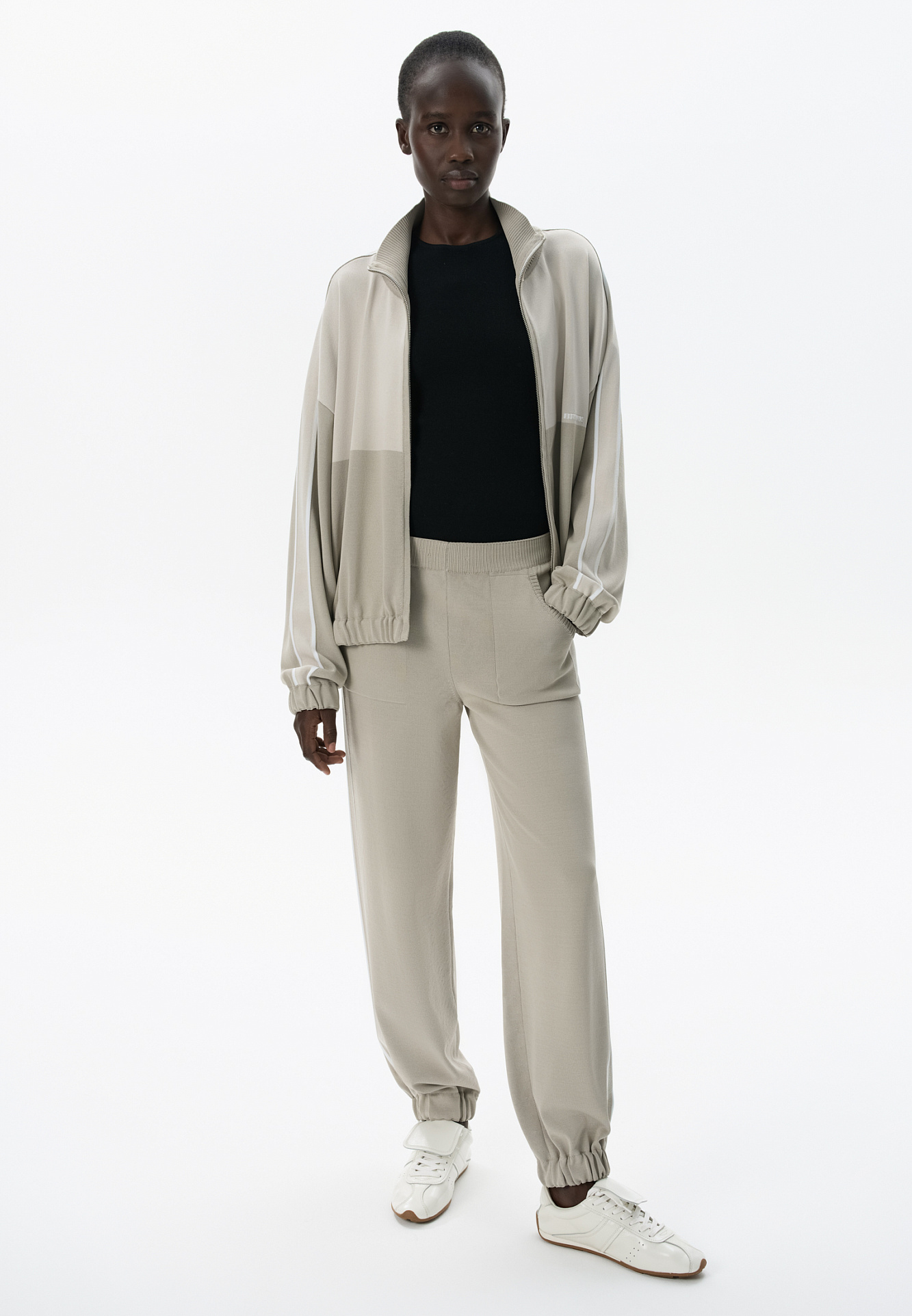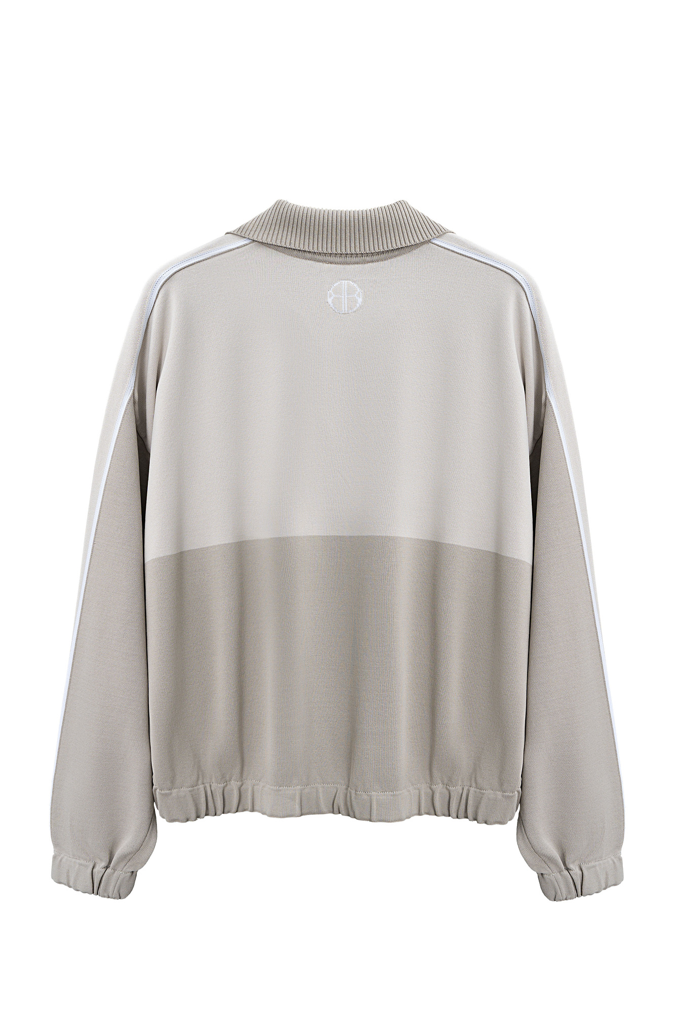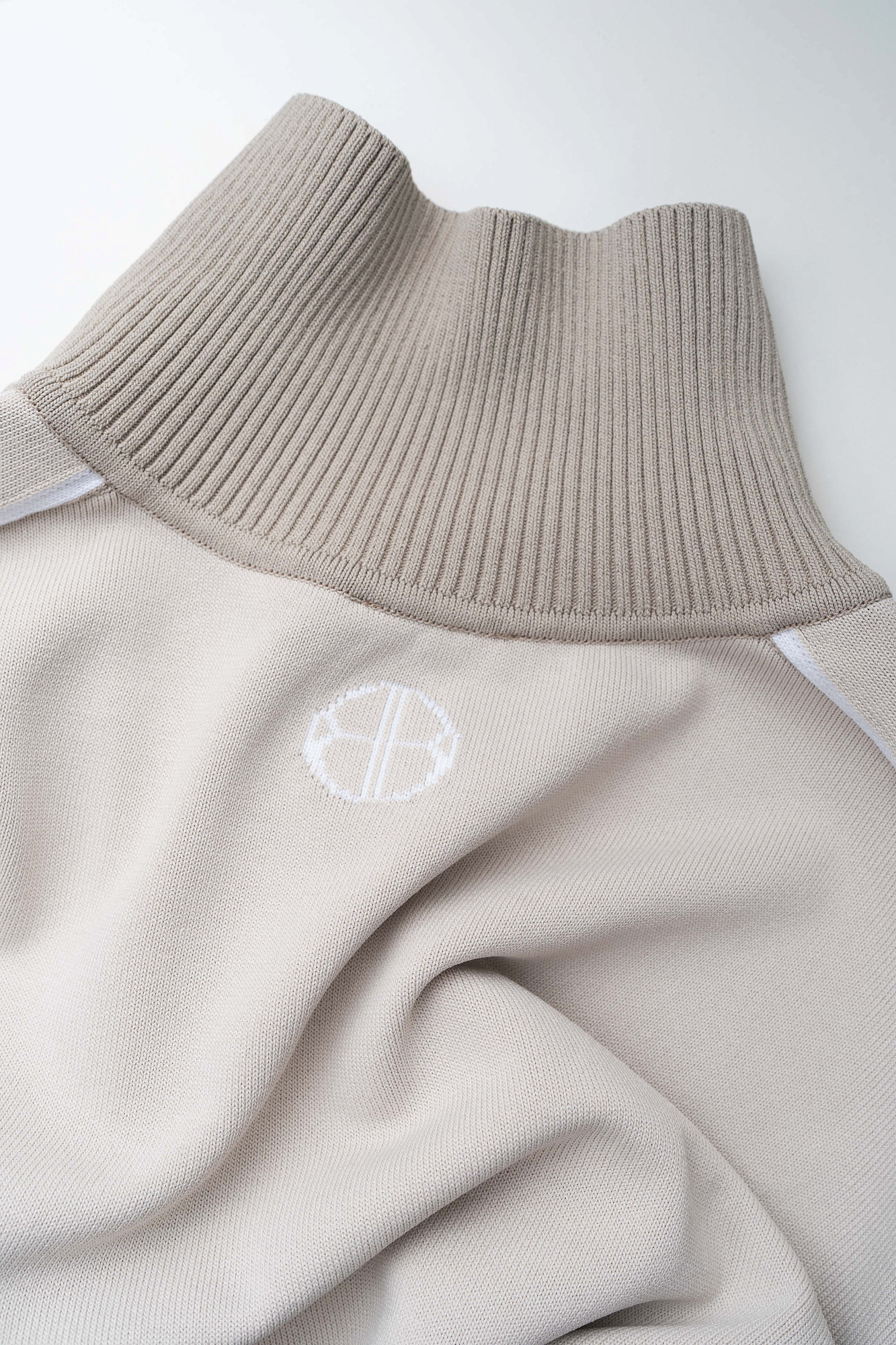 Трикотажный спортивный бомбер из вискозы. Модель прямого силуэта, со спущенной линией плеч, длинными рукавами с широкими лампасами и невысоким воротником-стойкой. Низ изделия и манжеты рукавов выполнены на резинке. Застежка на молнию. Брендированный жаккард на спине.