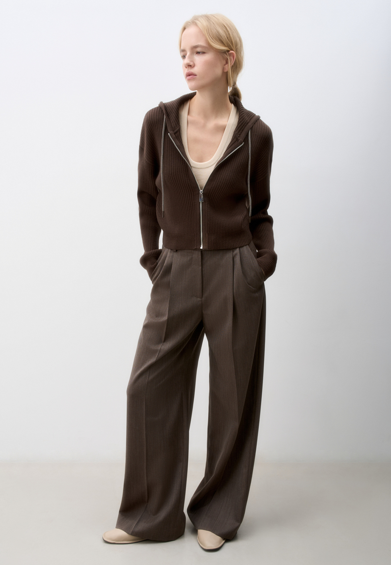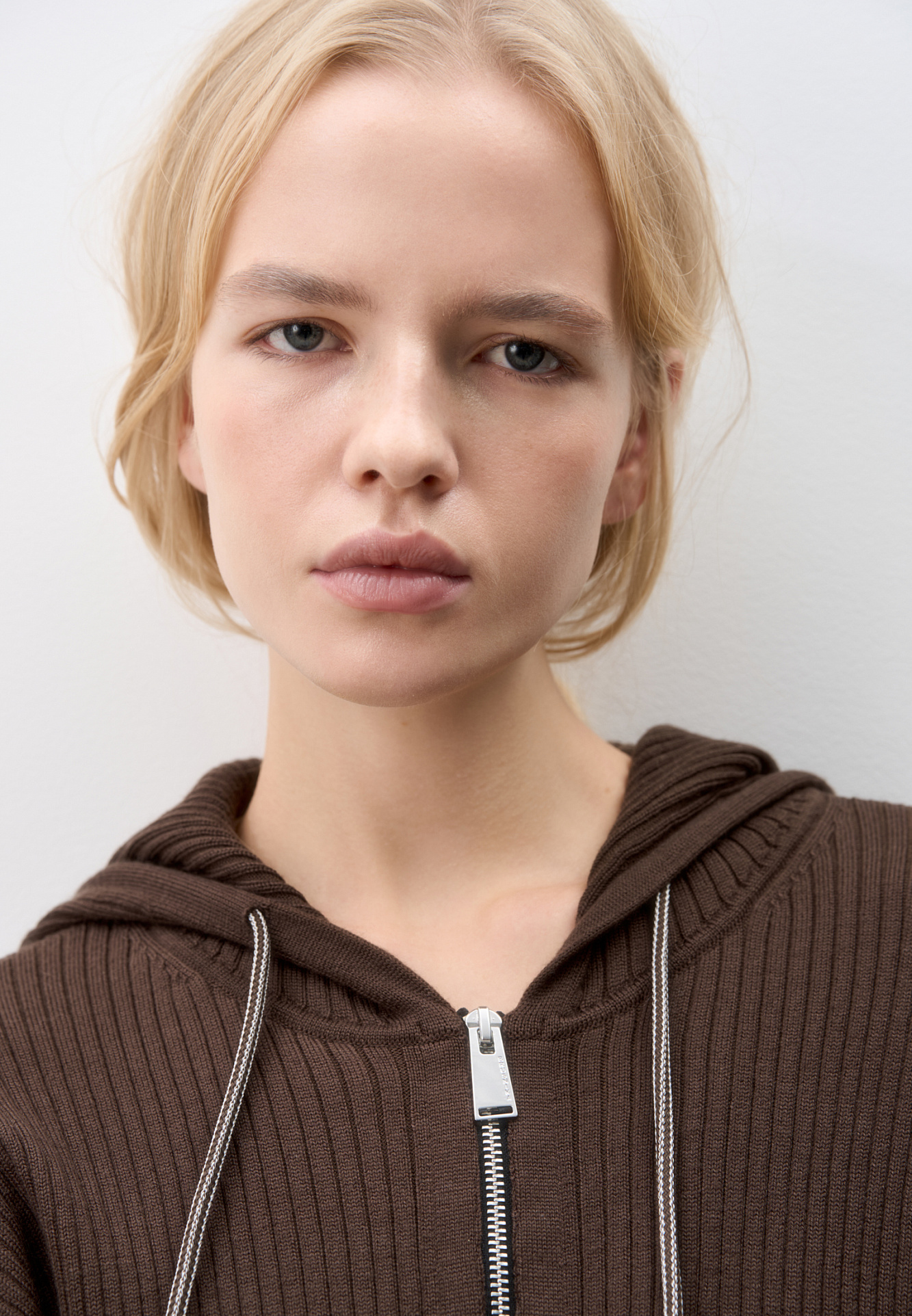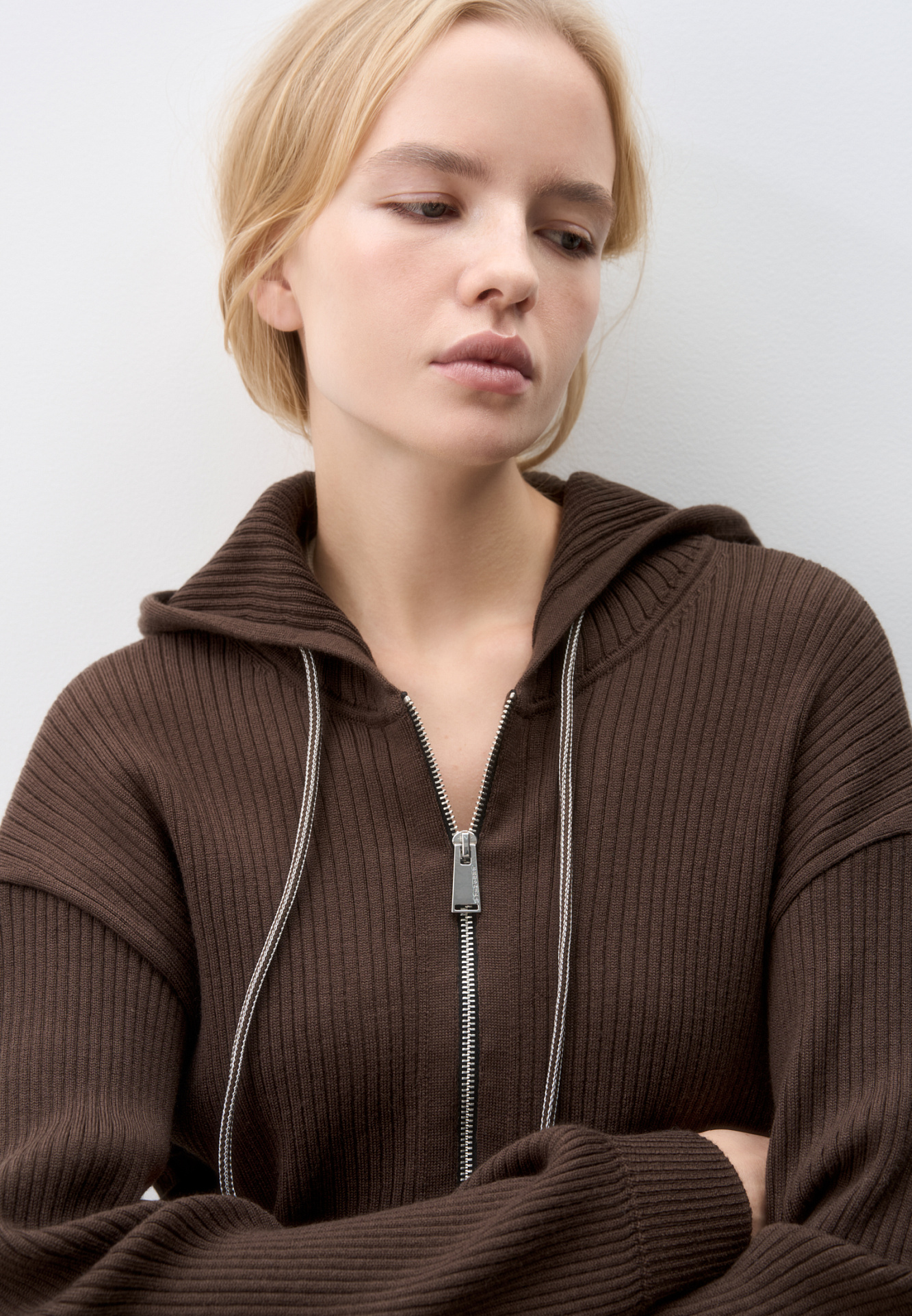 Короткий трикотажный бомбер из шерсти. Модель свободного силуэта, со спущенной линией пллеч, длинными рукавами и капюшоном с кулиской. Низ изделия и манжеты рукавов выполнены на эластичной резинке. Застежка на молнию.