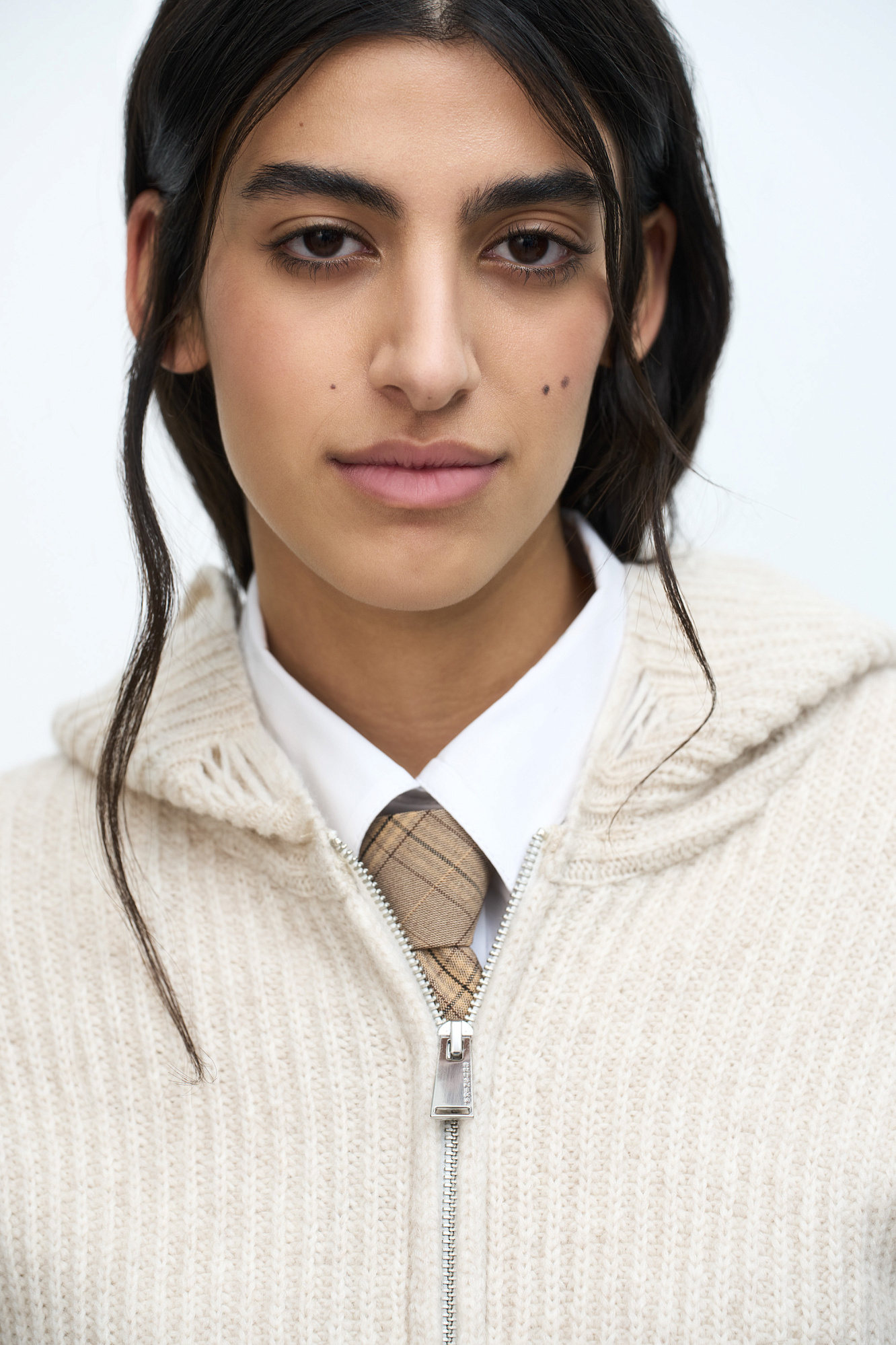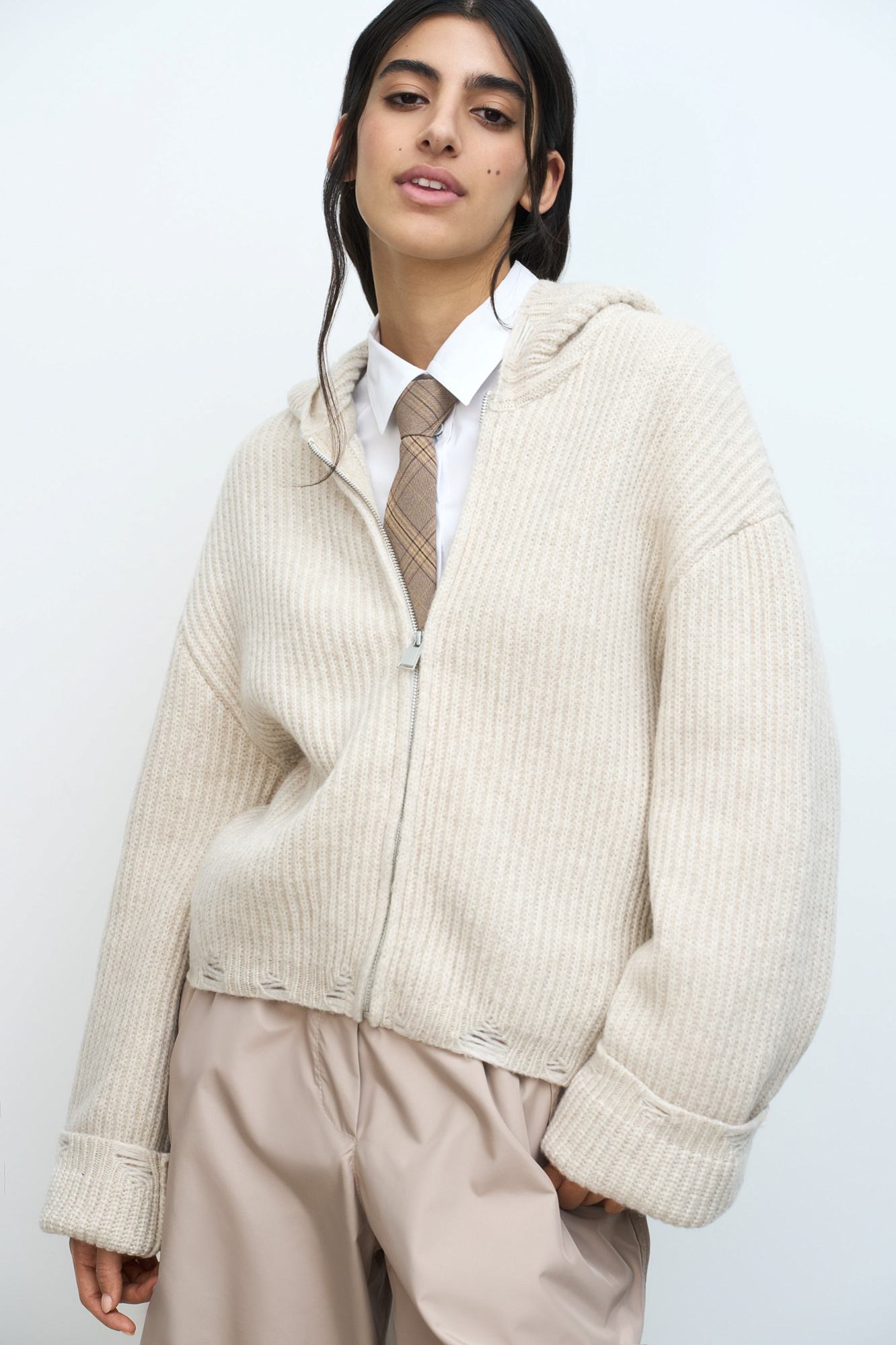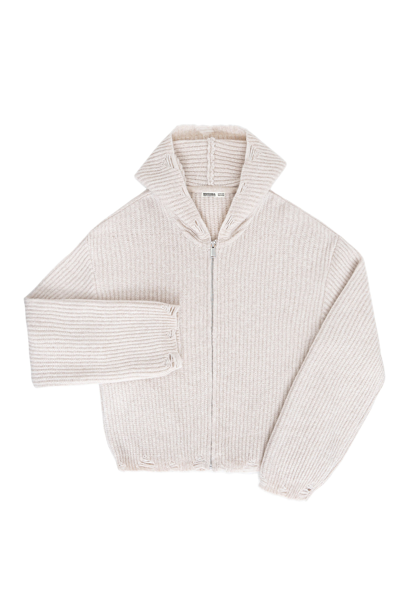 Трикотажное худи из шерсти мериноса. Модель свободного силуэта с разрезами в стиле гранж, длинными рукавами и капюшоном. Застежка на молнию.