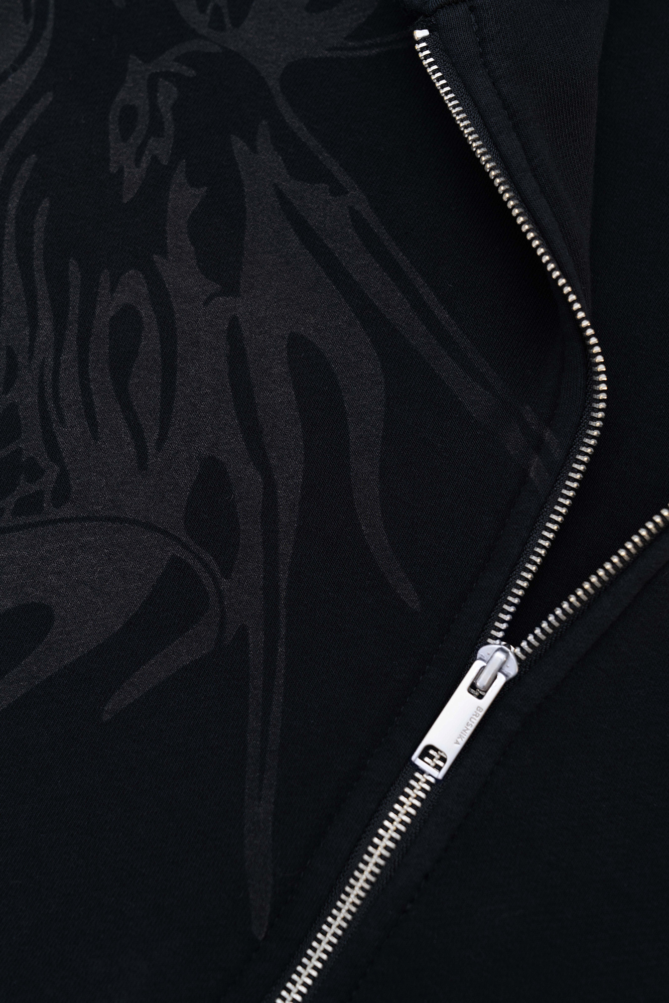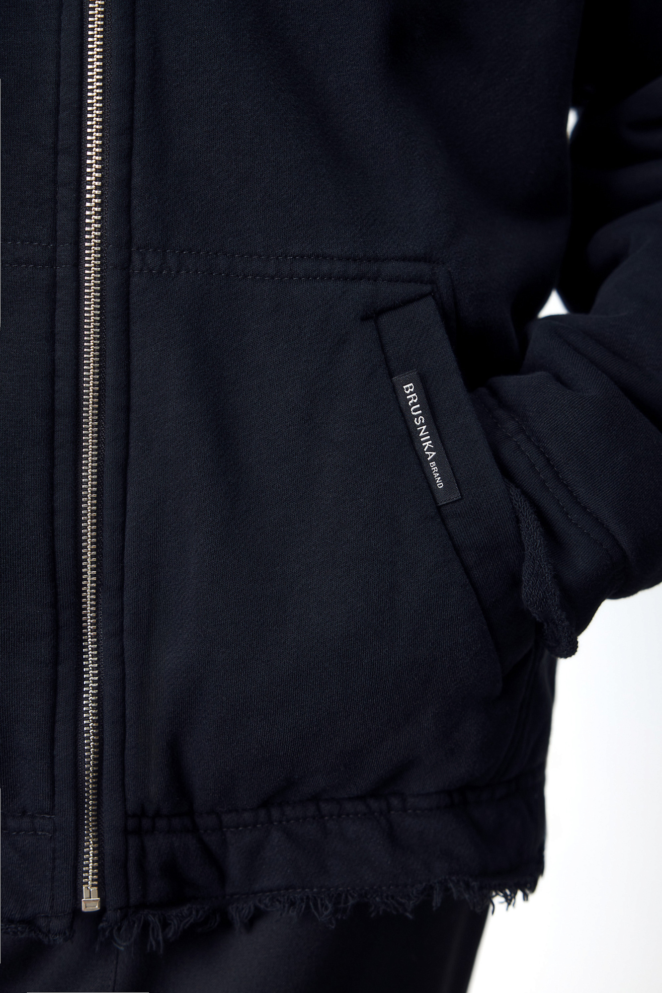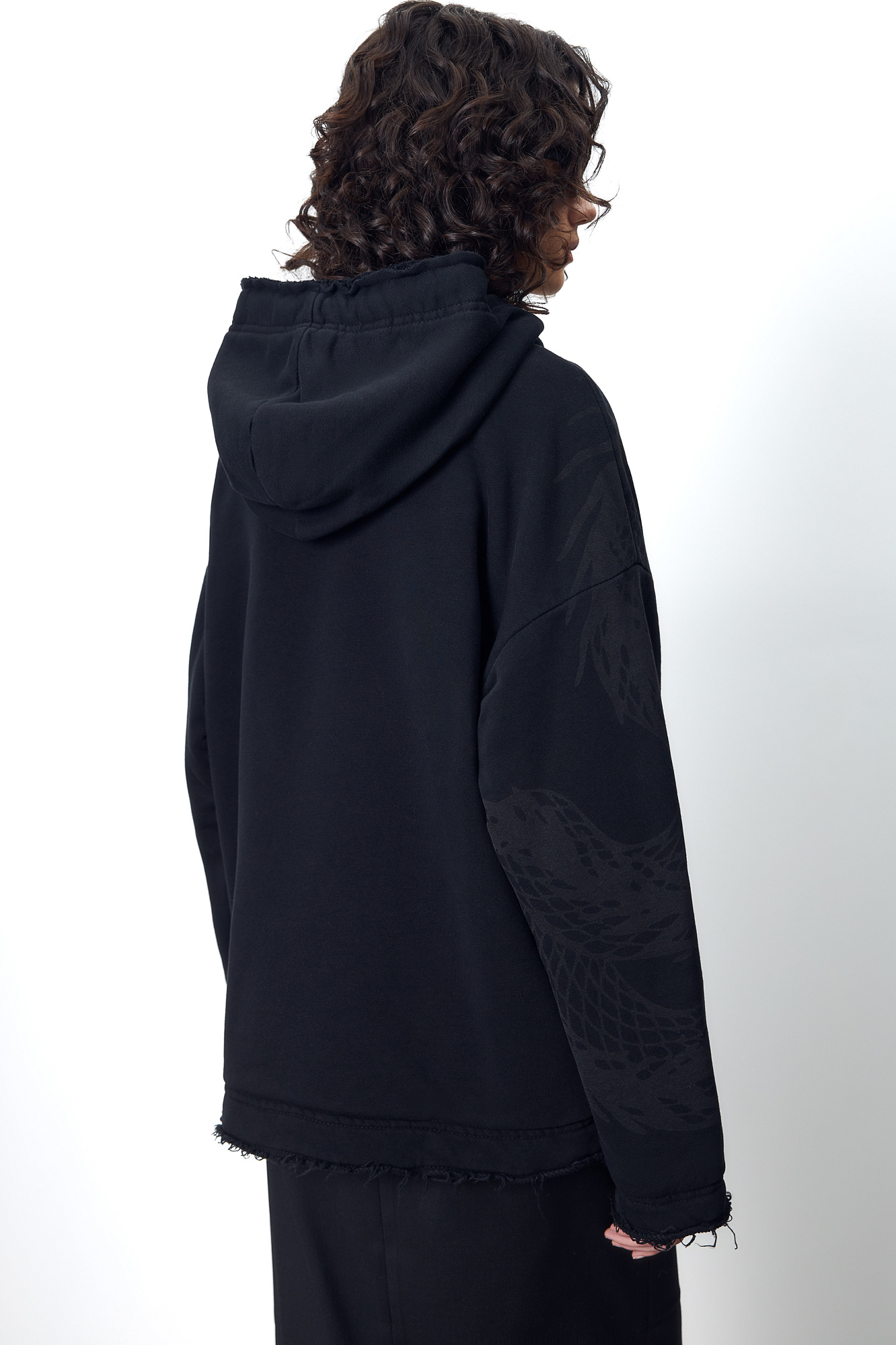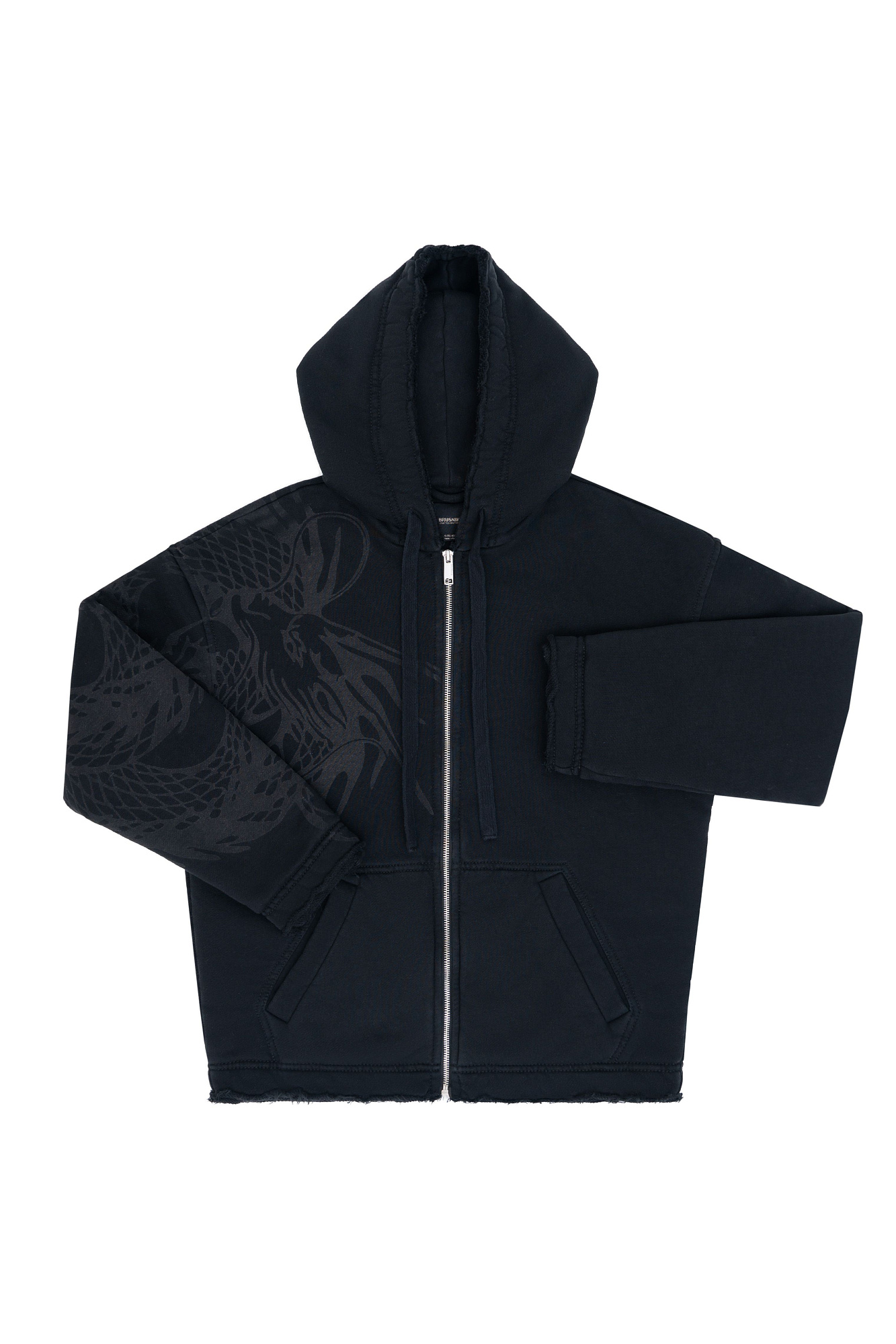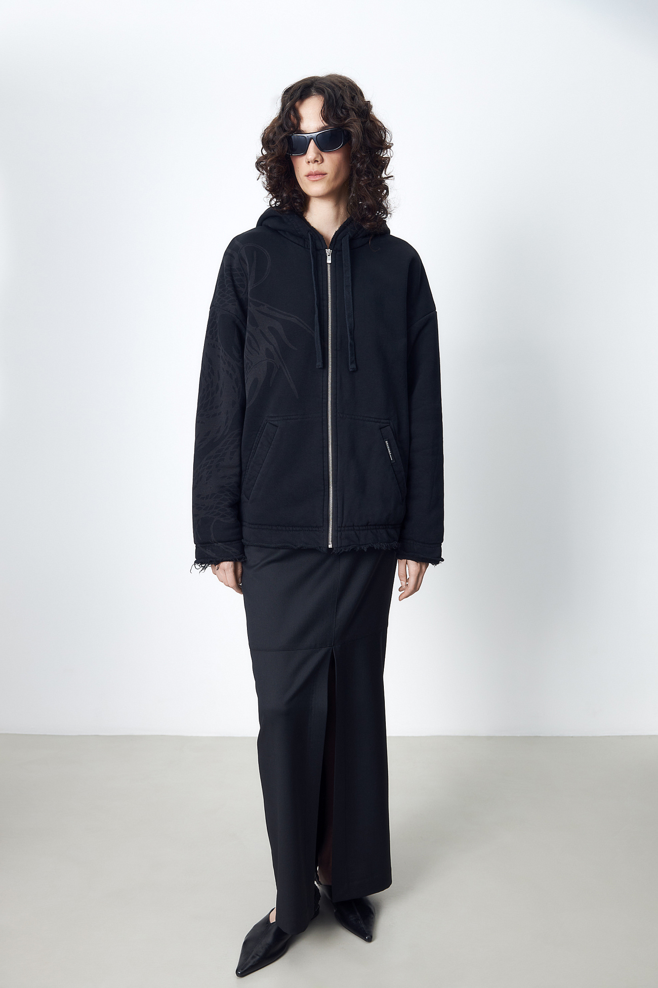 Бомбер с принтом на плече. Модель свободного силуэта со спущенной линией плеча и необработанными краями. Боковые карманы, капюшон на кулиске и застежка на молнию.