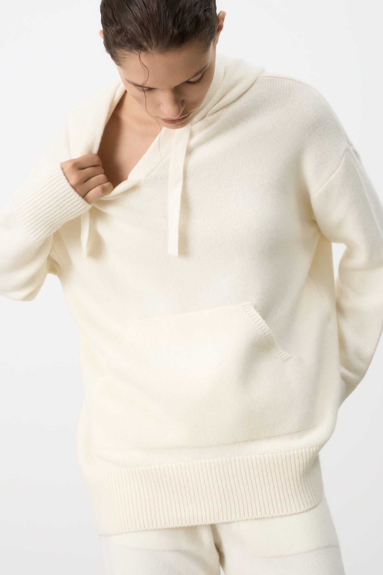 Трикотажное худи из кашемира и шерсти. Модель свободного силуэта, со спущенной линией плеч, глубоким капюшоном на кулиске и карманом-кенгуру. Края изделия выполнены в рубчик.