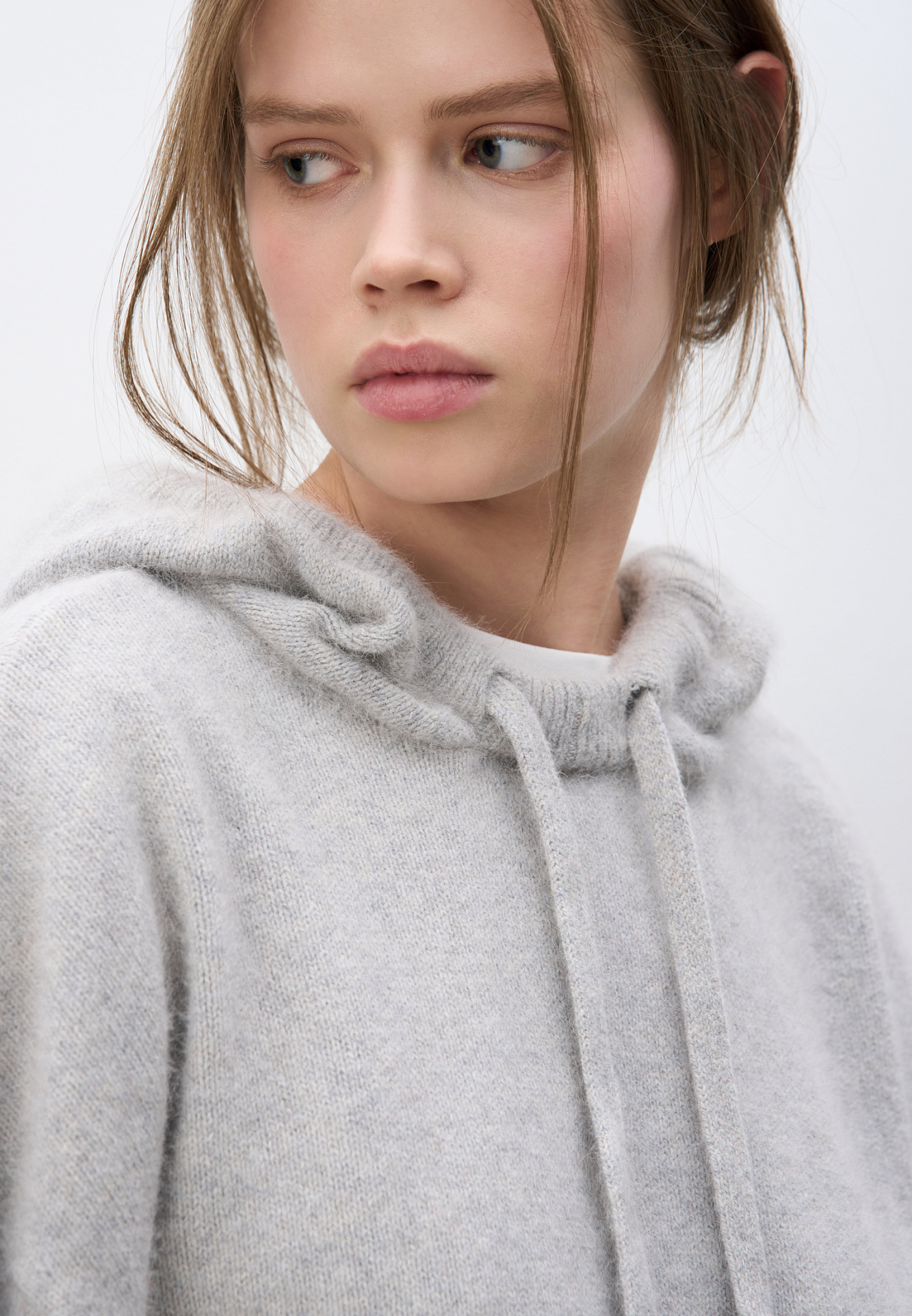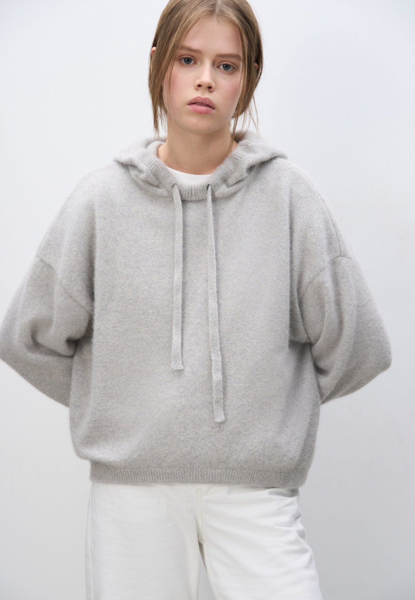 Трикотажное худи из пуха лисы. Модель свободного силуэта с капюшоном и спущенной линией плеча.