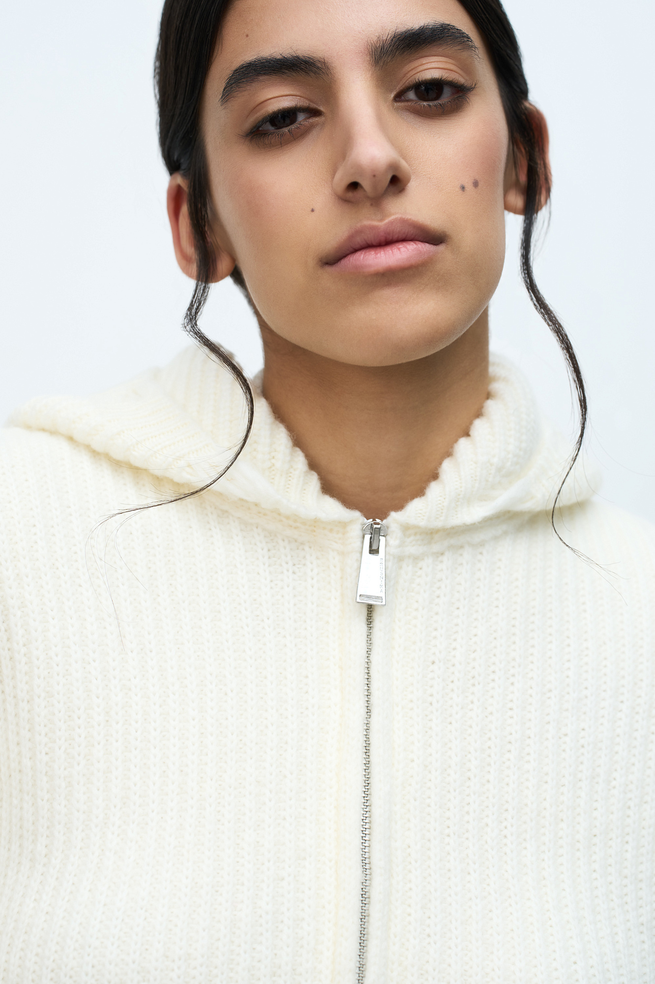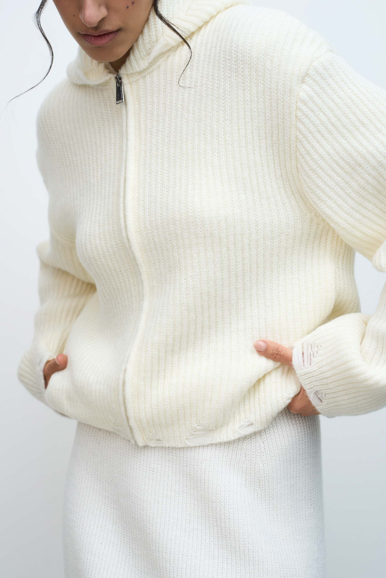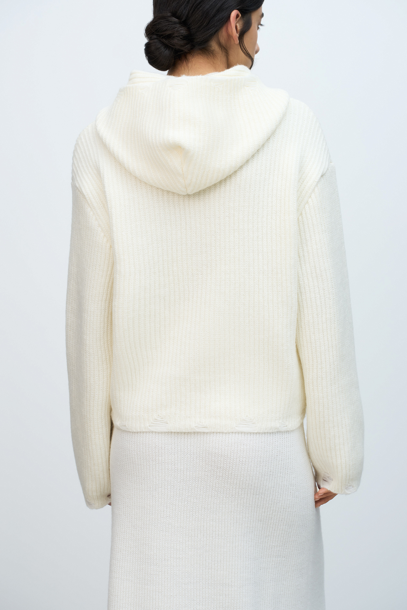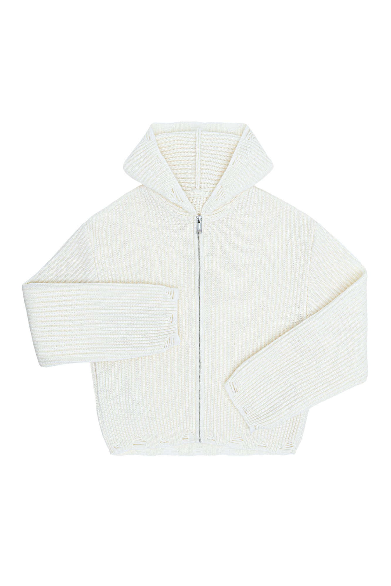 Трикотажное худи из шерсти мериноса. Модель свободного силуэта с разрезами в стиле гранж, длинными рукавами и капюшоном. Застежка на молнию.