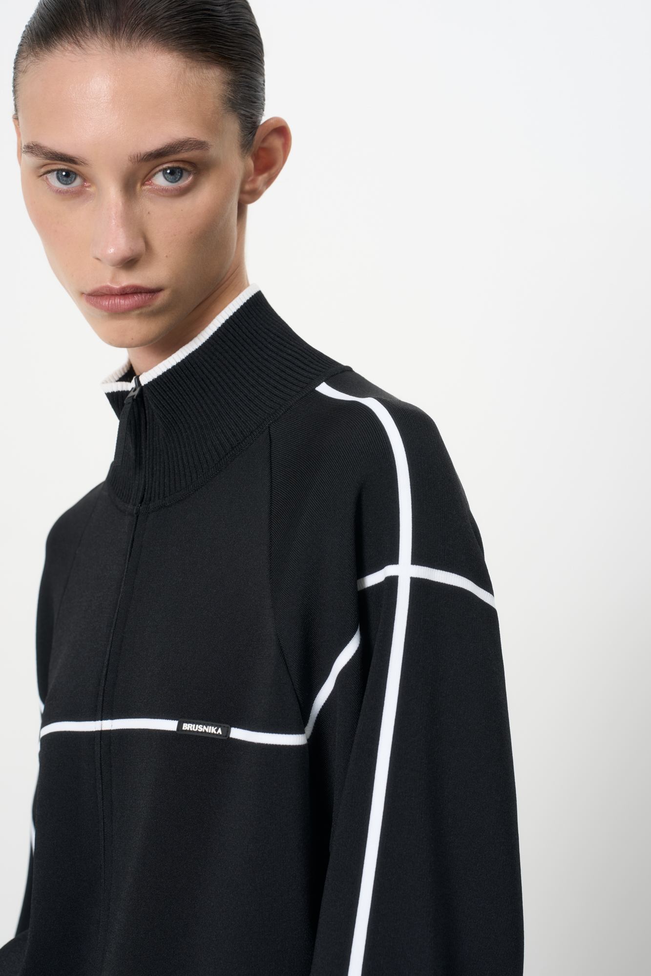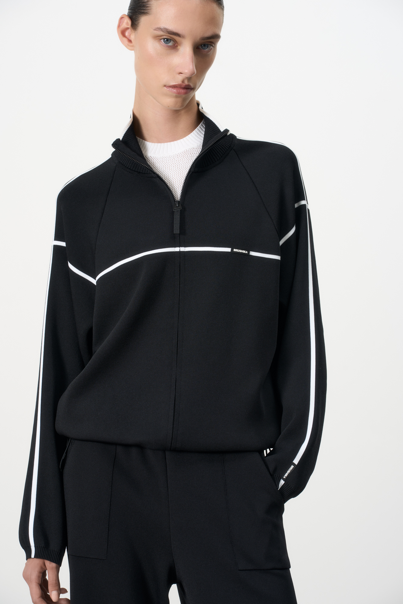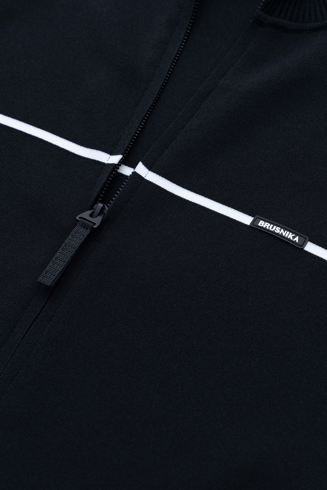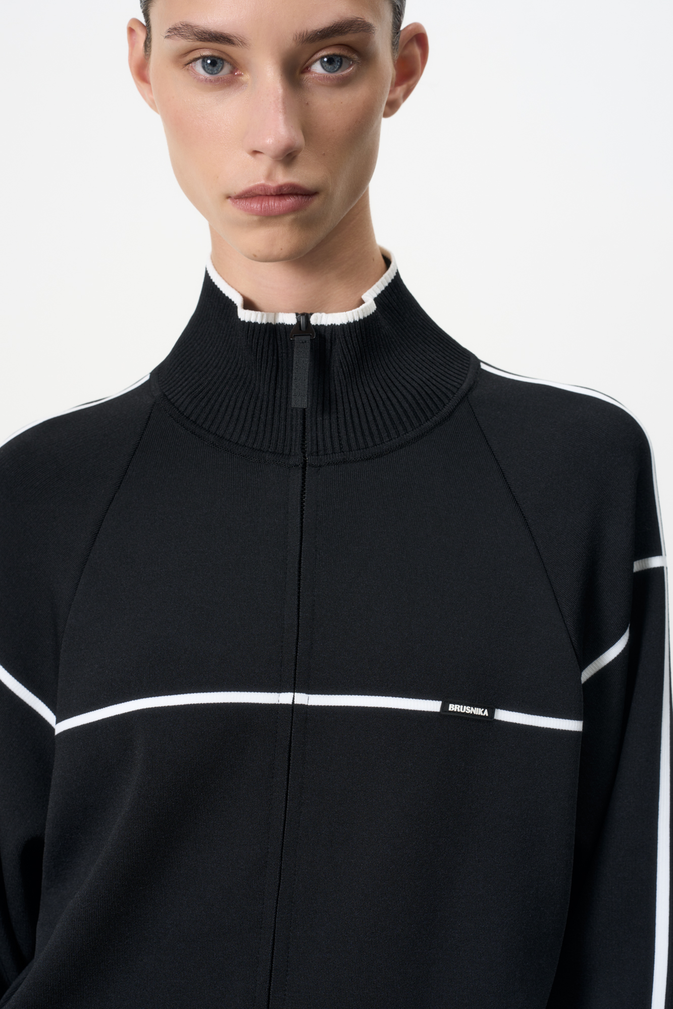 Вискозный трикотажный бомбер спортивного стиля с контрастными лампасами. Модель прямого кроя с длинными рукавами, манжетами на эластичной резинке и воротником-стойкой. По низу изделия предусмотрена регулируемая кулиска. Застежка на молнию.