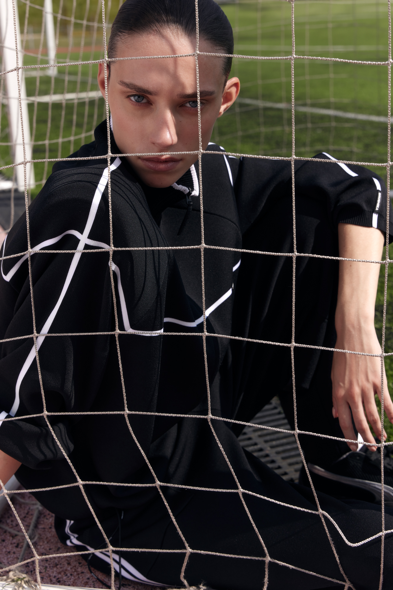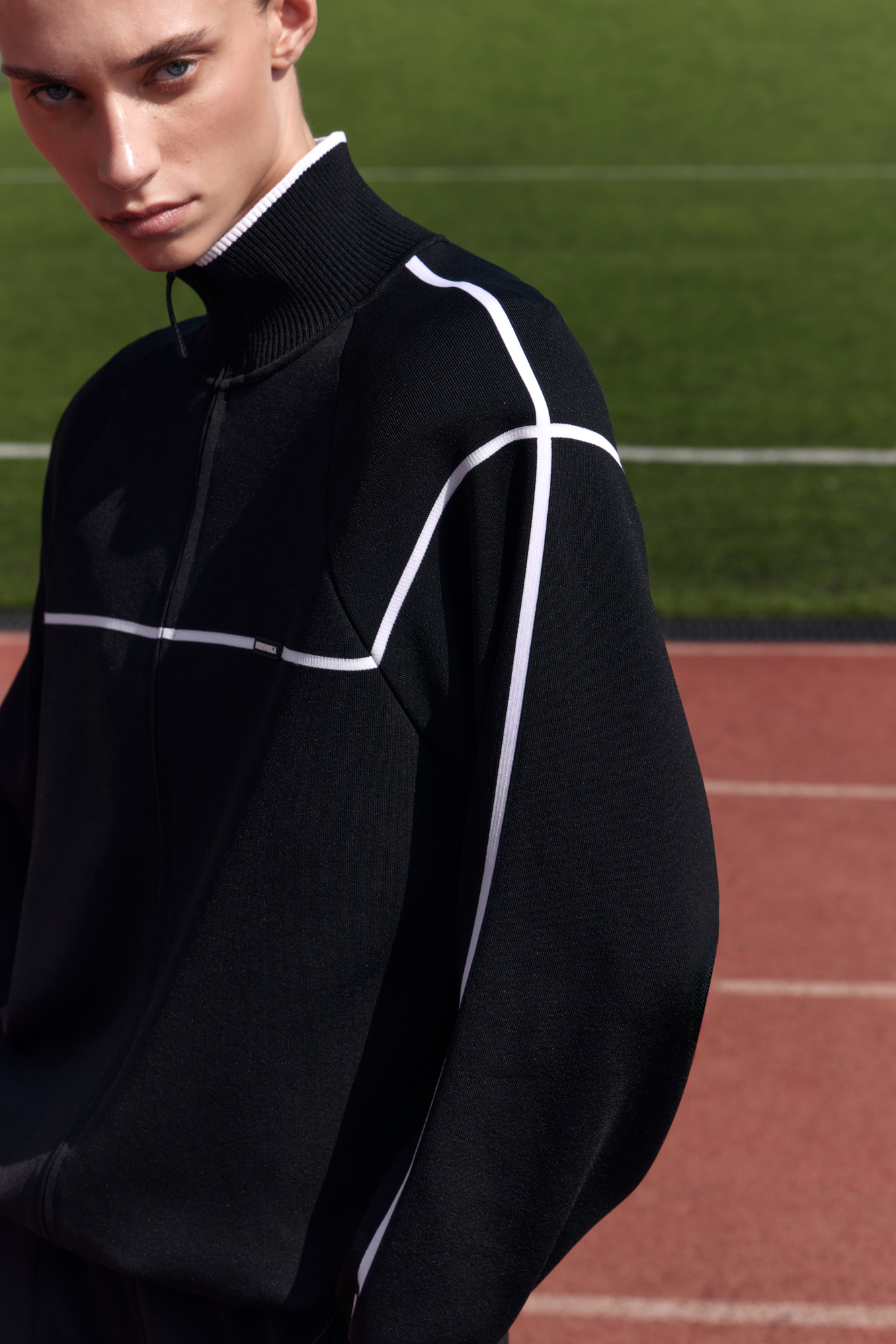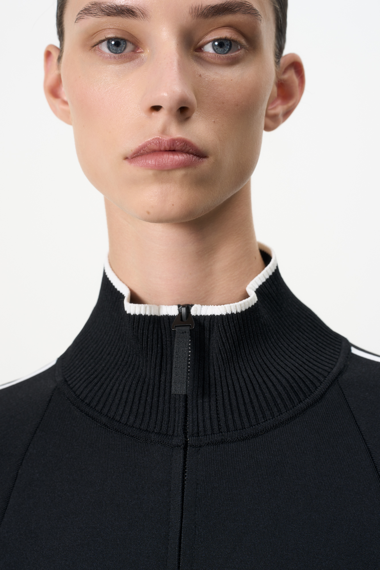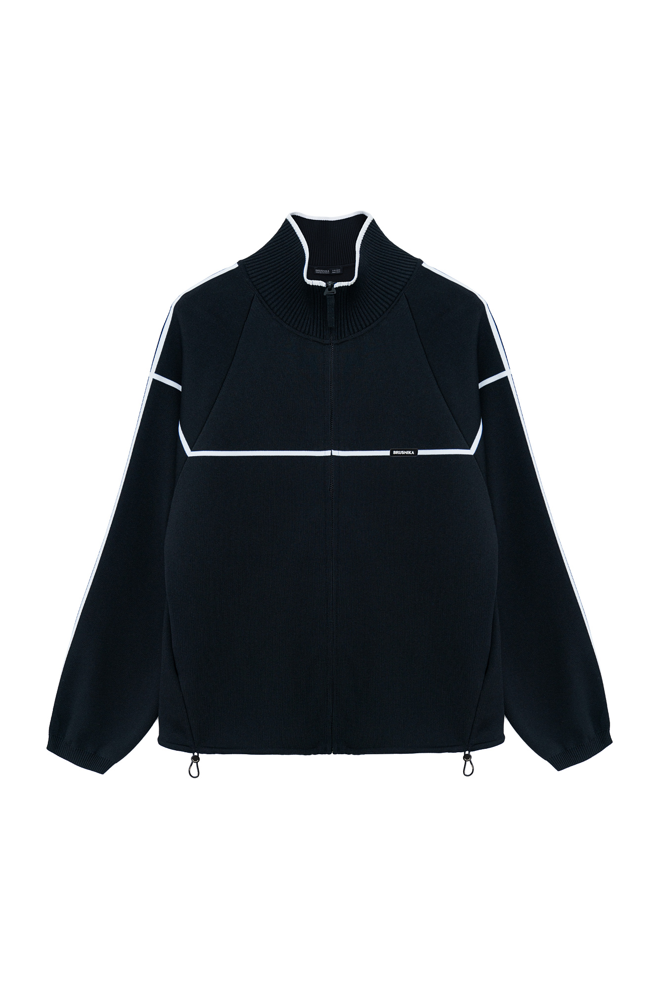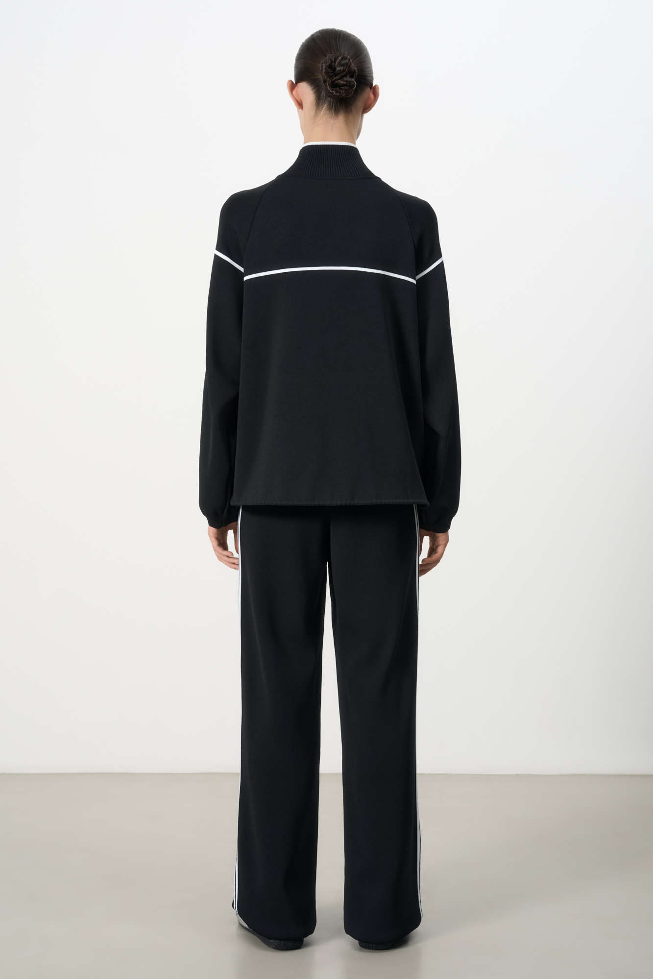 Вискозный трикотажный бомбер спортивного стиля с контрастными лампасами. Модель прямого кроя с длинными рукавами, манжетами на эластичной резинке и воротником-стойкой. По низу изделия предусмотрена регулируемая кулиска. Застежка на молнию.