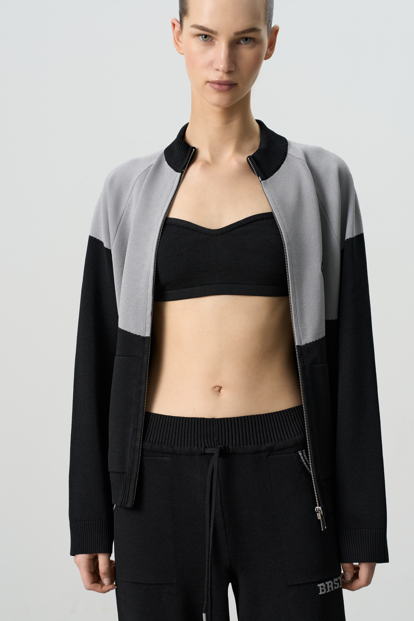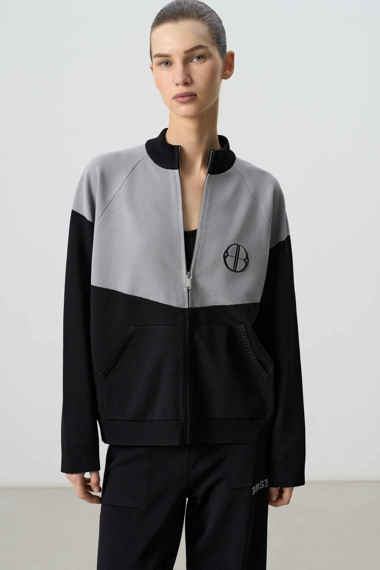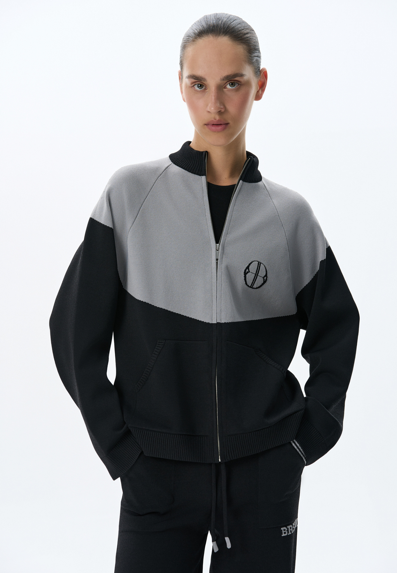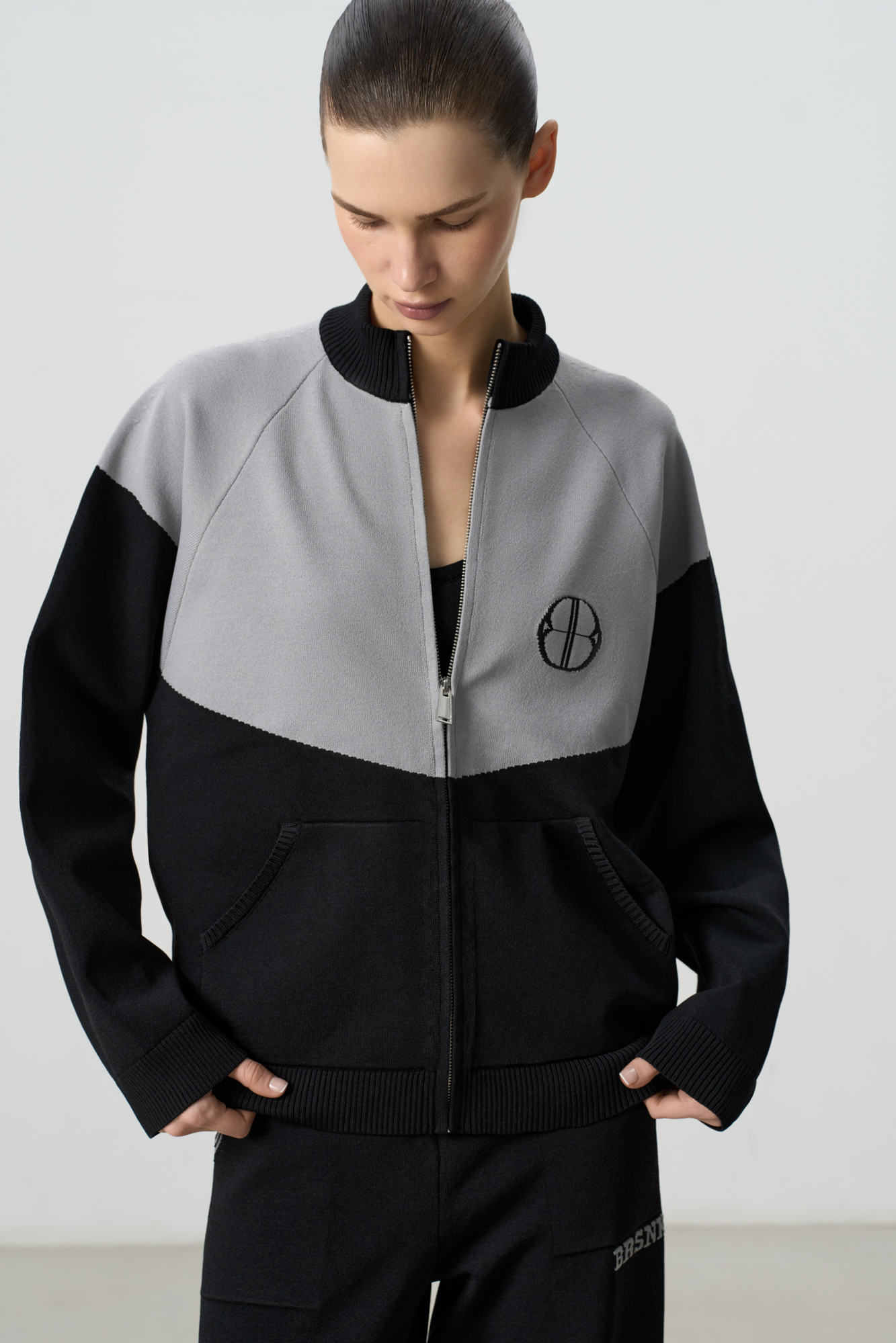 Трикотажный бомбер из вискозы с добавлением эластана. Модель прямого силуэта, с рукавом реглан, невысоким воротником-стойкой и боковыми карманами. Изделие декорировано брендированным жаккардом на груди. Застежка на молнию.