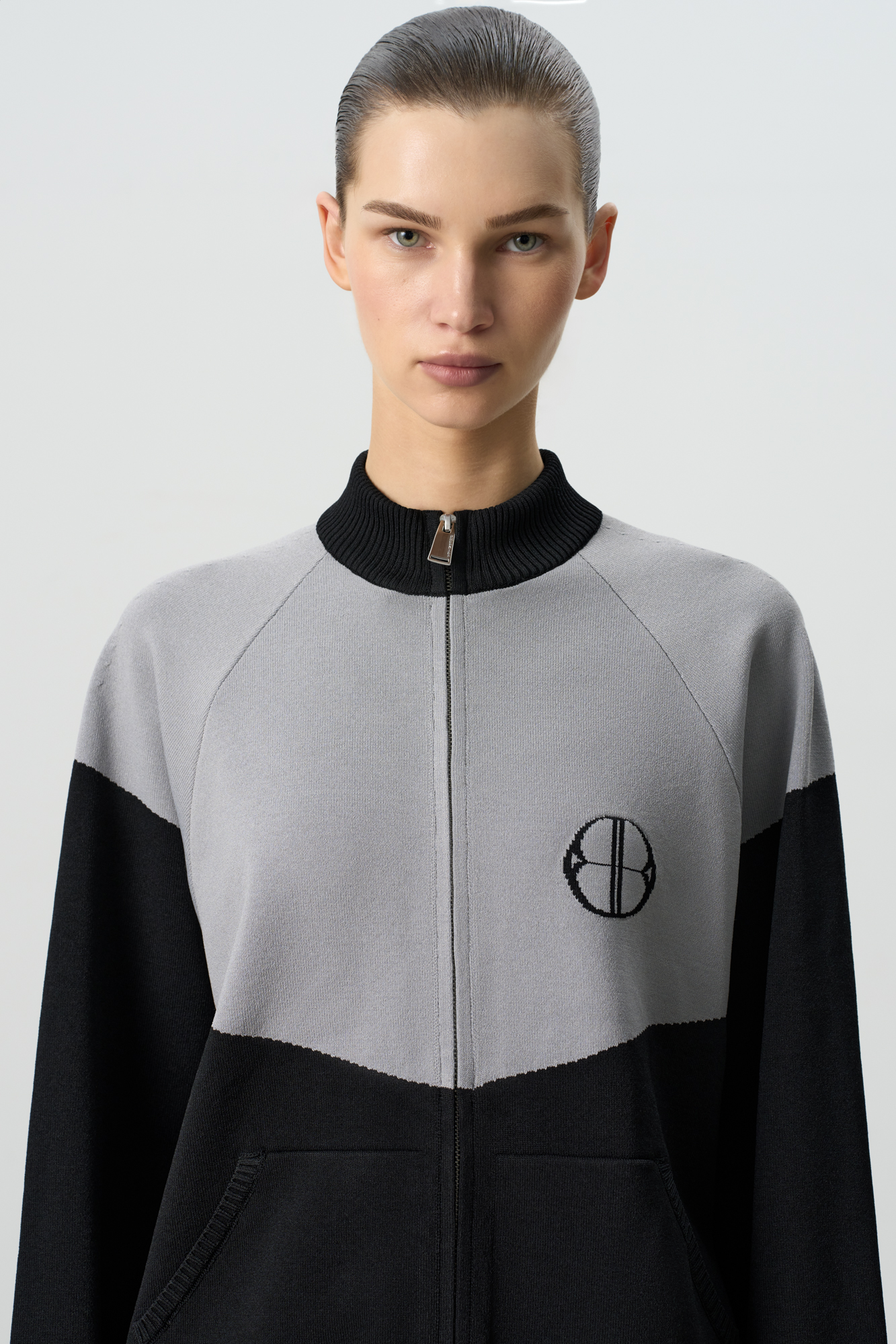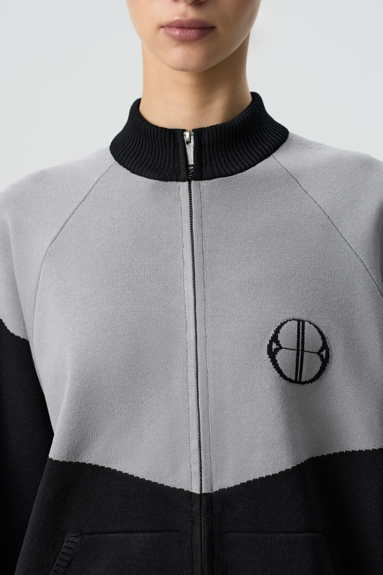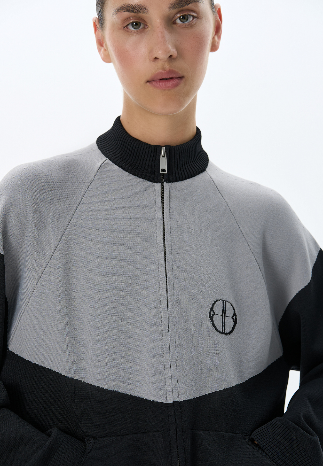 Трикотажный бомбер из вискозы с добавлением эластана. Модель прямого силуэта, с рукавом реглан, невысоким воротником-стойкой и боковыми карманами. Изделие декорировано брендированным жаккардом на груди. Застежка на молнию.