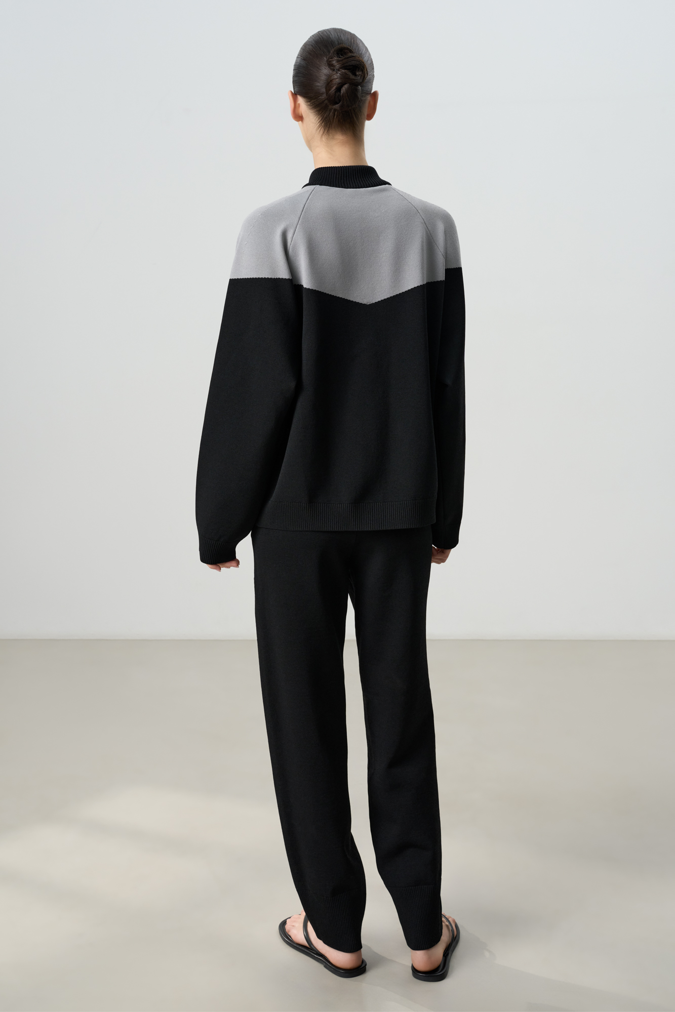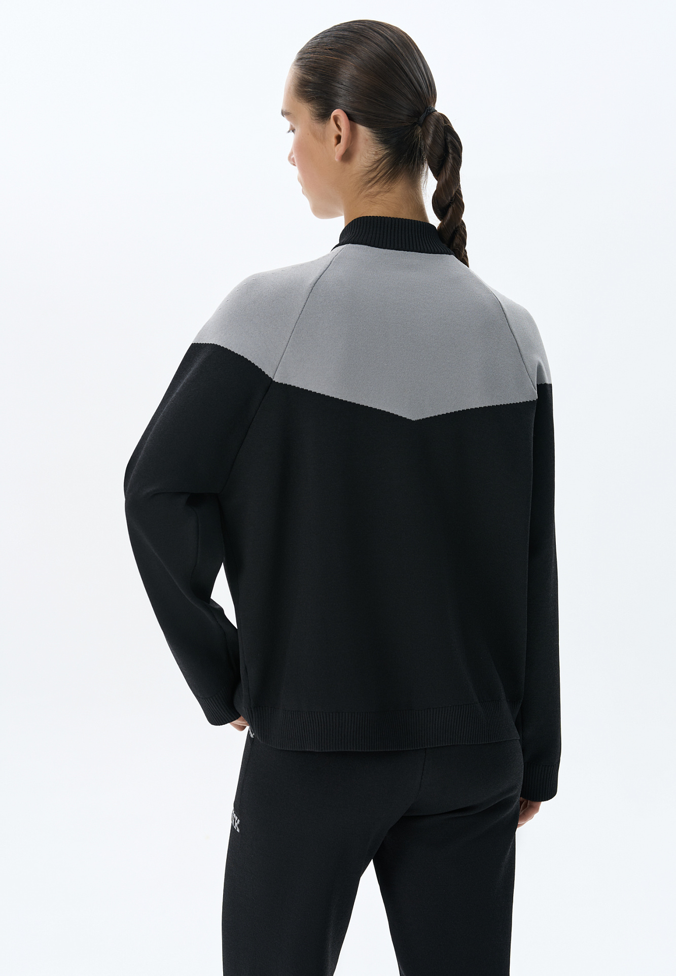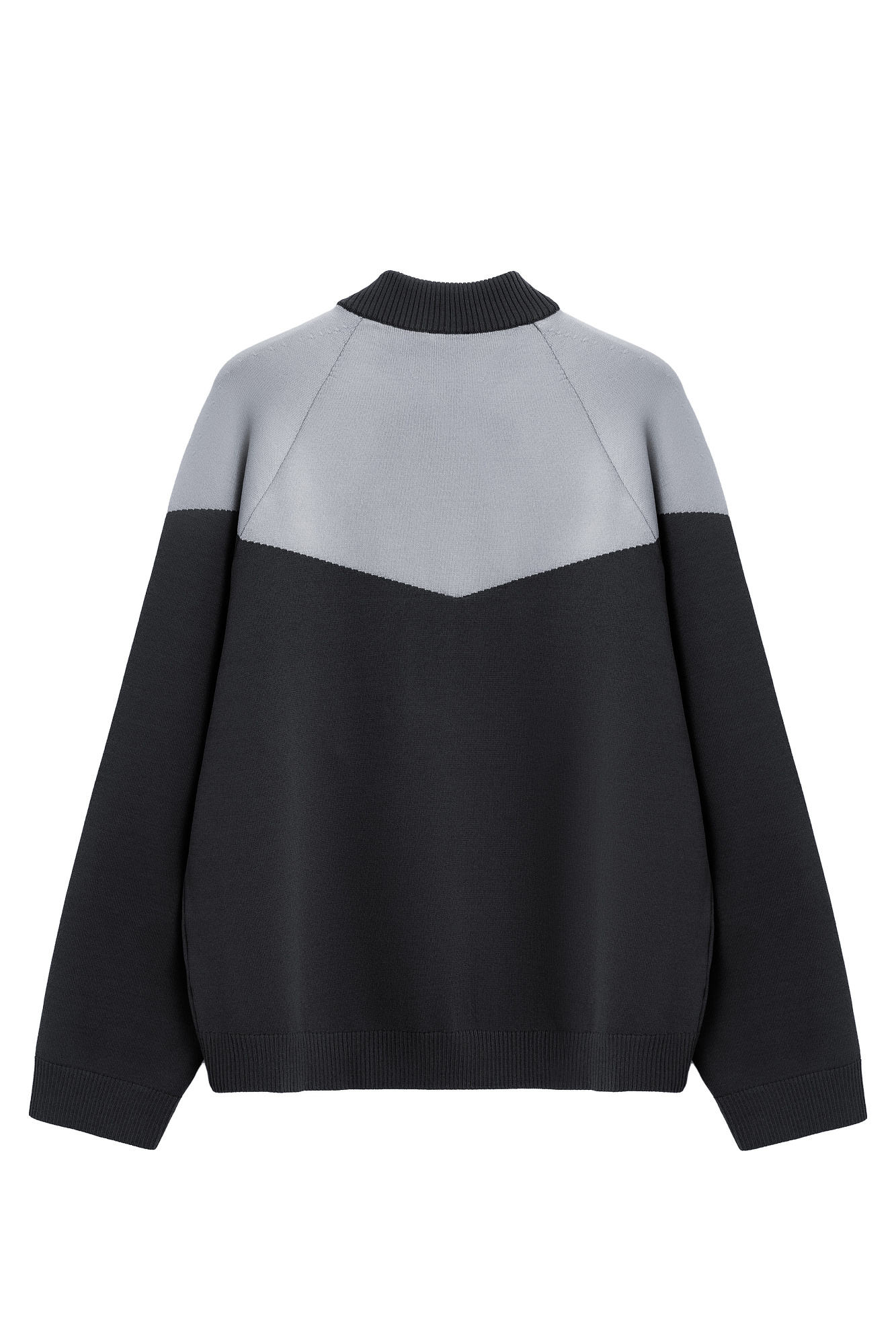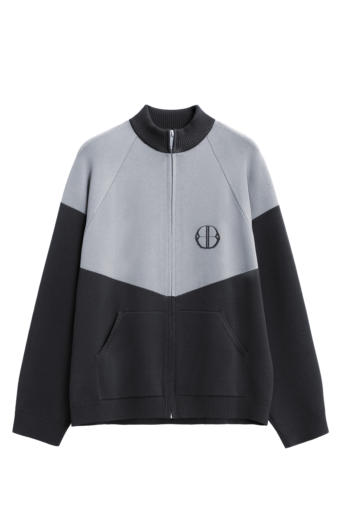 Трикотажный бомбер из вискозы с добавлением эластана. Модель прямого силуэта, с рукавом реглан, невысоким воротником-стойкой и боковыми карманами. Изделие декорировано брендированным жаккардом на груди. Застежка на молнию.