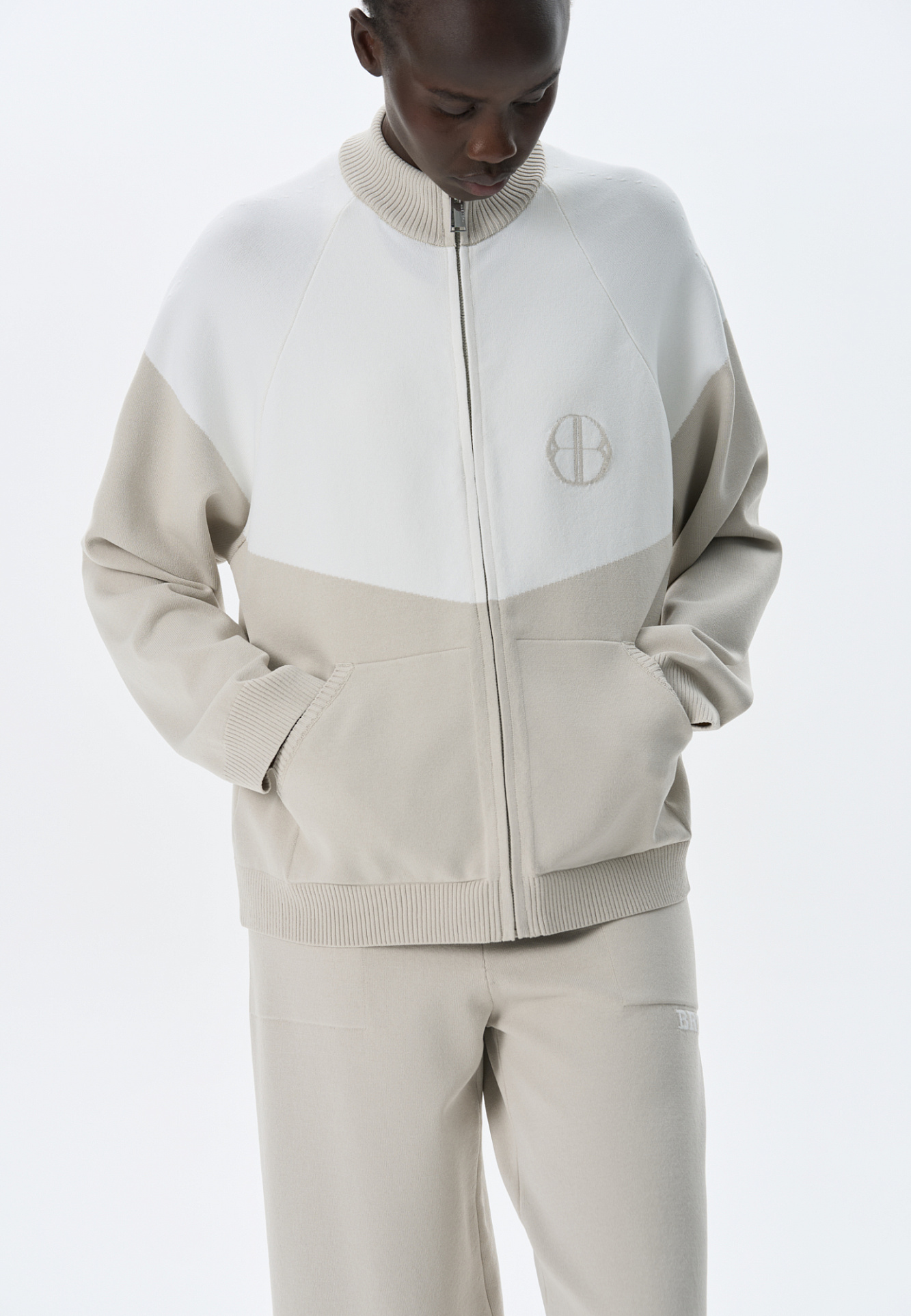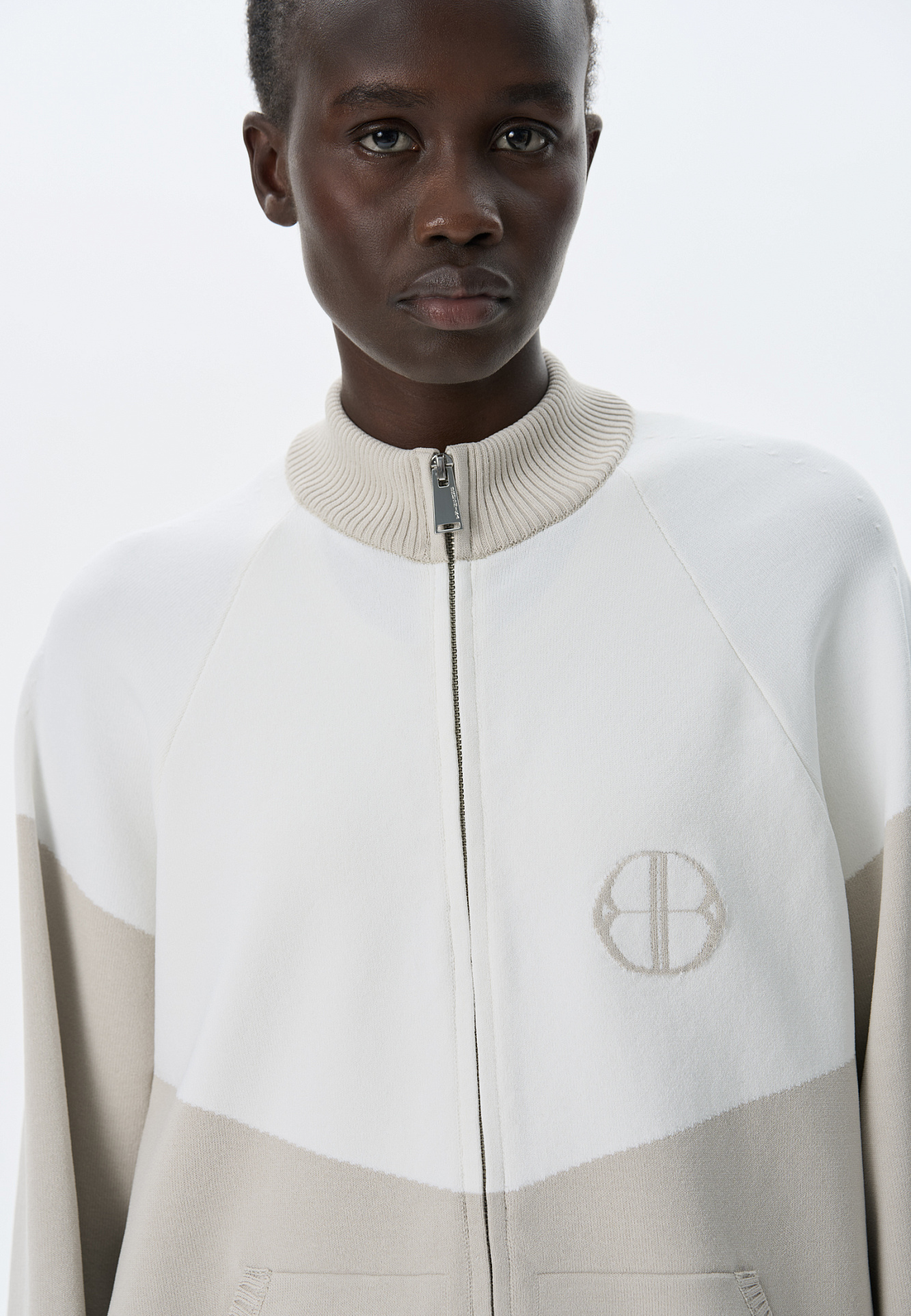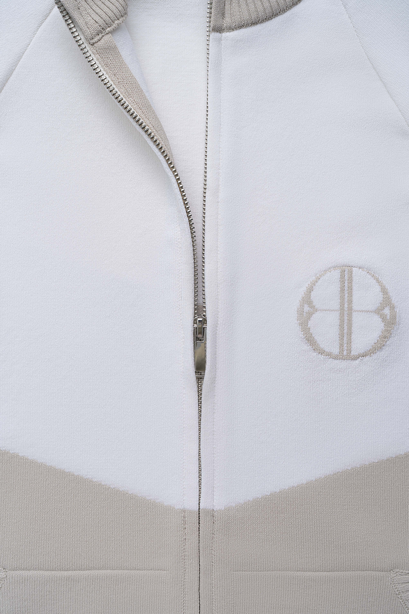 Трикотажный бомбер из вискозы с добавлением эластана. Модель прямого силуэта, с рукавом реглан, невысоким воротником-стойкой и боковыми карманами. Изделие декорировано брендированным жаккардом на груди. Застежка на молнию.
