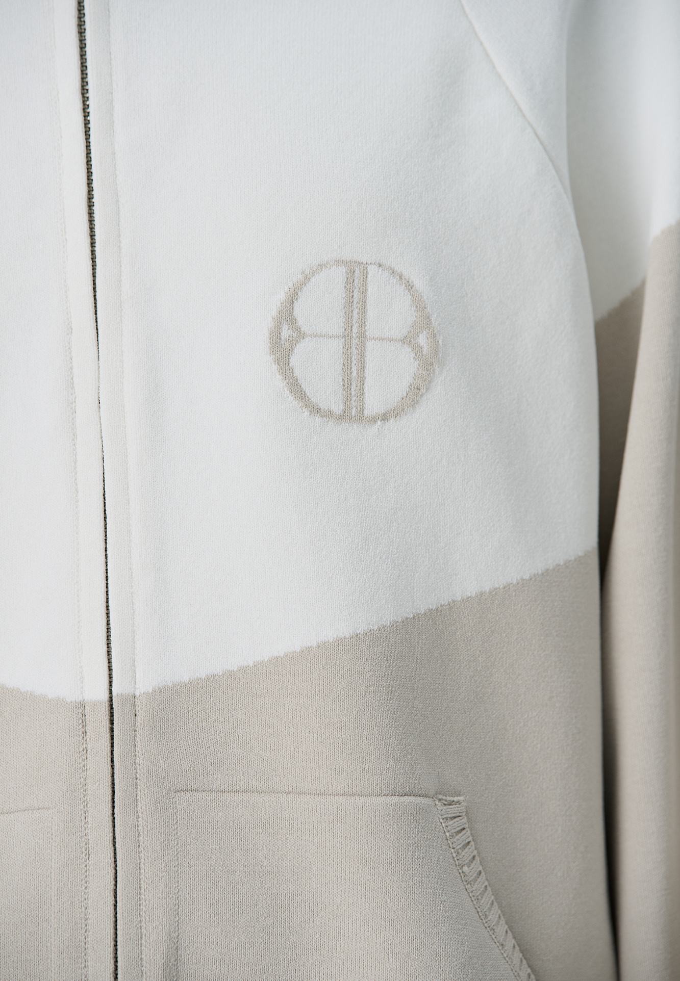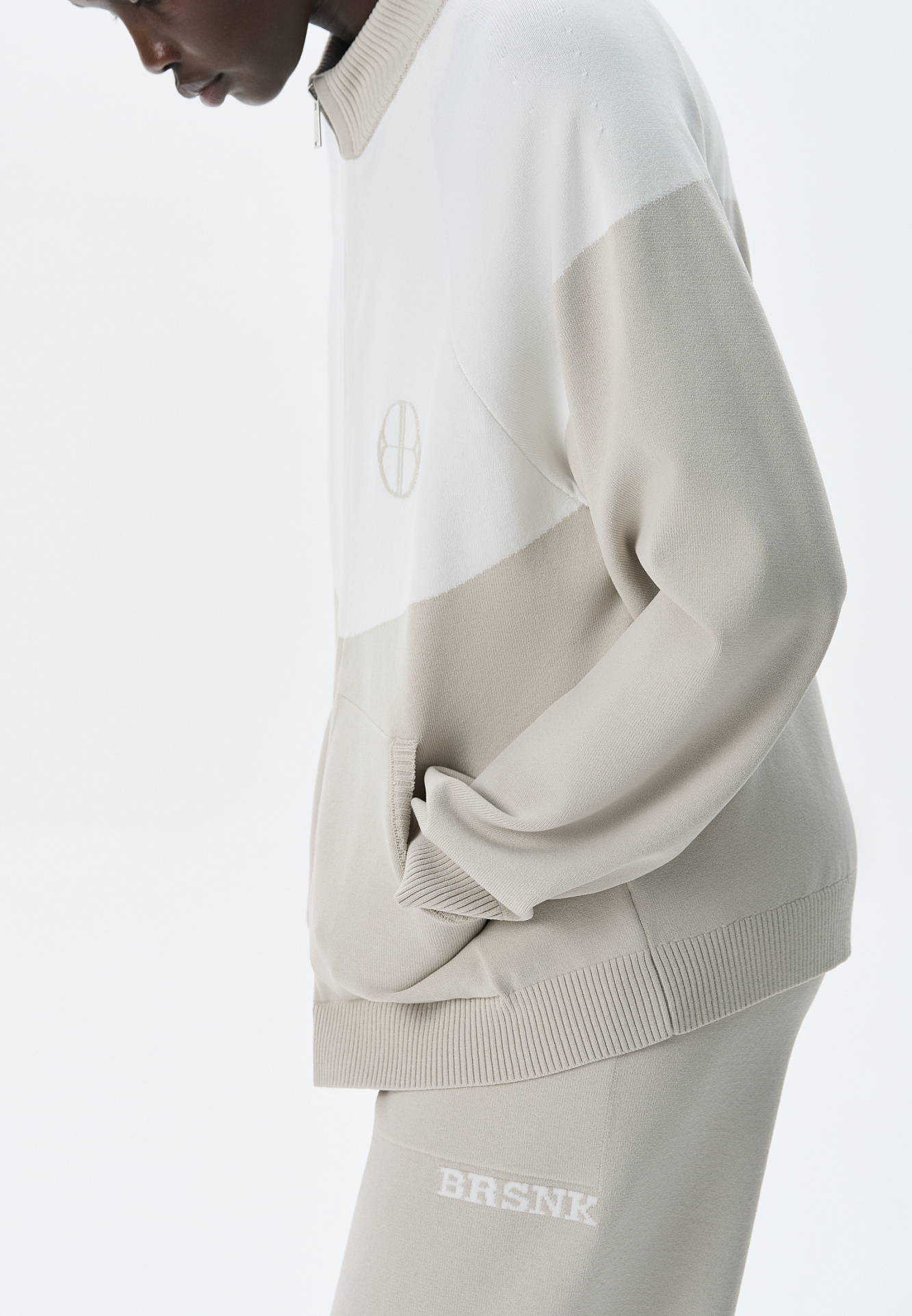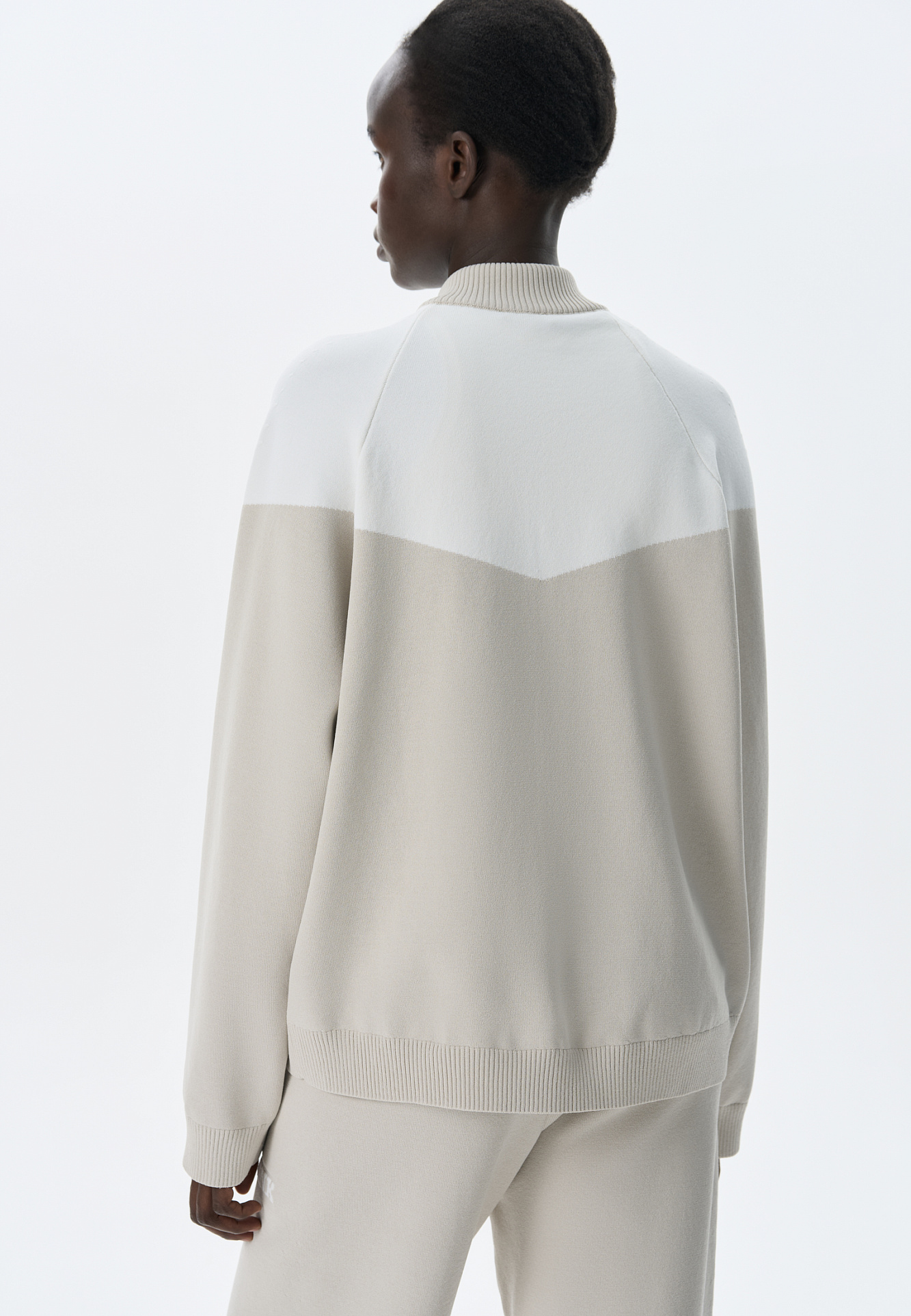 Трикотажный бомбер из вискозы с добавлением эластана. Модель прямого силуэта, с рукавом реглан, невысоким воротником-стойкой и боковыми карманами. Изделие декорировано брендированным жаккардом на груди. Застежка на молнию.