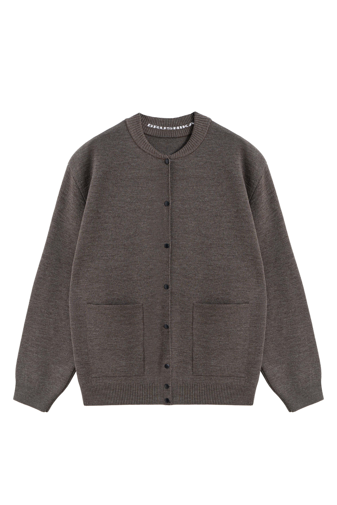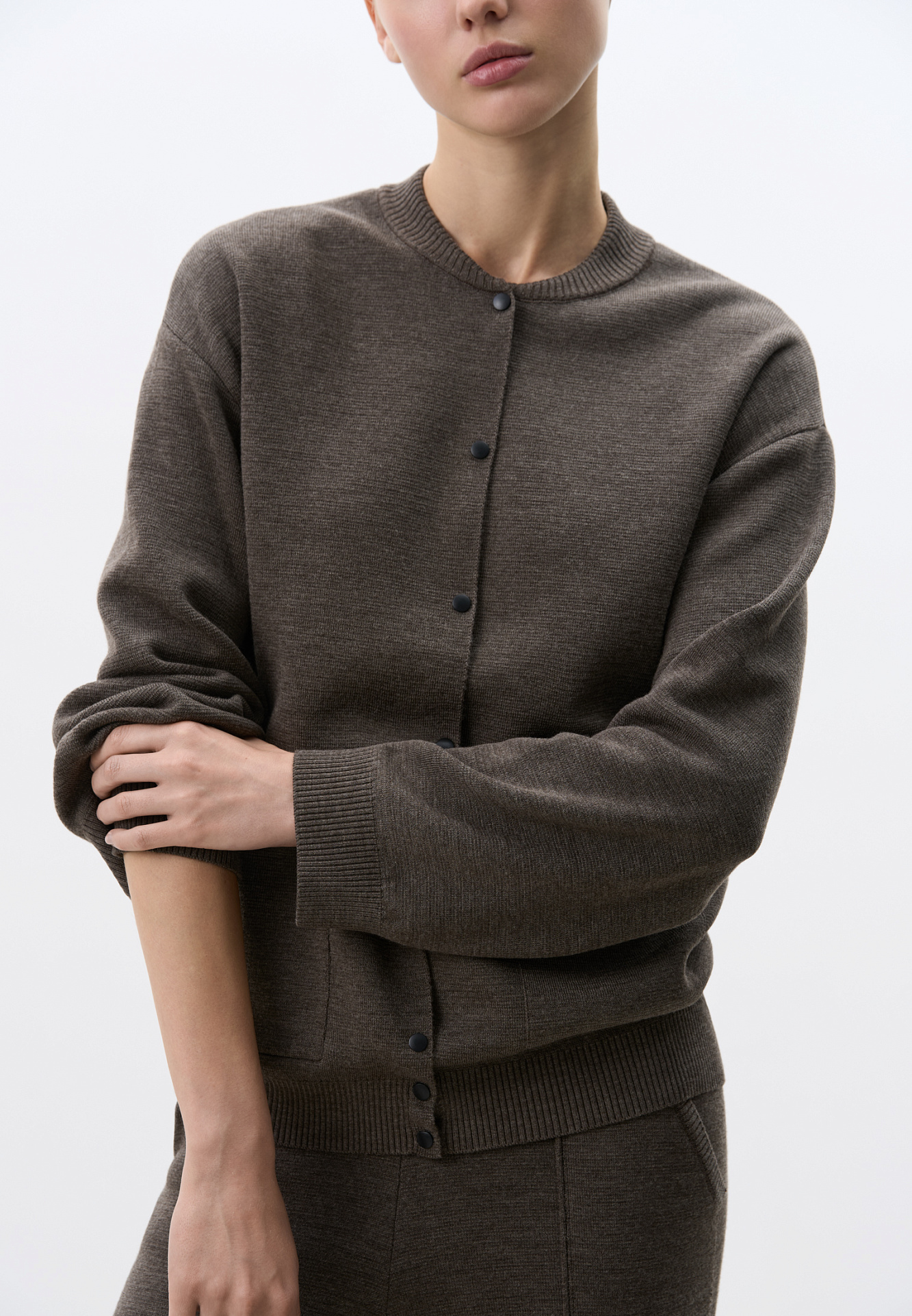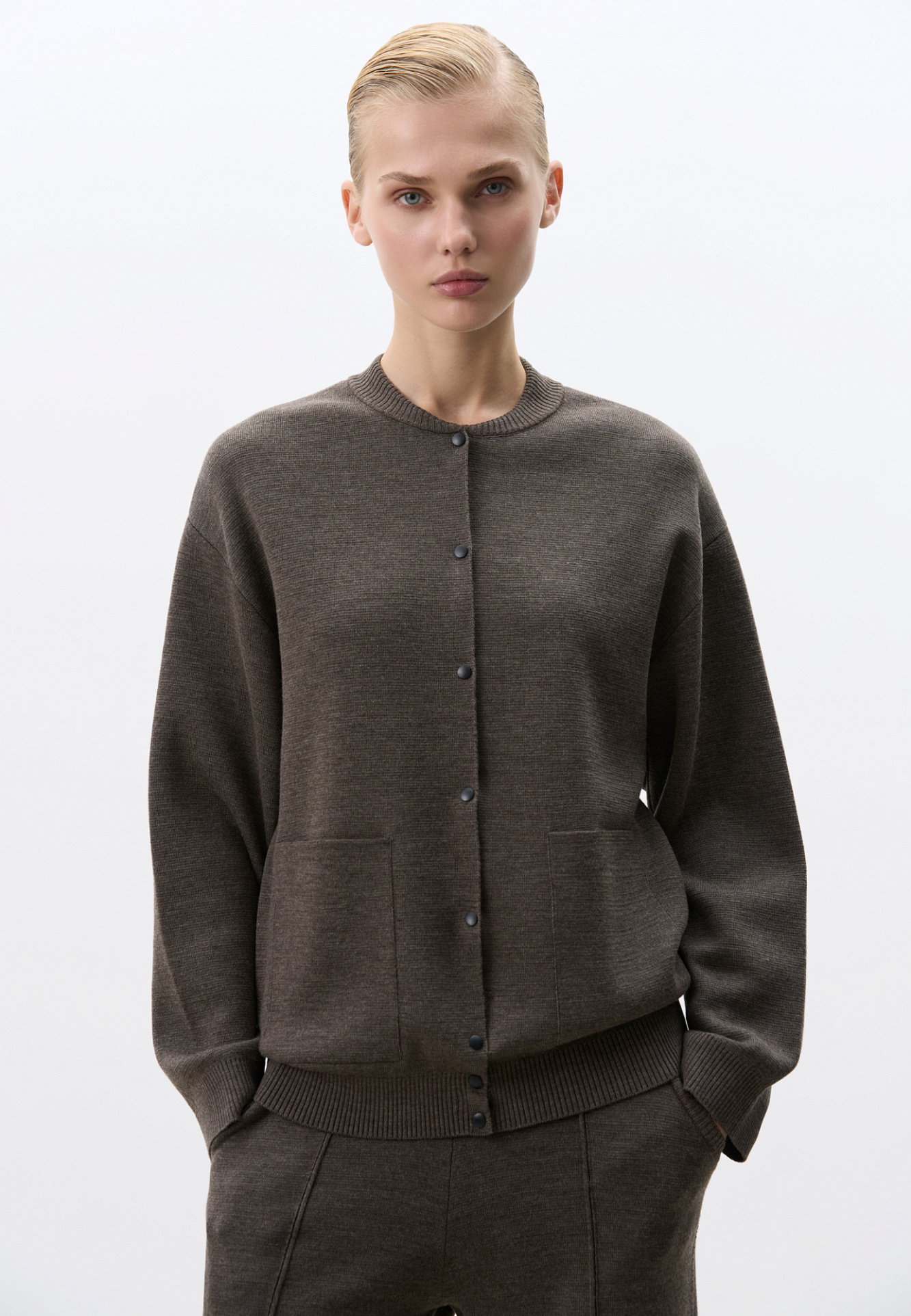 Трикотажный бомбер, в основе из шерсти мериноса. Модель свободного силуэта с накладными карманами и спущенным рукавом. Застежка на кнопки.