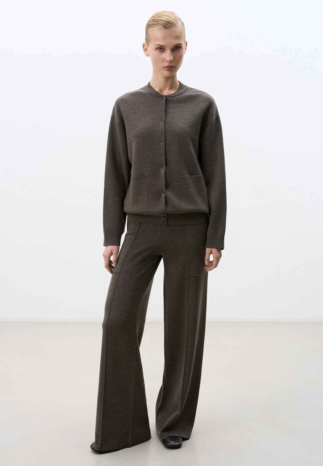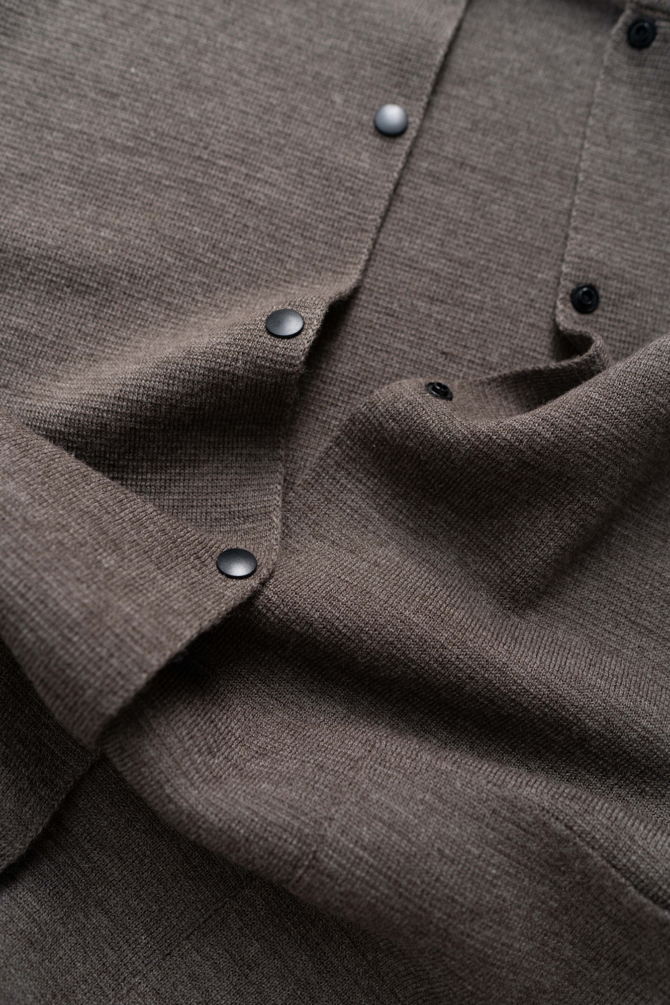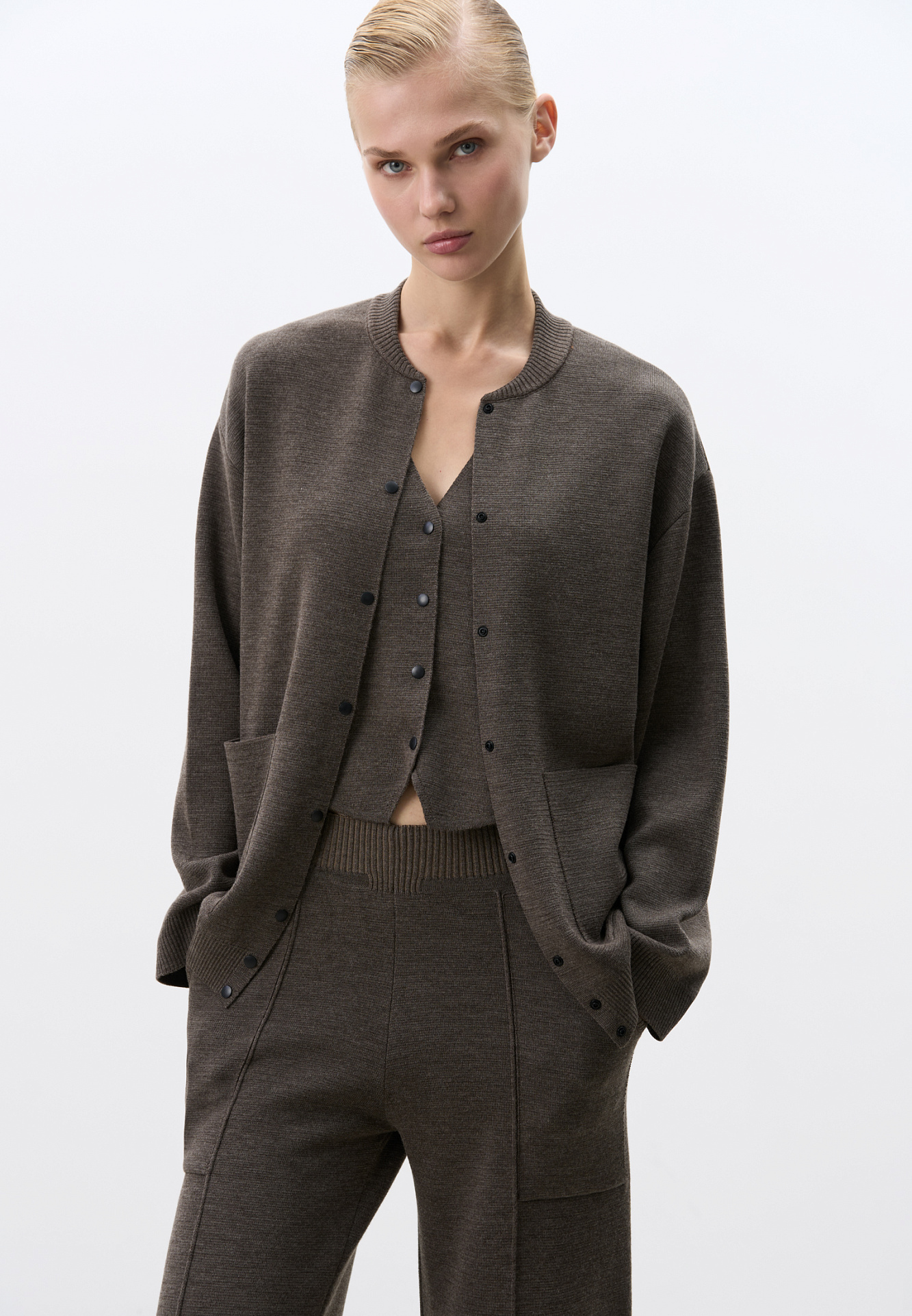 Трикотажный бомбер, в основе из шерсти мериноса. Модель свободного силуэта с накладными карманами и спущенным рукавом. Застежка на кнопки.